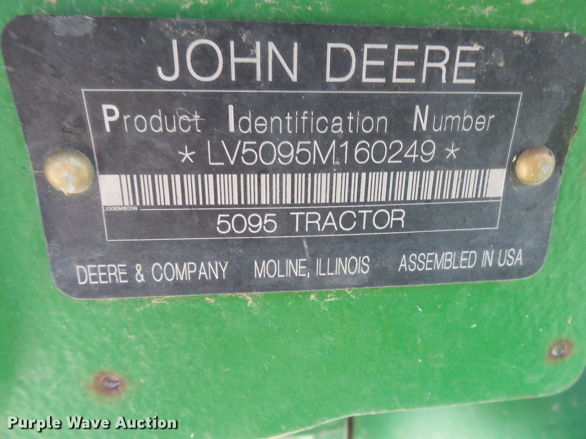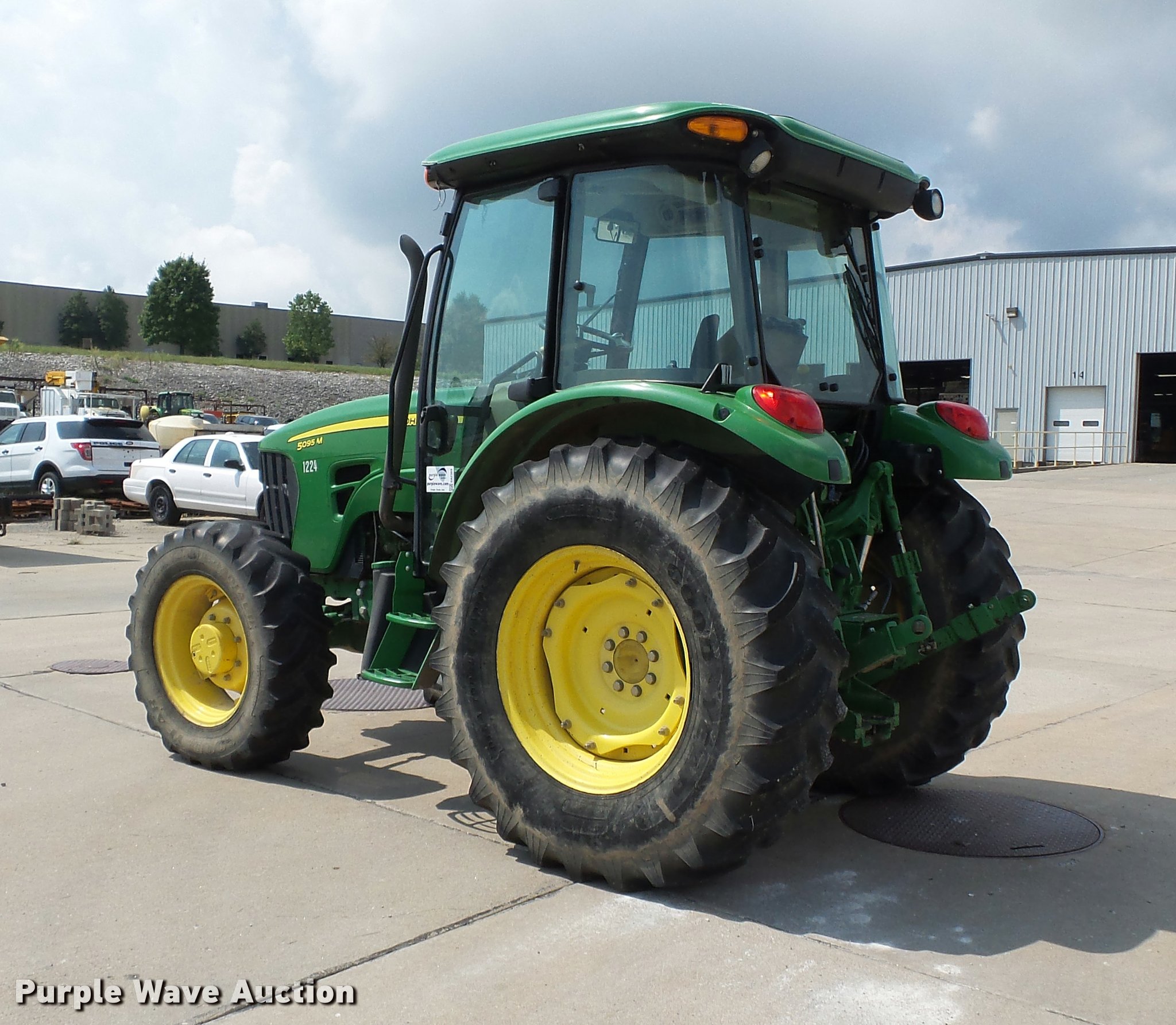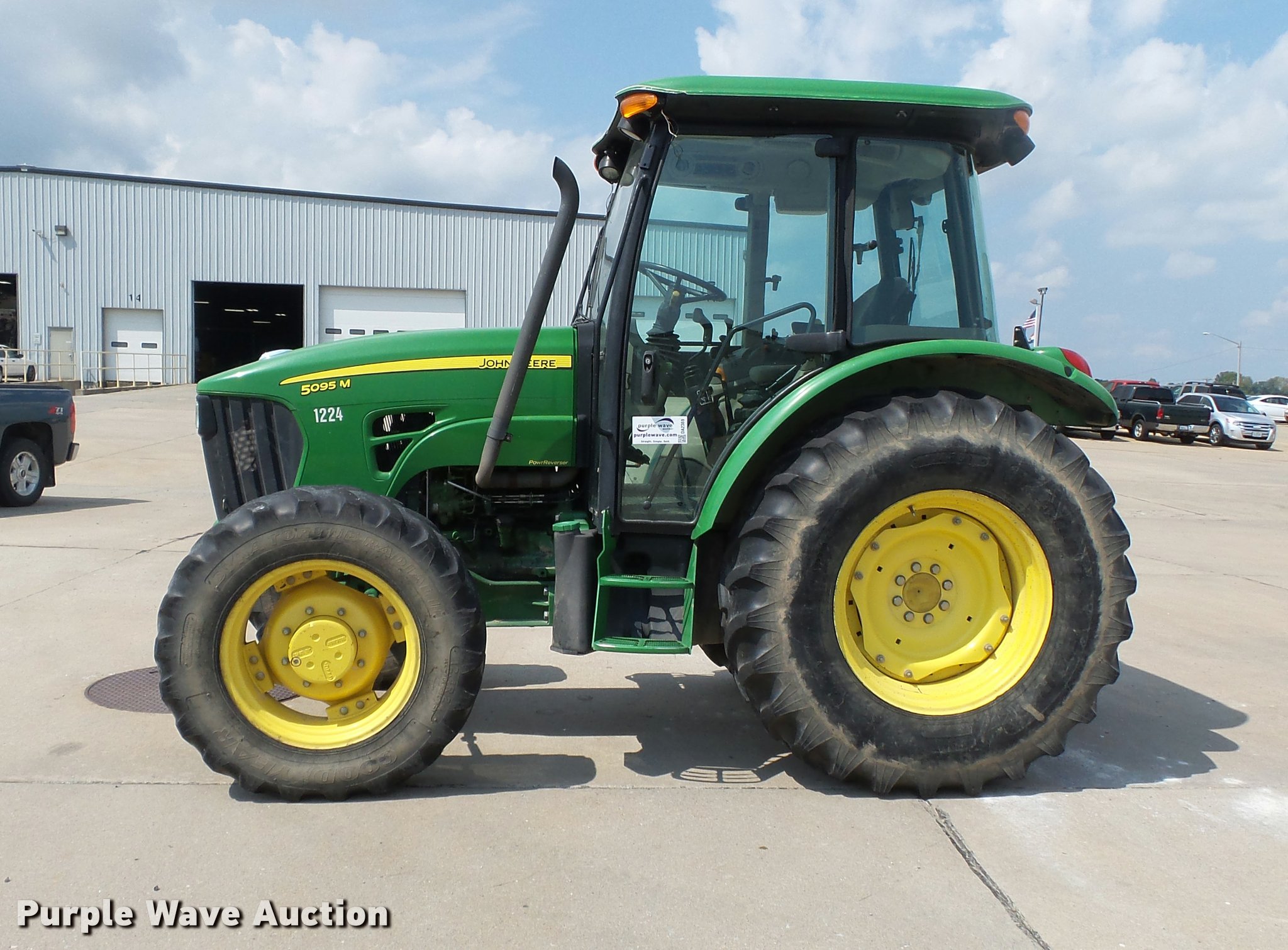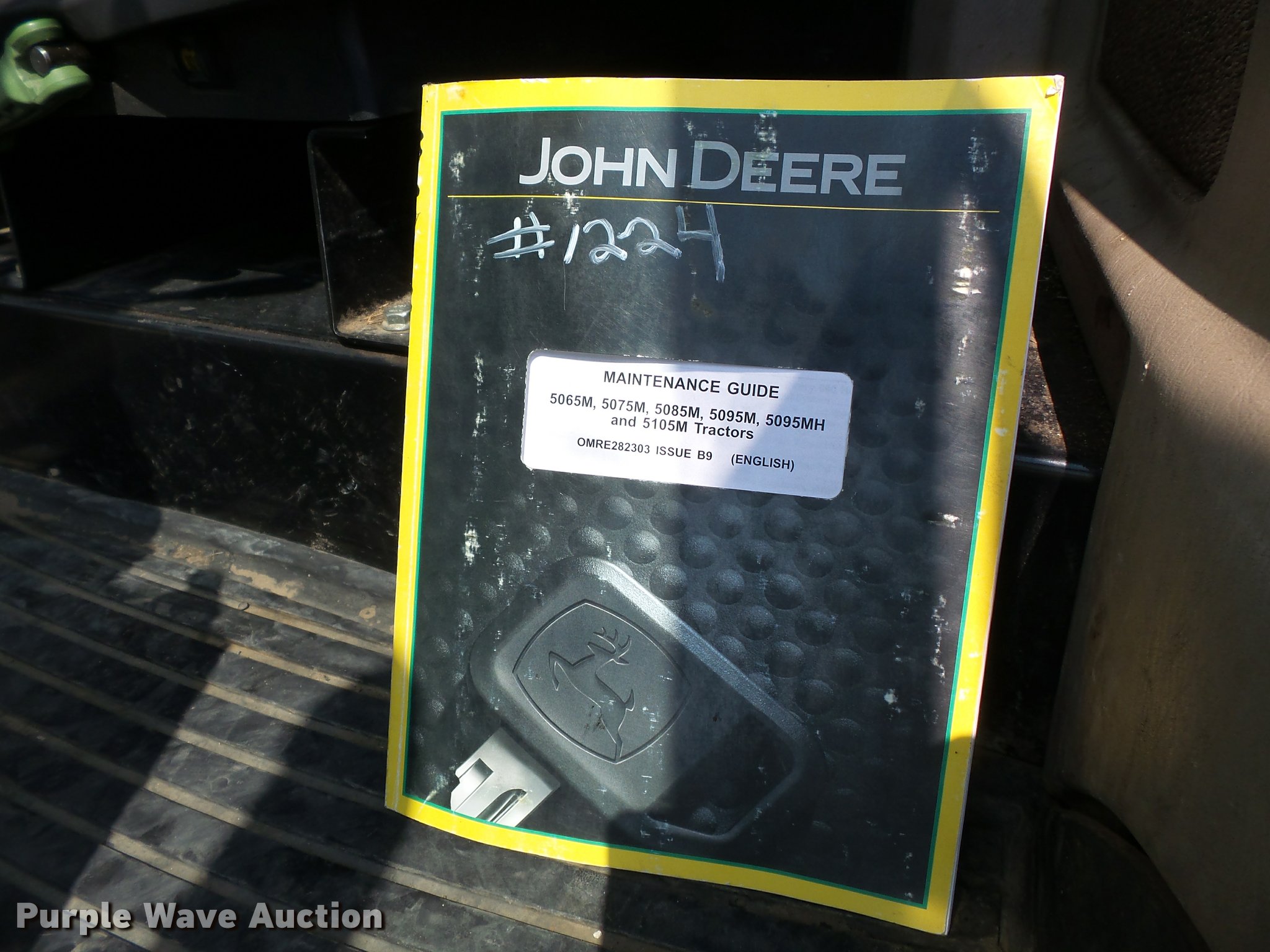 Purple Wave is selling a used Tractor in Missouri. This item is a 2009 John Deere 5095M MFWD tractor with the following: 4,400 hours on meter, John Deere 4045HL52 4.5L four cylinder diesel engine, Power reverser transmission, 4F-4R gears, Left-hand reverser, Differential lock, AC and heat, Tilt steering wheel, Suspension seat, Visor, Three point, Seven pin outlet, 540 PTO, Front hydraulic remote set, Joystick controls, (2) rear hydraulic remotes, 85.6" wheelbase, 12.4R24 front tires, 18.4-30 rear tires, Maintenance manual, No draw bar, Exhaust pipe bent, Serial LV5095M160249, Unit# 1224