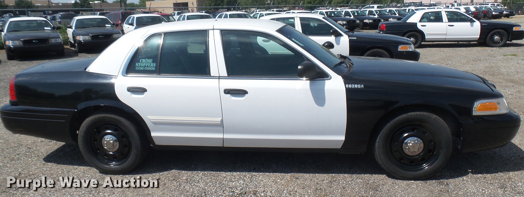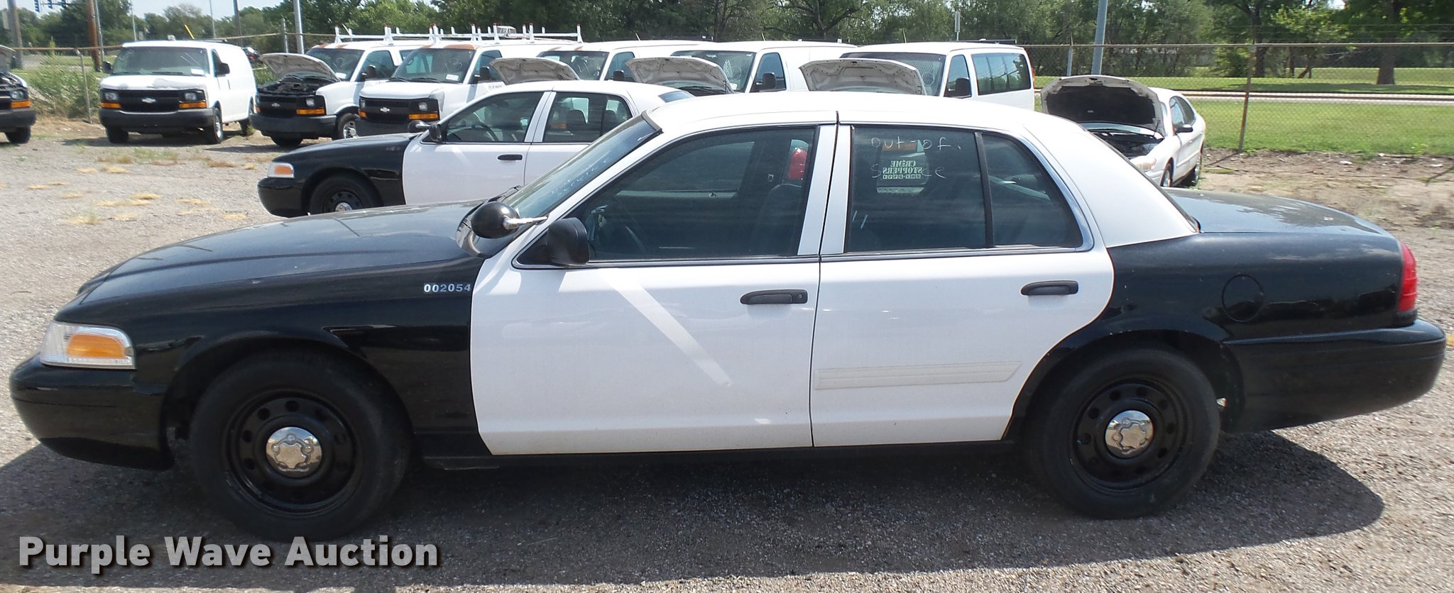 Purple Wave is selling a used Passenger Vehicle in Kansas. This item is a 2009 Ford Crown Victoria Police Interceptor with the following: 115,756 miles on odometer, 4.6L V8 SOHC 16V FFV gas engine, Automatic transmission, AC and heat, Tilt, AM/FM, Power windows, locks, and mirrors, Cloth front interior, Vinyl rear interior, P235/55R17 tires, Port holes in roof and trunk, Hail damage, Unit# 2054
