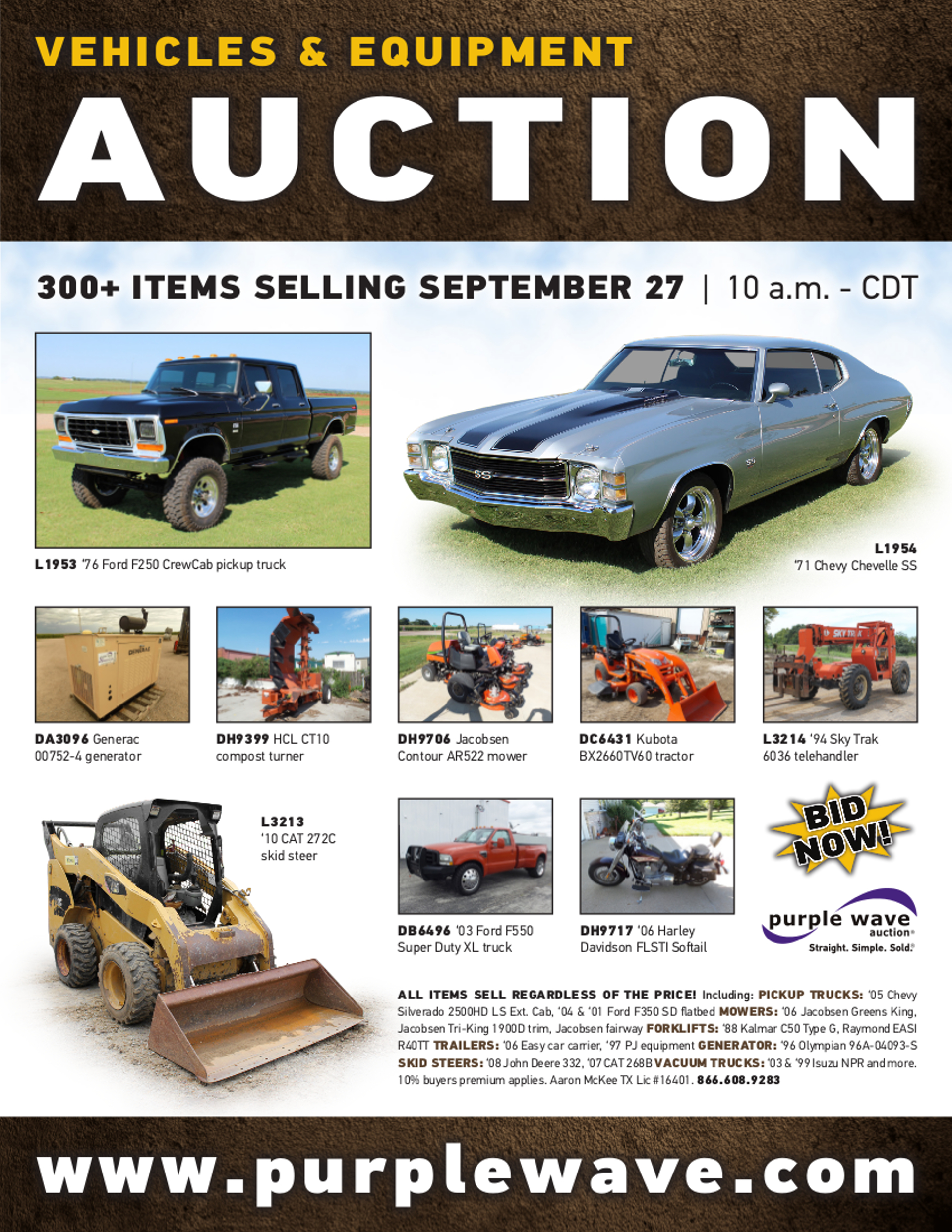 This auction is conducted by Purple Wave, Inc., whose home office is 825 Levee Drive, Manhattan, Kansas. Aaron McKee, Texas auctioneer license # 16401, operates Purple Wave, Inc. Complaints against us may be directed to the Texas Department of Licensing and Regulation, P.O. Box 12157, Austin, Texas 78711, (512) 463-6599. For additional required information, see the attached document.
