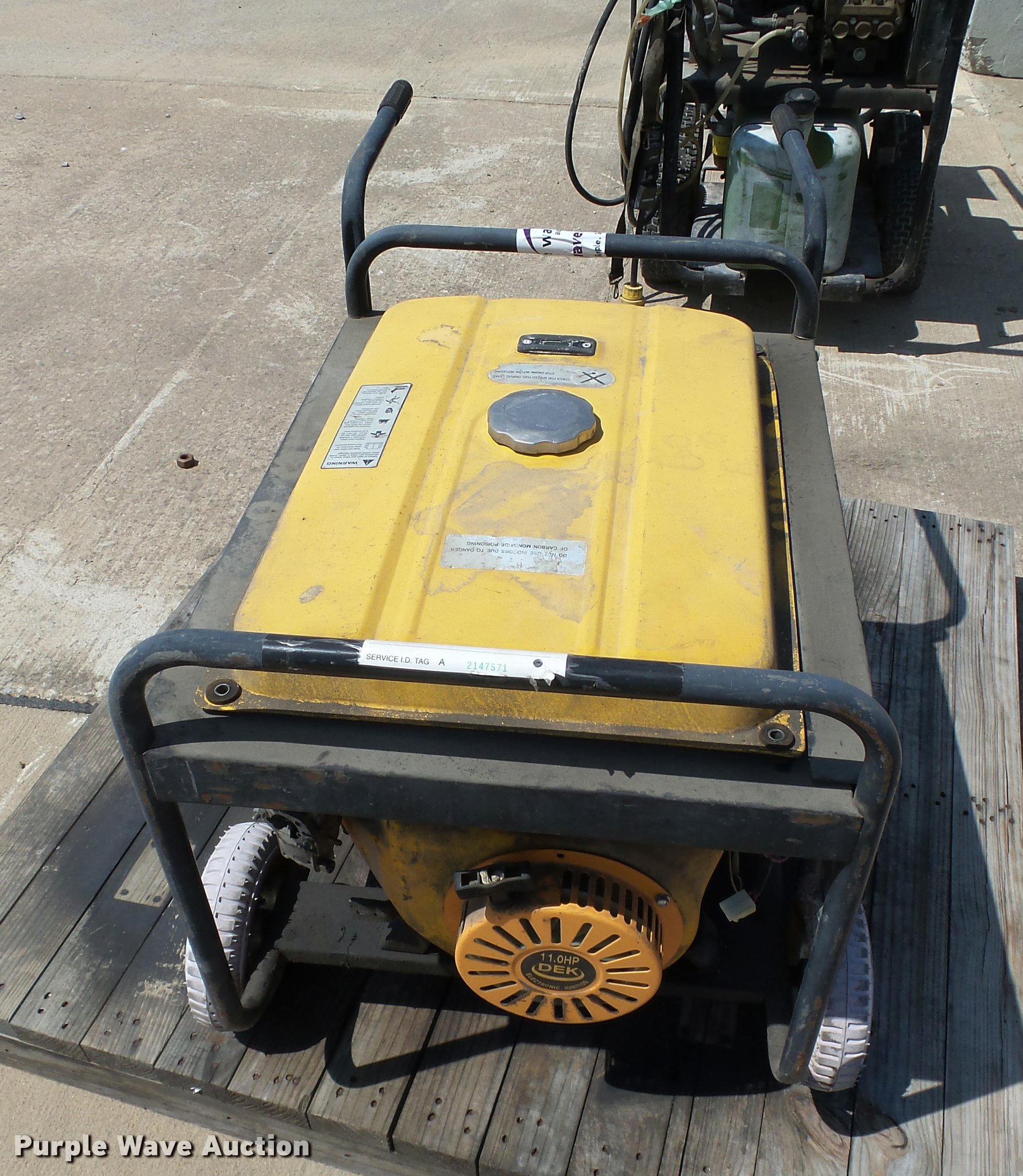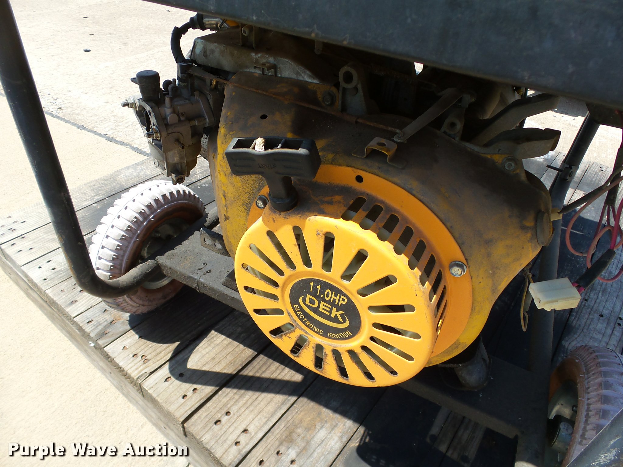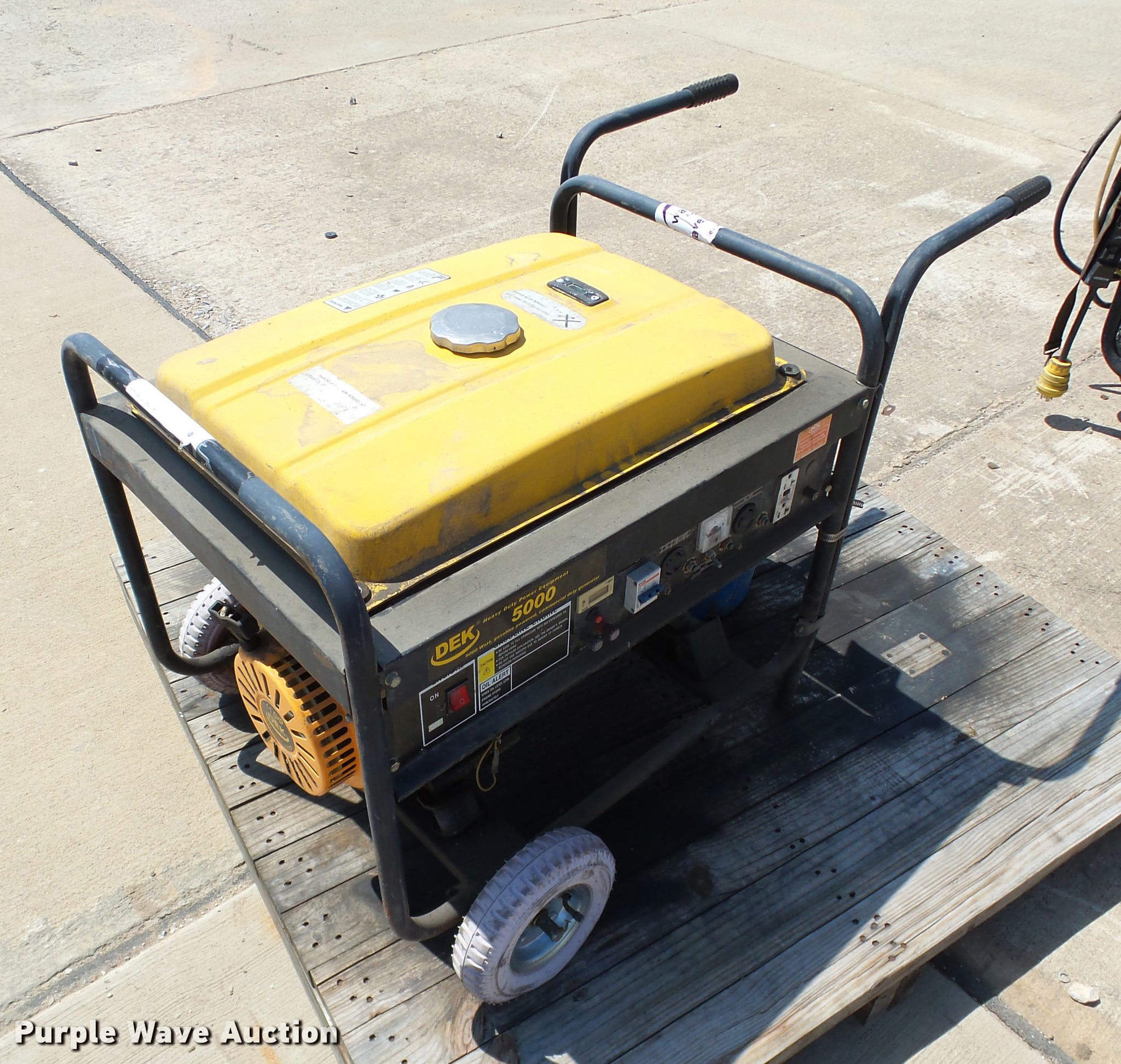 Purple Wave is selling a used Generator Set in Oklahoma. This item is a DEK 5000 generator with the following: 11 HP gas engine, 5,000 watt, Unknown operating condition, Unit# 2147571