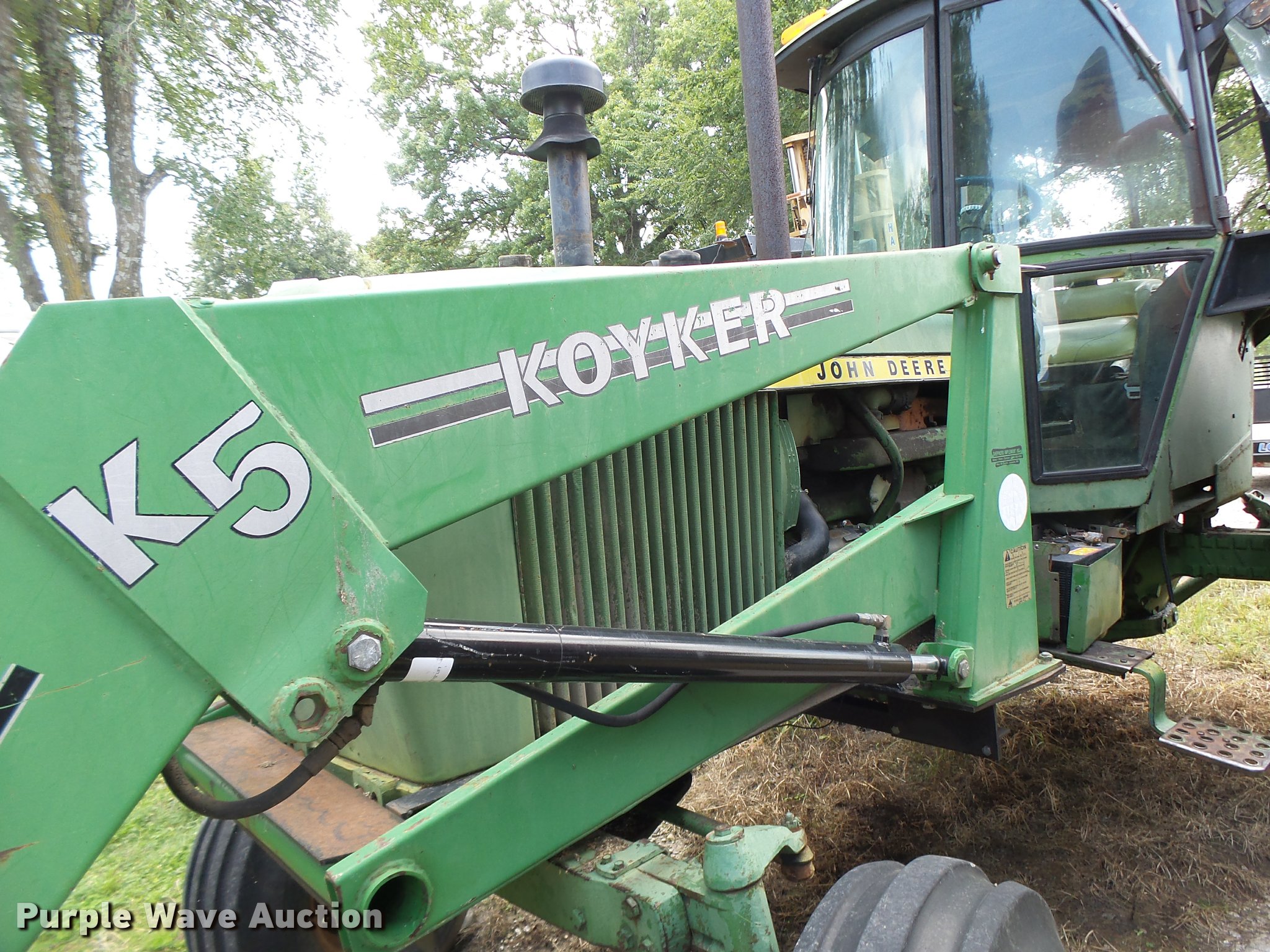 Purple Wave is selling a used Tractor in Missouri. This item is a John Deere 4230 tractor with the following: 6,926 hours on meter, John Deere six cylinder diesel engine, Manual transmission, 16F-8R gears, Suspension seat, Koyker K5 loader, 7'W bucket, Bale spear, Two-lever controls, Three point, 540 PTO, Hydraulic remotes, 11L-15SL front tires, 18.4-34 rear tires, Drive pump issues, low pressure, Dead battery, Glass broken