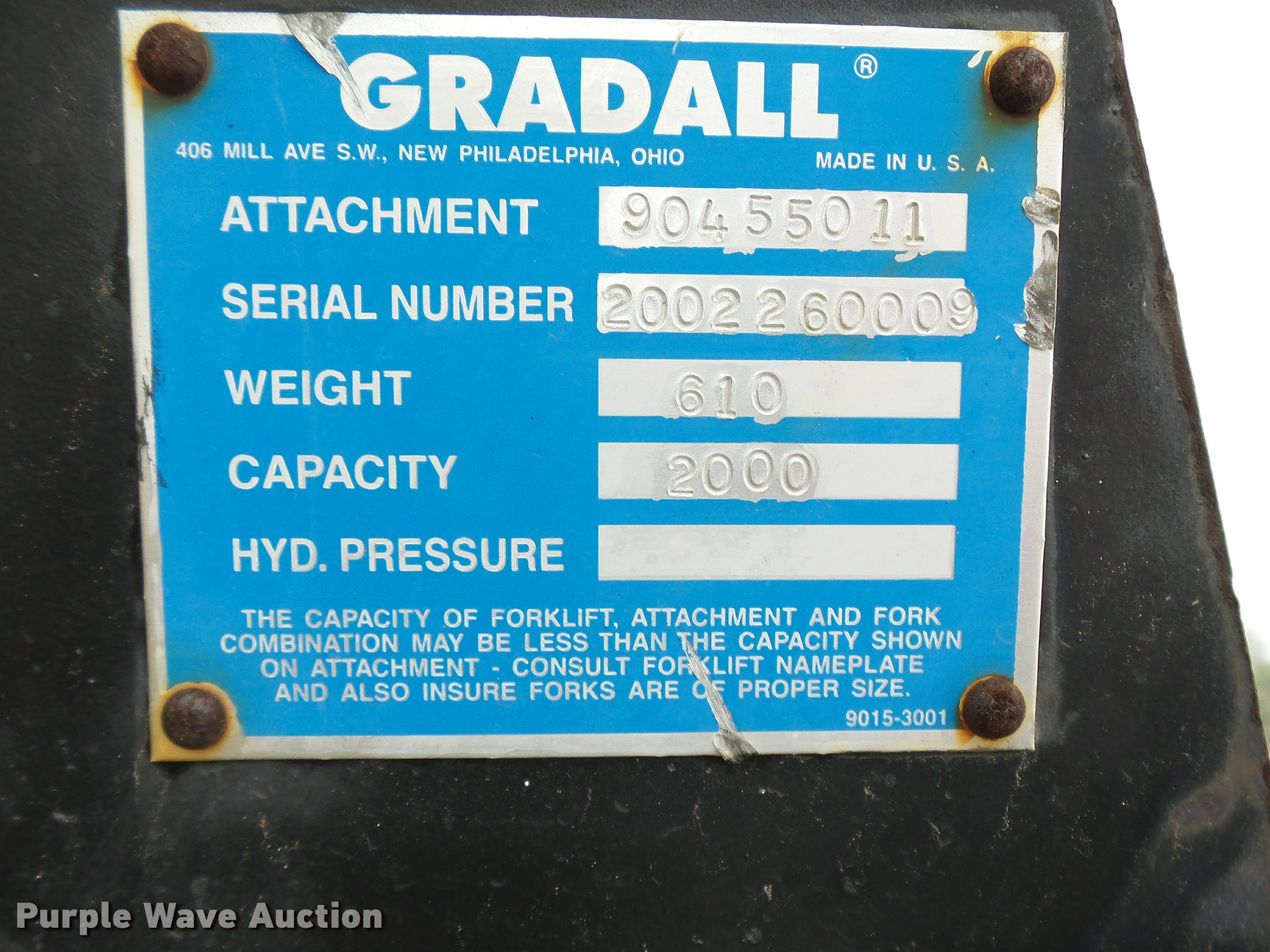 Purple Wave is selling a used Forklift Attach. in North Dakota. This item is a Gradall boom attachment with the following: Model 90455011, 118"L, 2,000 lbs capacity, 19.5" pin spacing, Serial 2002260009