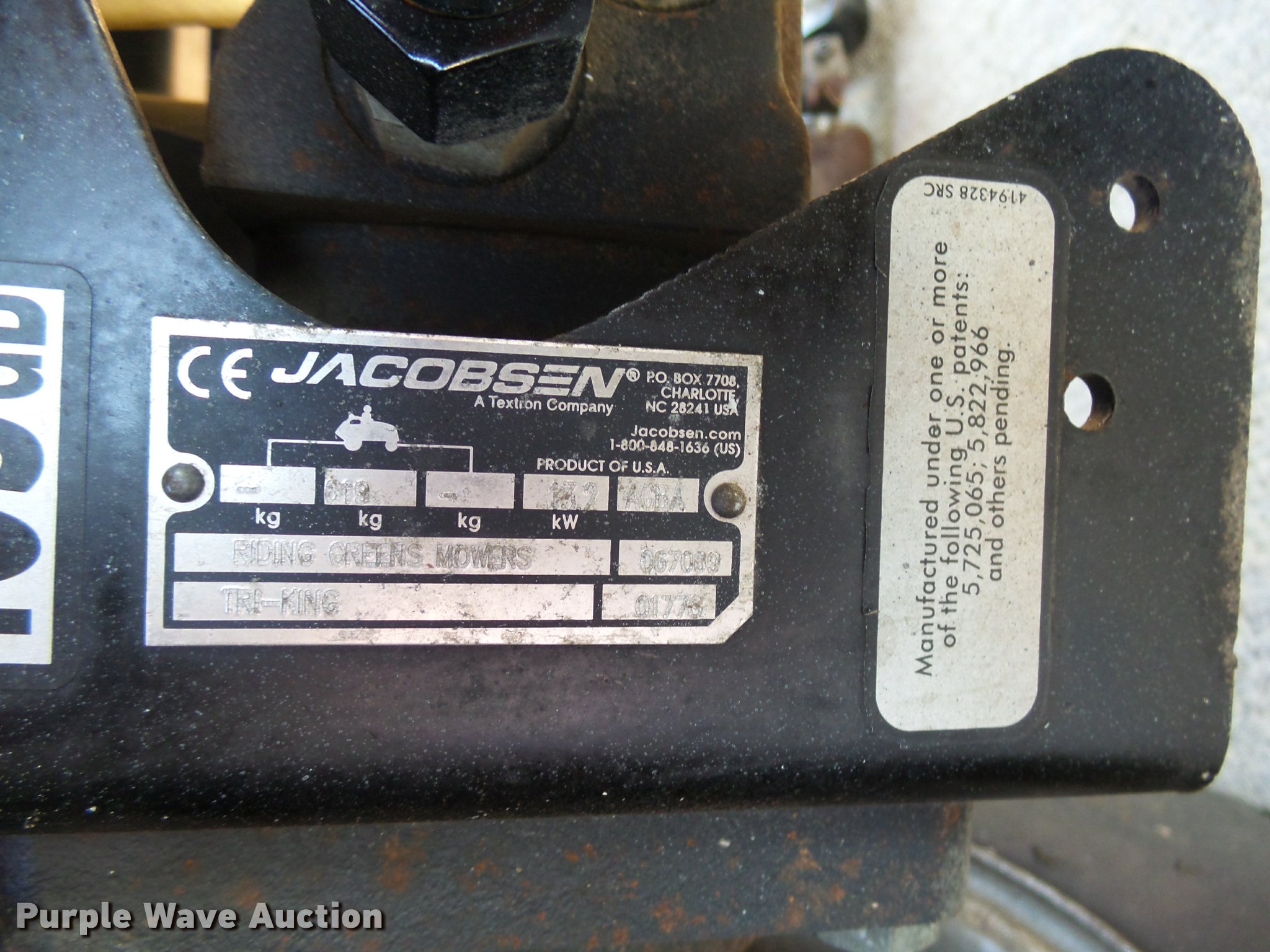 Purple Wave is selling a used Commercial Turf Mower in South Dakota. This item is a Jacobsen Tri-King 1900D trim lawn mower with the following: 1,100 hours on meter, Kubota diesel engine, OROPS, Model 113-07130, Serial 908, Front lights, 20x10-10 front tires, 20x10-8 rear tires, 1,600 lbs. base operating weight, 99"L x 78.5"W x 77"H, Serial 06789