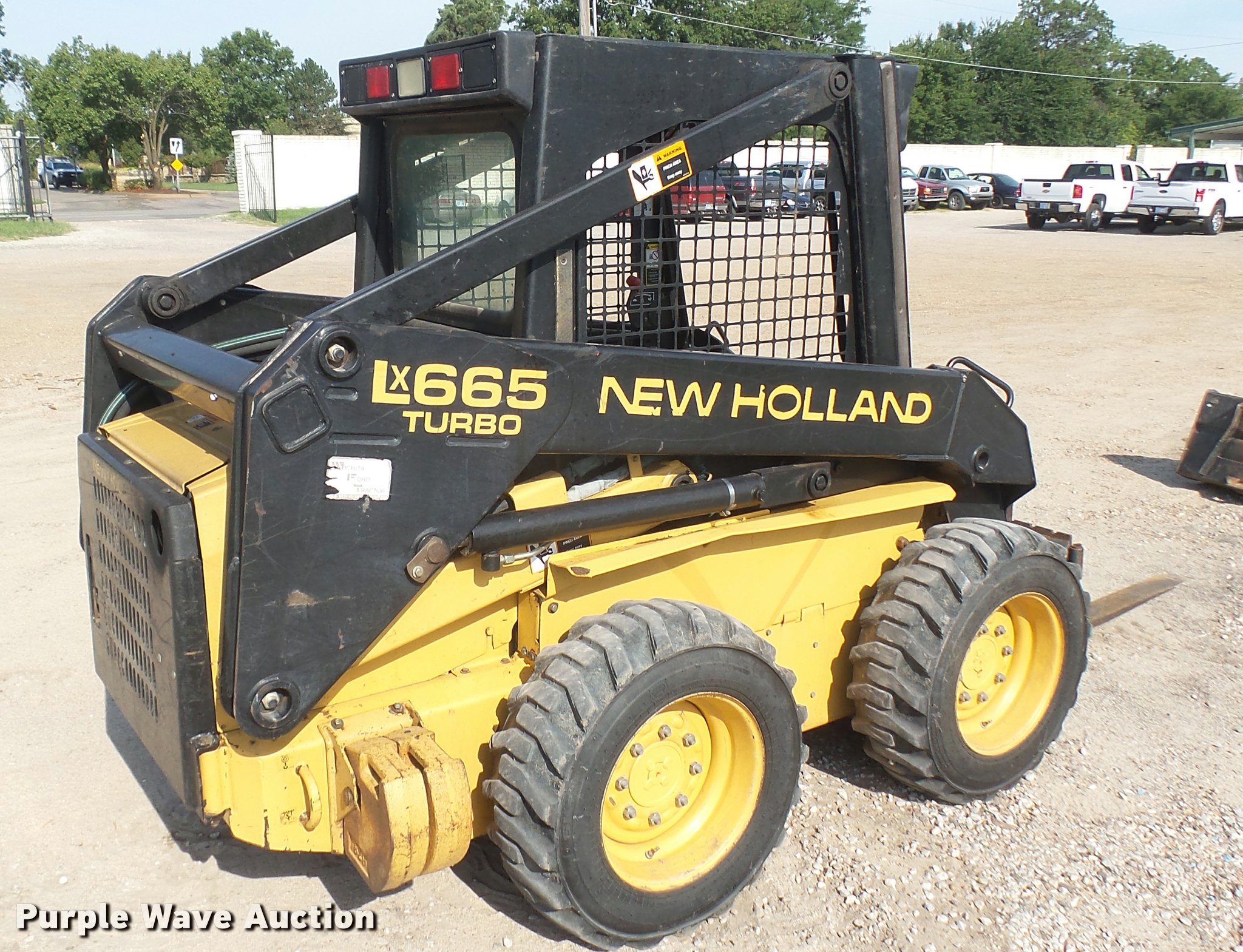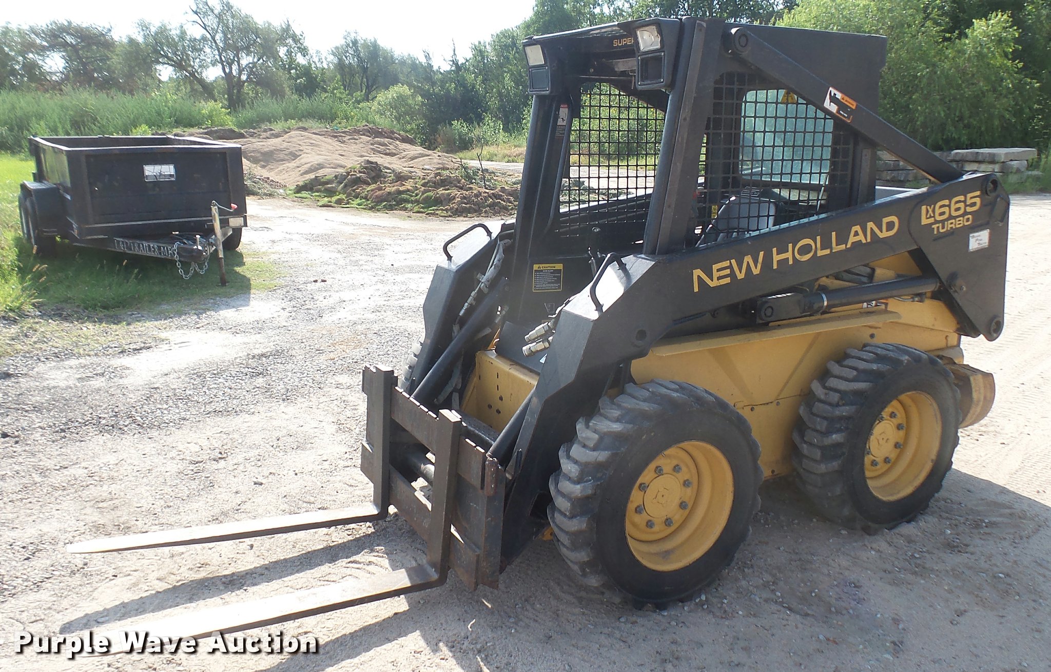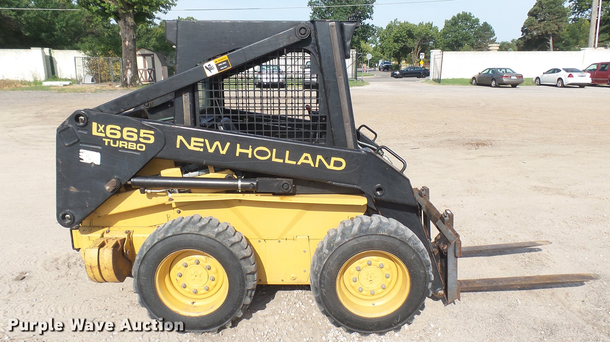 Purple Wave is selling a used Skid Steer Loader in Kansas. This item is a 1999 New Holland LX665 skid steer with the following: 4,539 hours on meter, New Holland N844T four cylinder turbo diesel engine, Hydrostatic transmission, Open station/canopy, Hand and foot controls, Front work lights, 65"W bucket, 42"L forks, Manual quick coupler, Auxiliary hydraulics, 42" wheel base, 90" dump height, Counterweights, 10 x 16.5 tires, Serial 69967
