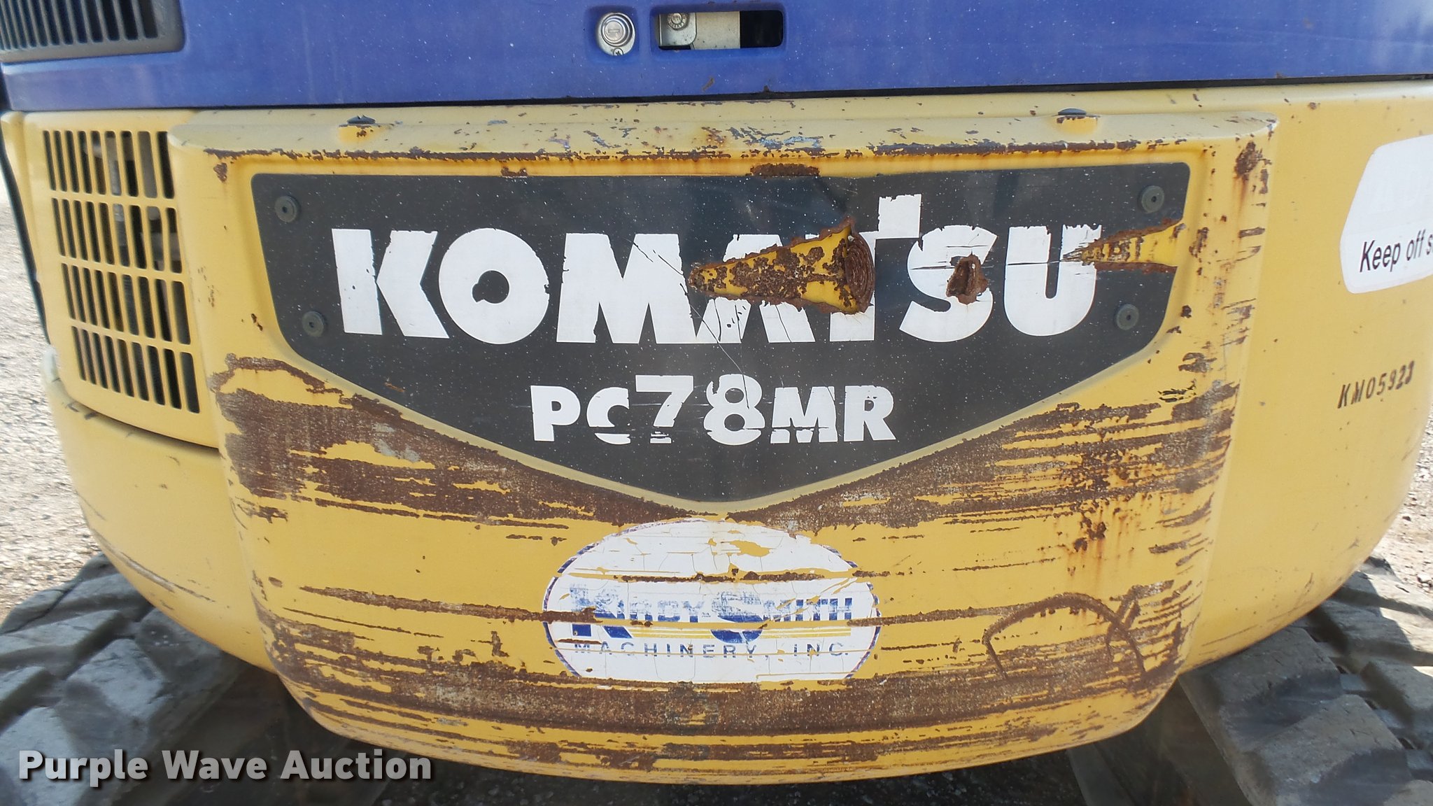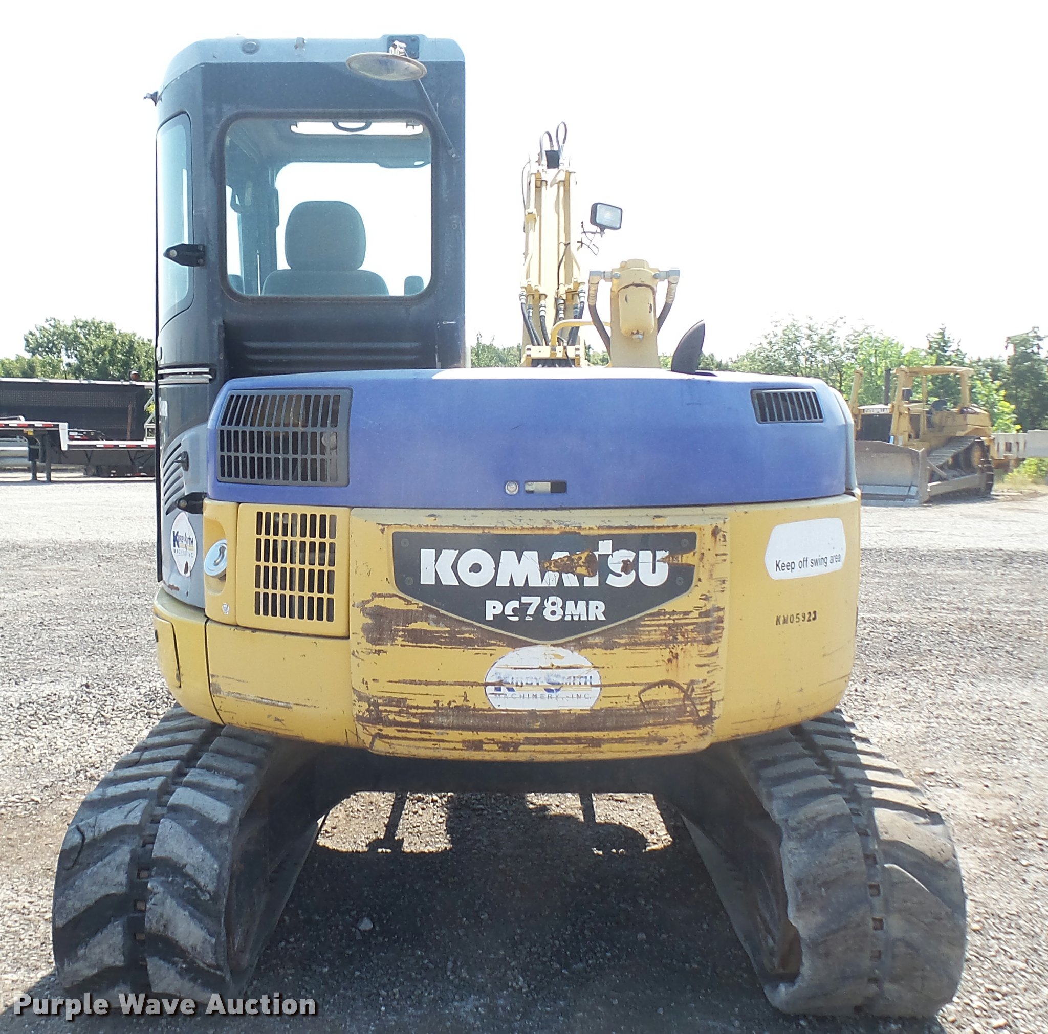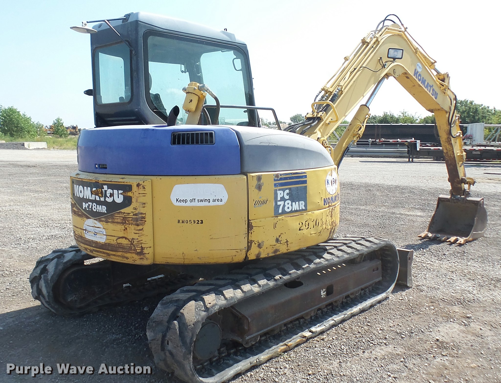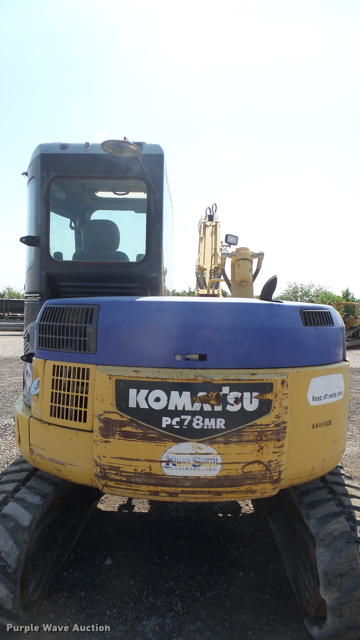 Purple Wave is selling a used Mini Excavator in Oklahoma. This item is a 2005 Komatsu PC78MR-6 compact excavator with the following: 7,806 hours on meter, Komatsu four cylinder turbo diesel engine, 54 HP, Hydrostatic transmission, EROPS, AC and heat, AM/FM, Suspension seat, Front work lights, Standard boom, 90" stick length, Geith 30"W bucket, Weld-on cutting edge, (5) teeth, Auxiliary hydraulics, 92"W backfill blade, 18"W rubber tracks, Hydraulics weak, Serial KMTPC029P01001514, Unit# 20.106L