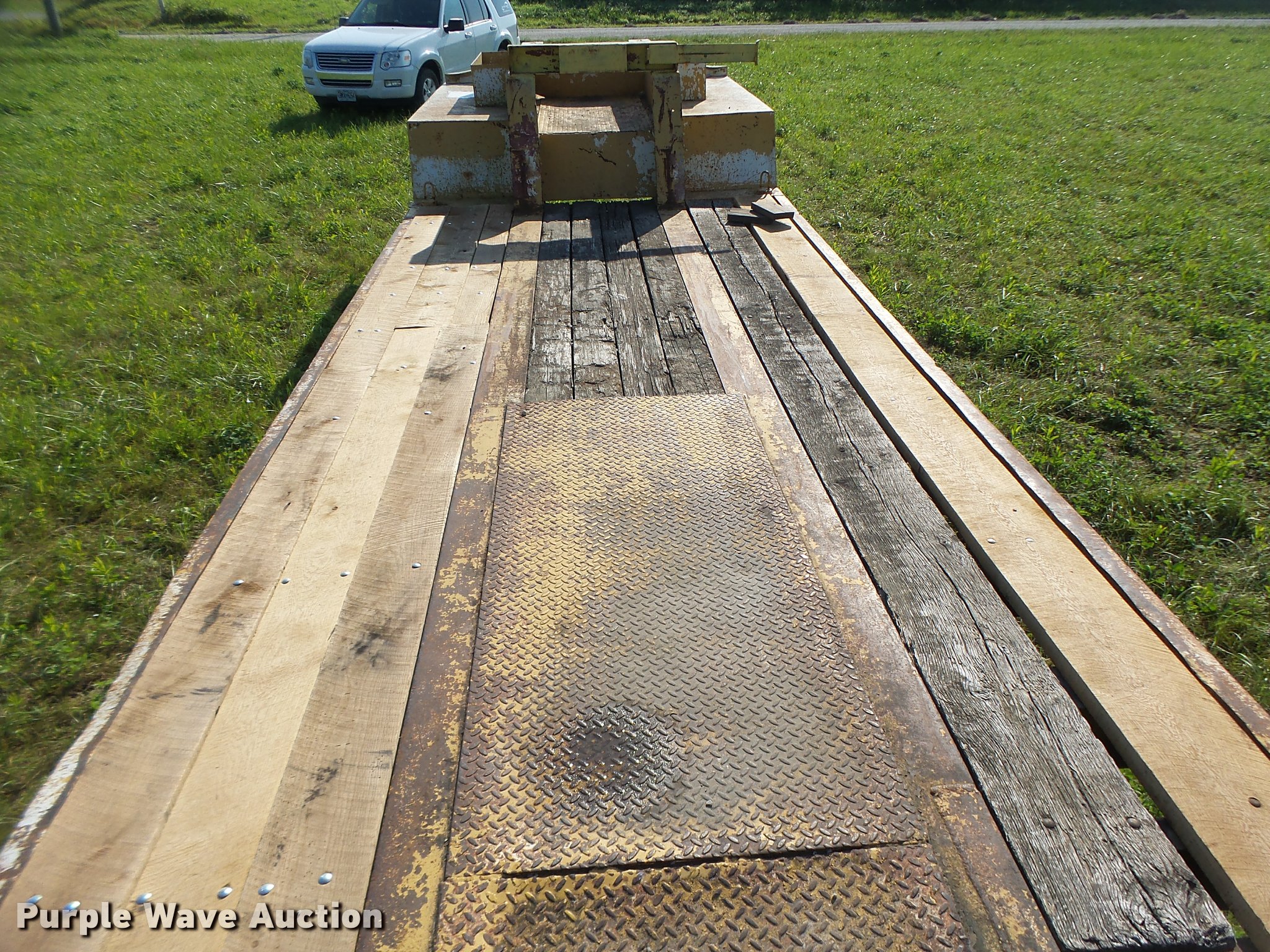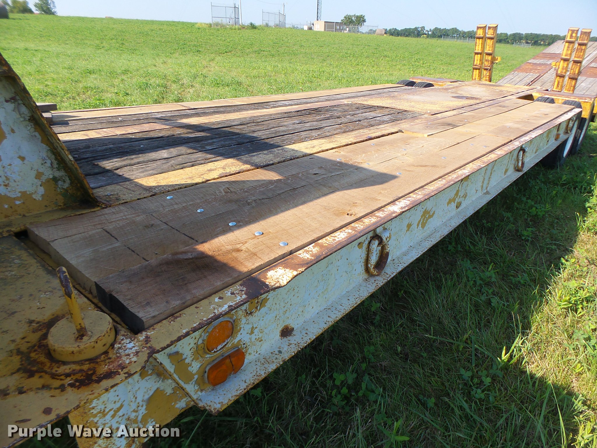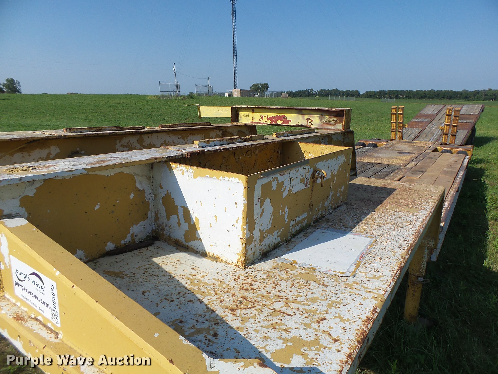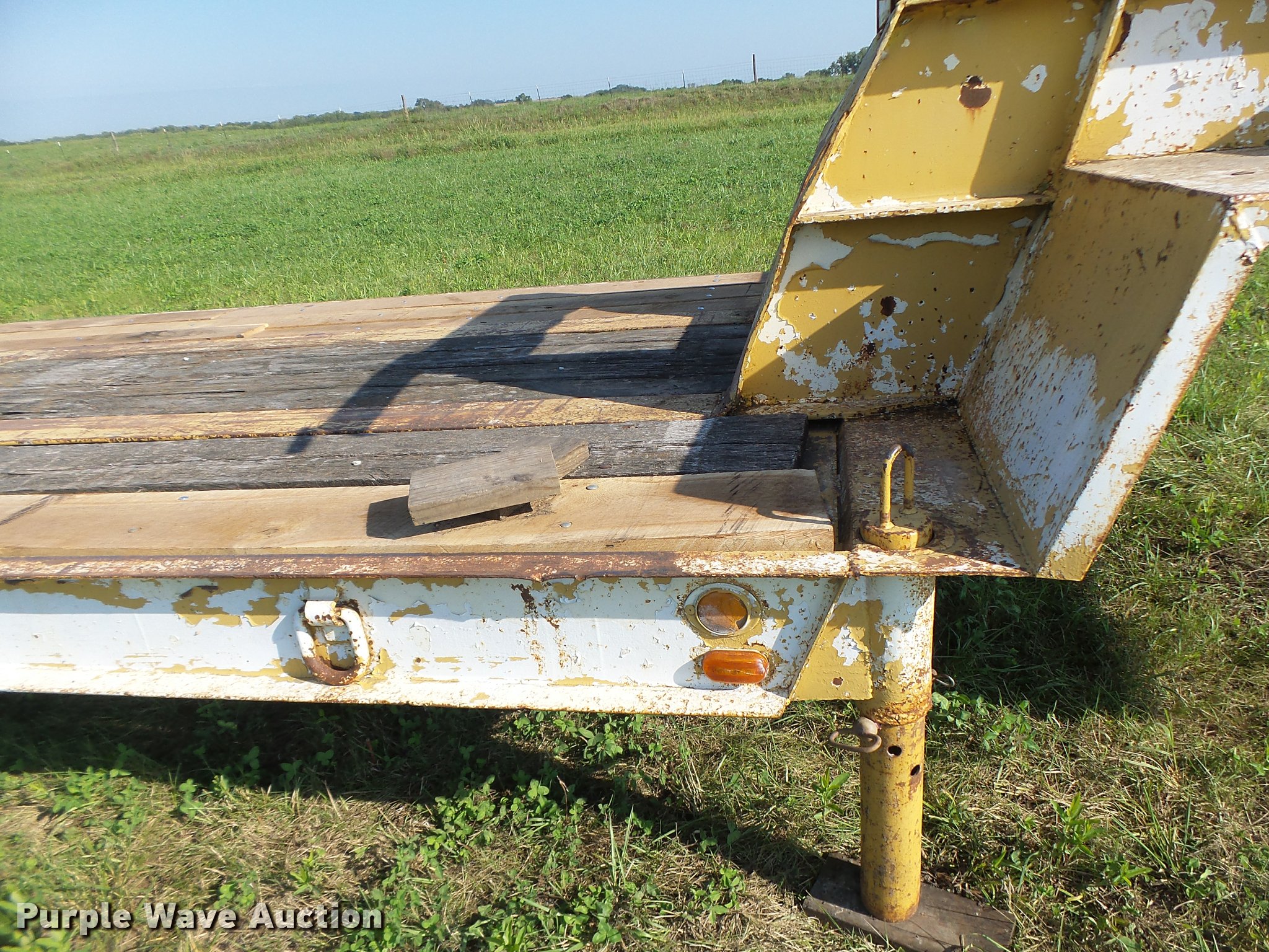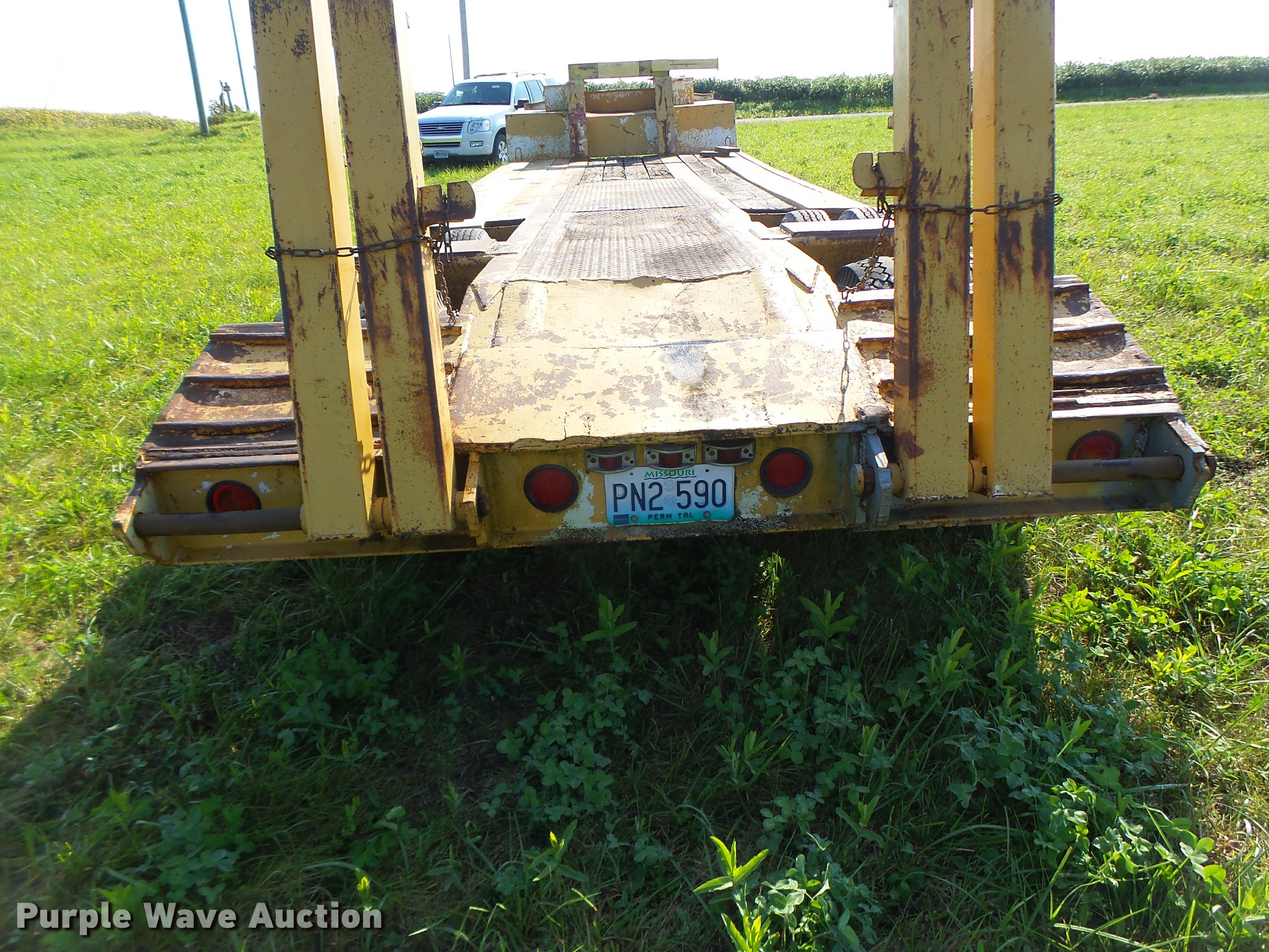 Purple Wave is selling a used Equip. Trailer in Missouri. This item is a 1972 Hyster lowboy equipment trailer with the following: 33.5' overall length, 23'L x 8'W wood deck, 34" tail length, 48" ramps, D-ring tie downs, Toolbox, Dual leg landing gear, Fifth wheel hitch, Spring suspension, Air brakes, Steel wheels, 8.25R15 tires, GVWR 59,000 lbs