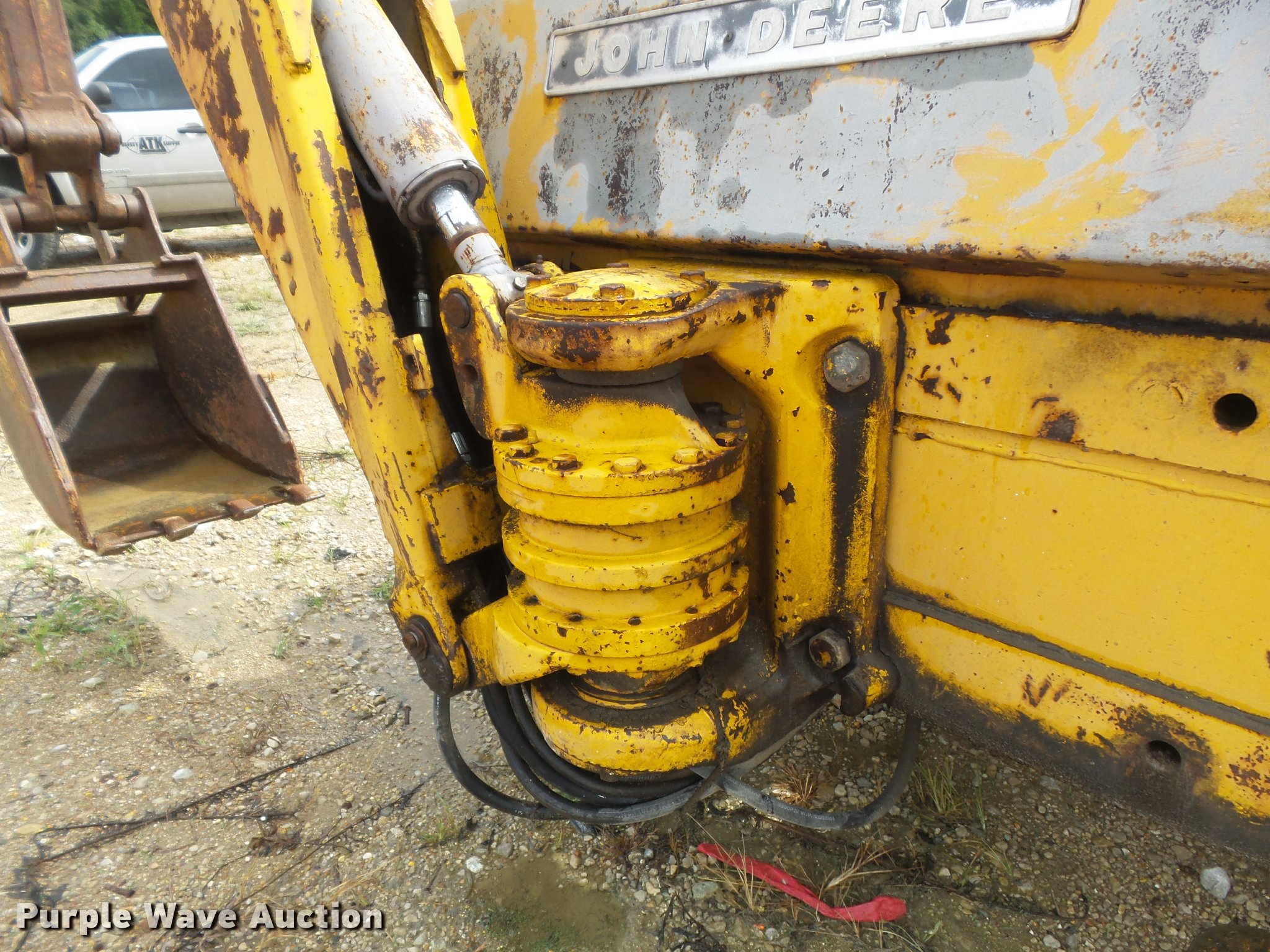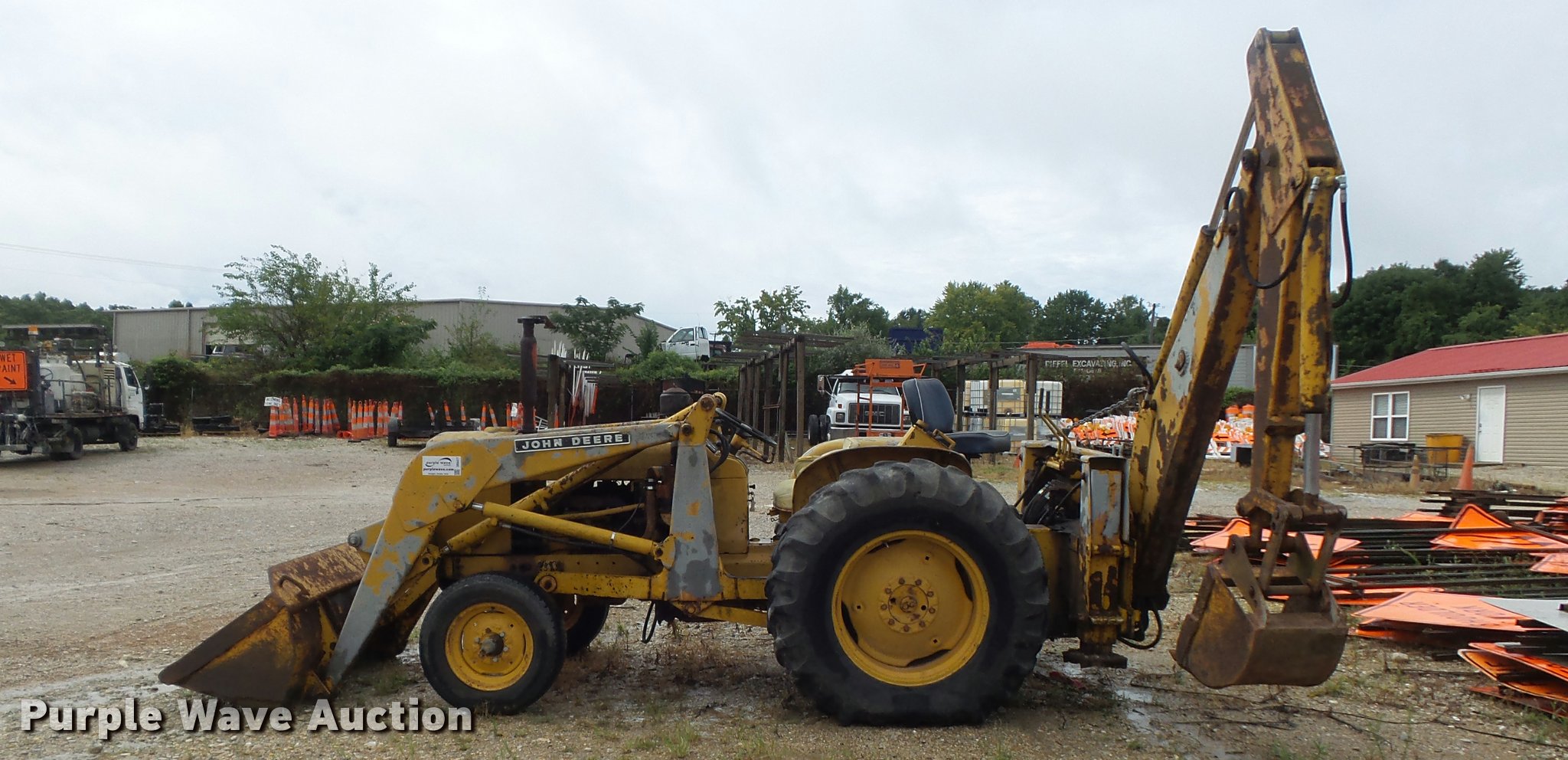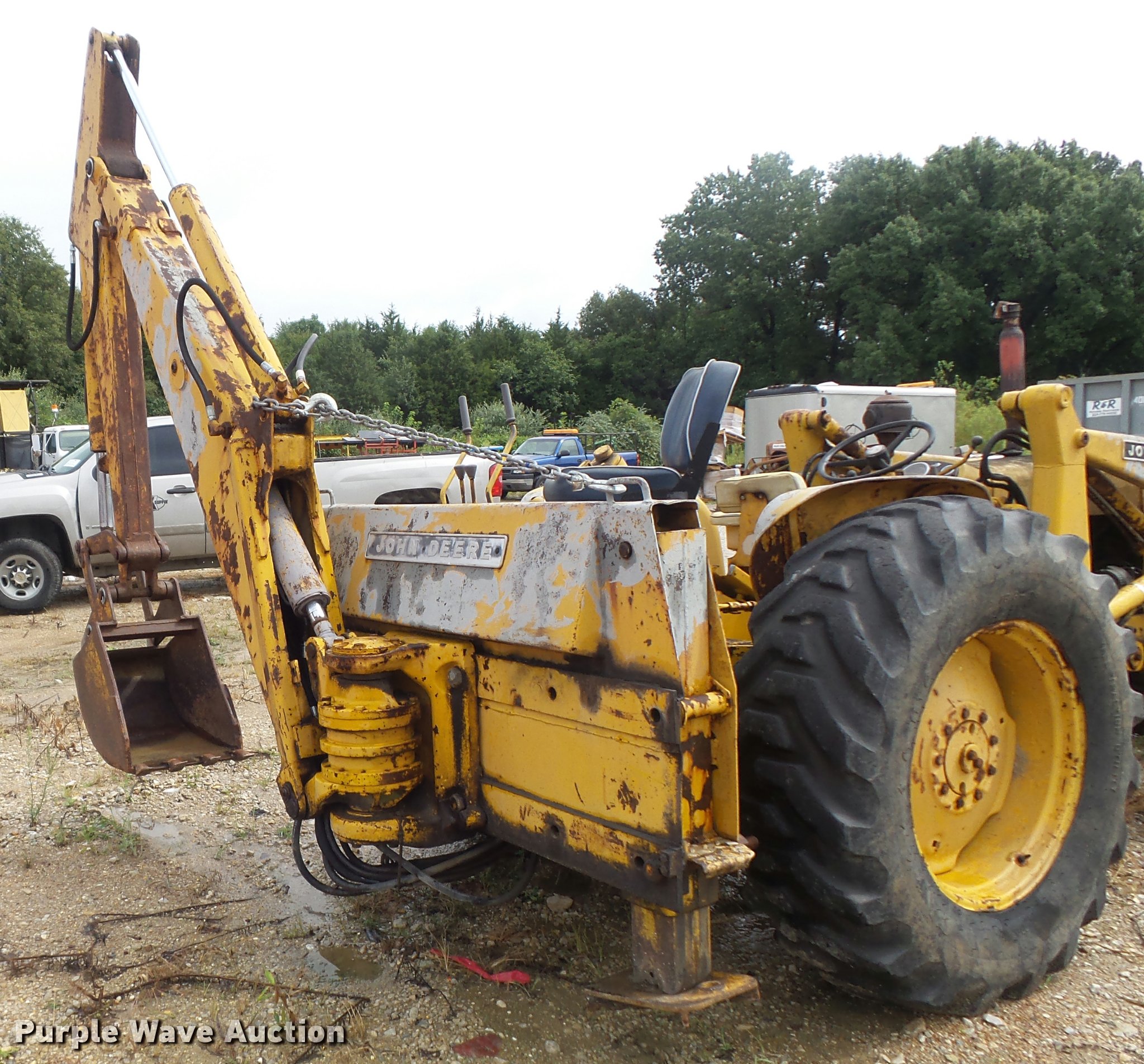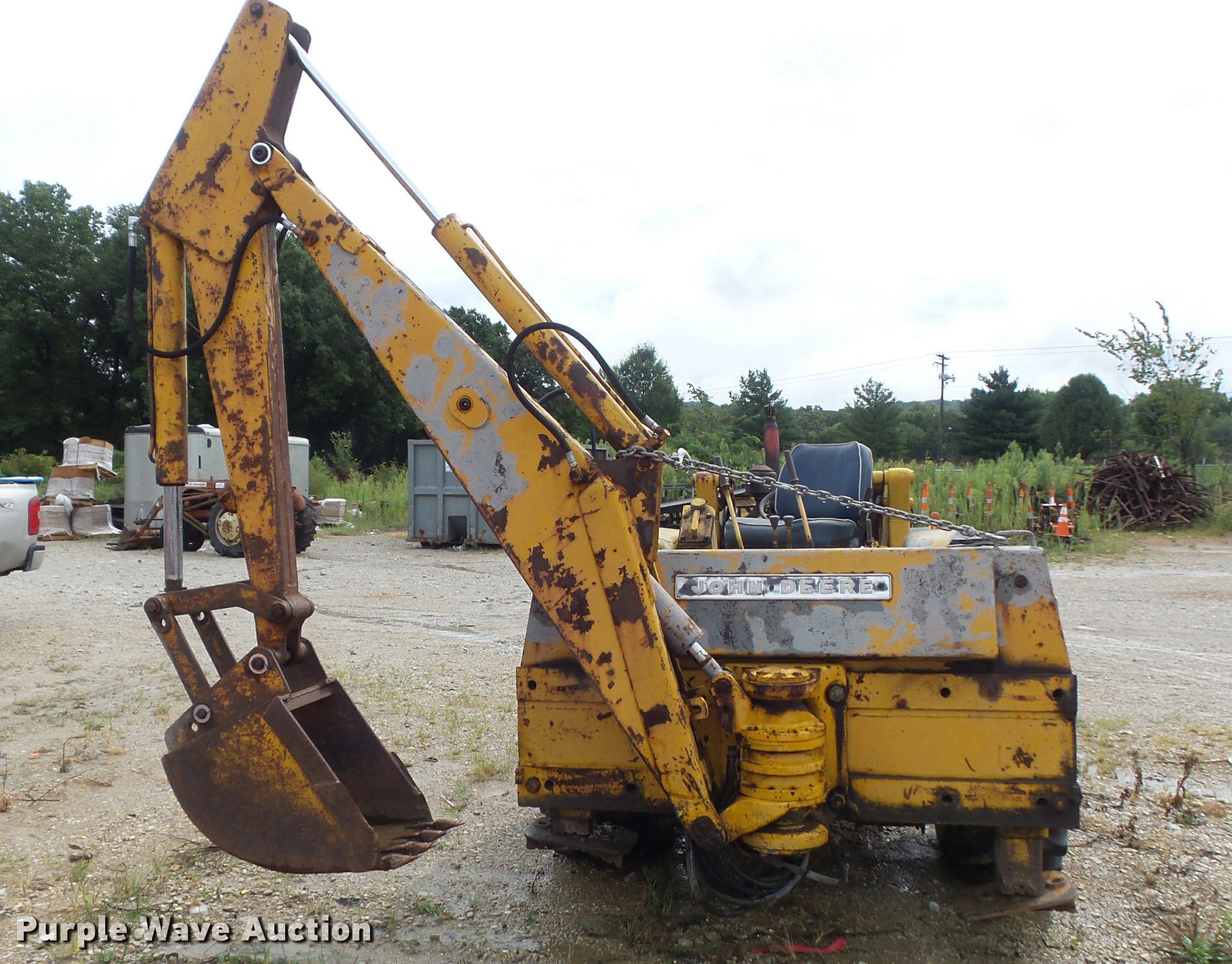 Purple Wave is selling a used Tractor Loader Backhoe in Missouri. This item is a John Deere 2010 industrial tractor backhoe with the following: John Deere HA165-G four cylinder gas engine, Manual transmission, 8F-3R gears, John Deere 720 loader, 65"W bucket, Joystick controls, John Deere 51 backhoe, 18"W four tooth bucket, Serial 51-394, 84" wheelbase, LT225/75R16 front tires, 16.9-28 rear tires, Dead battery