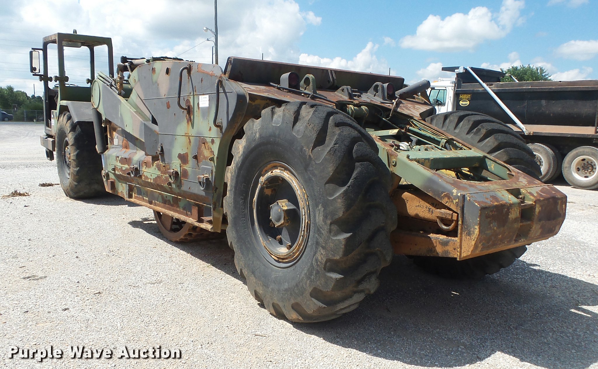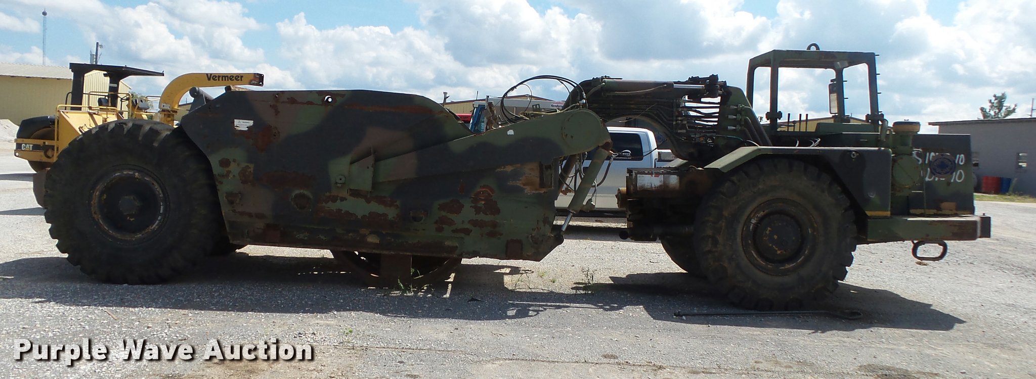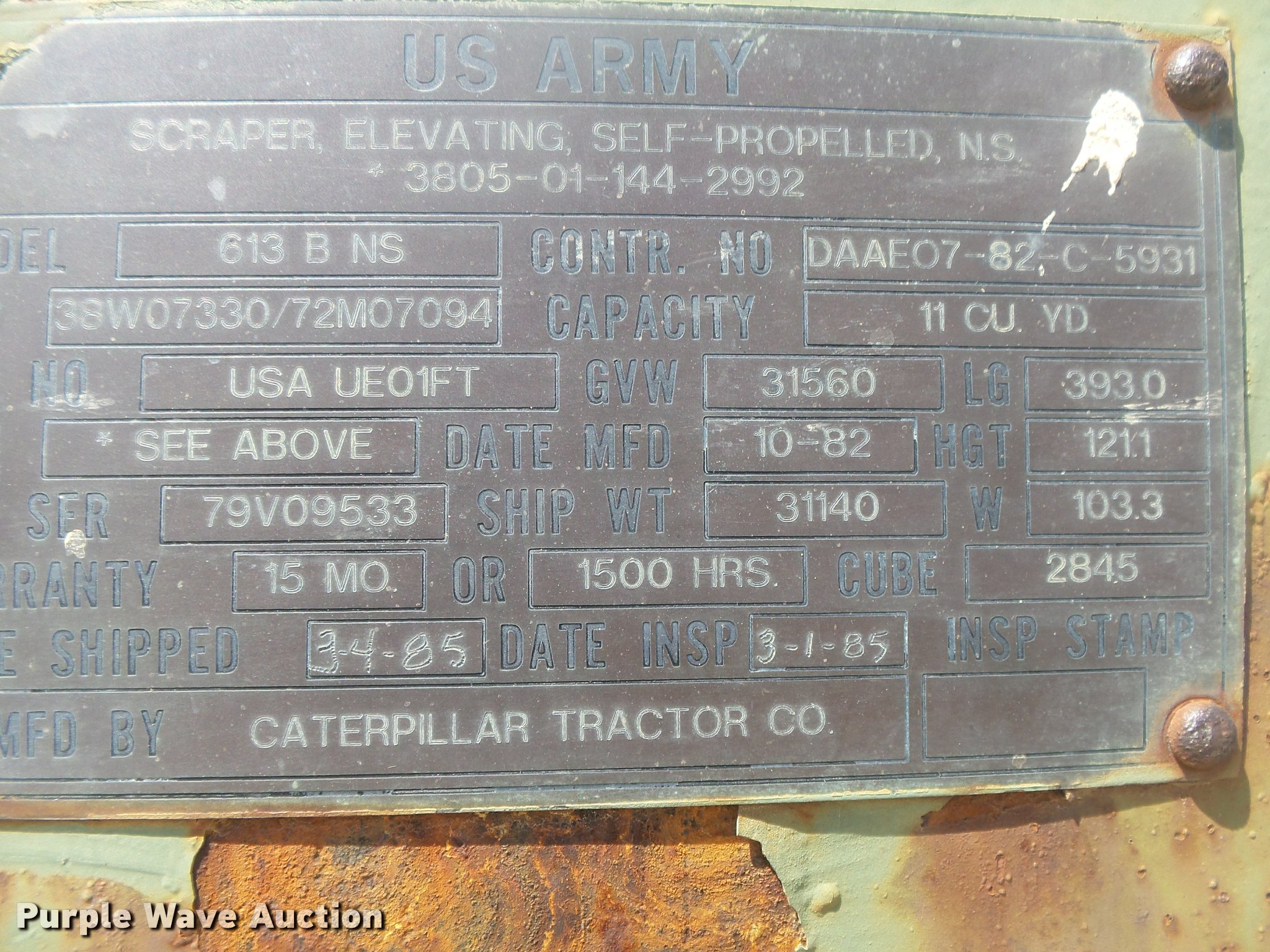 Purple Wave is selling a used Elevating Scraper in Arkansas. This item is a 1982 Caterpillar 613B grid roller scraper with the following: Caterpillar six cylinder turbo diesel engine, Powershift transmission, 4F-2R gears, Locking differential, OROPS, Air suspension seat, 11 cu.yd. bowl capacity, Hydraulic lift, (4) lever controls, Rear push block, Air brakes, 18.00-25 tires, Additional set of grid rollers, Serial 68W07330, Unit# BC70433
