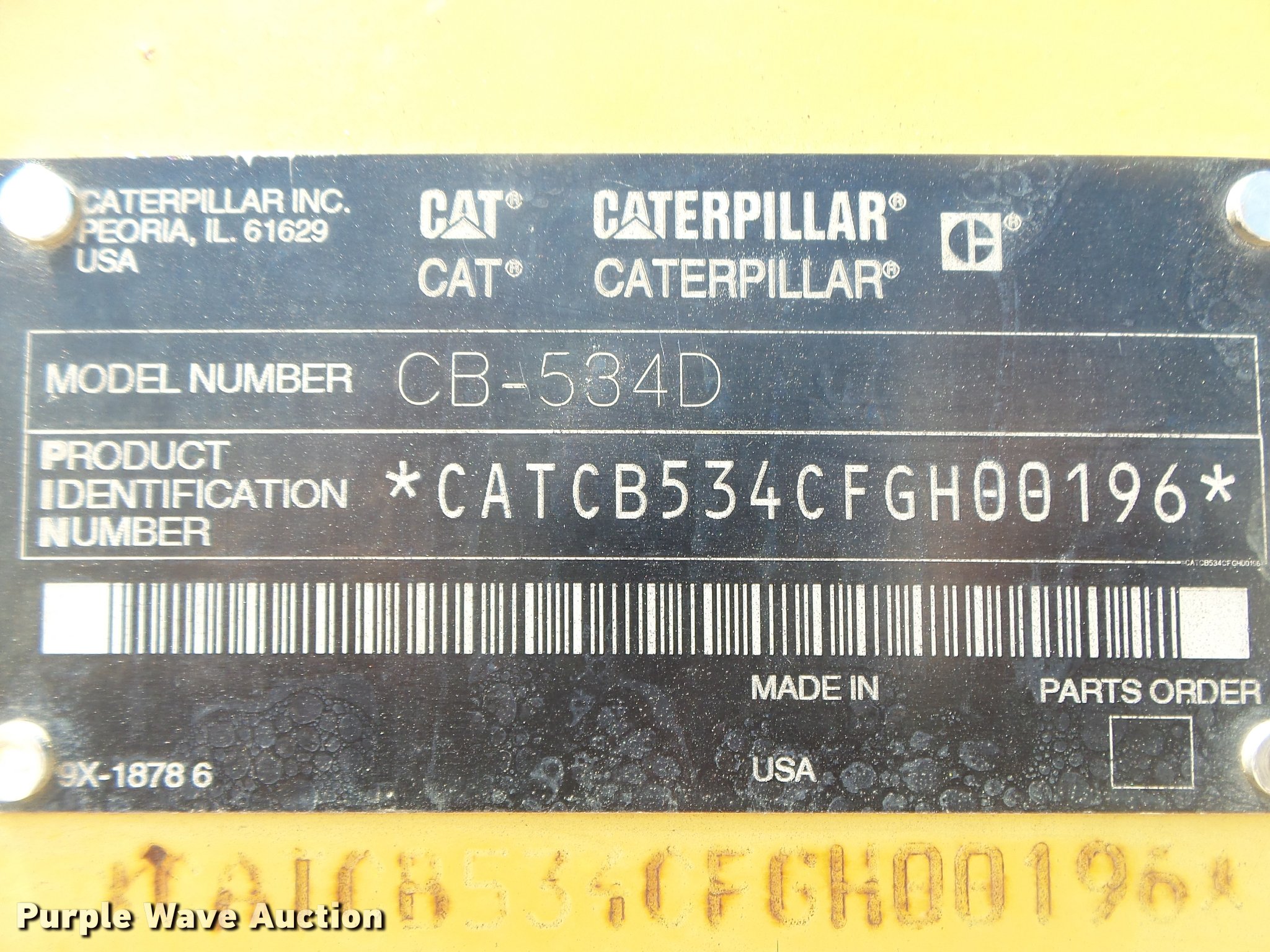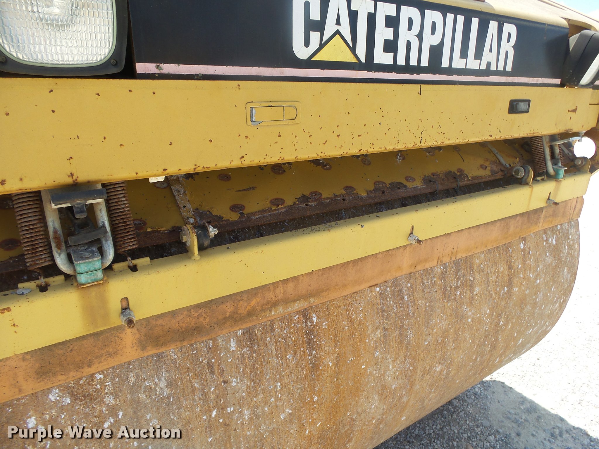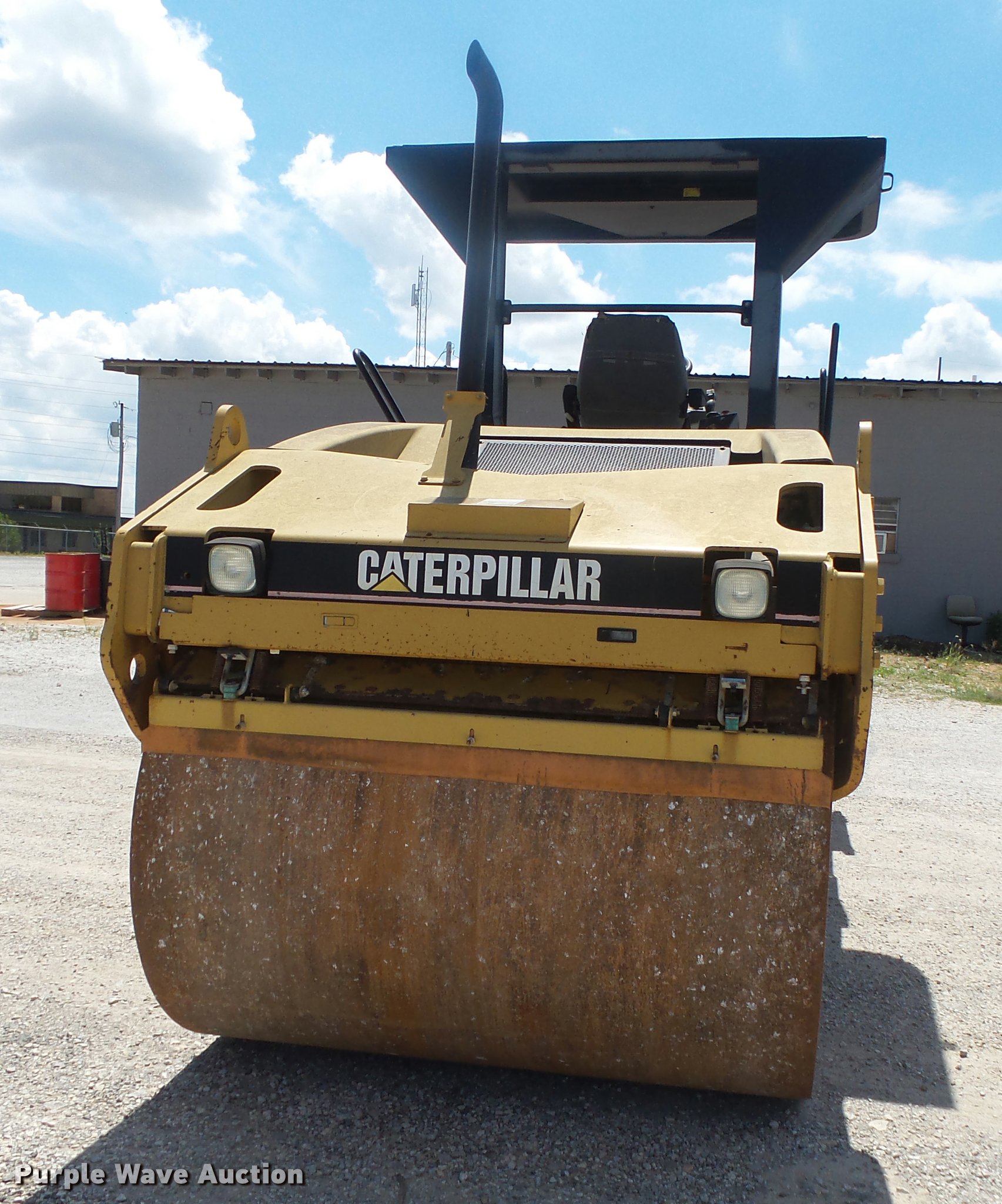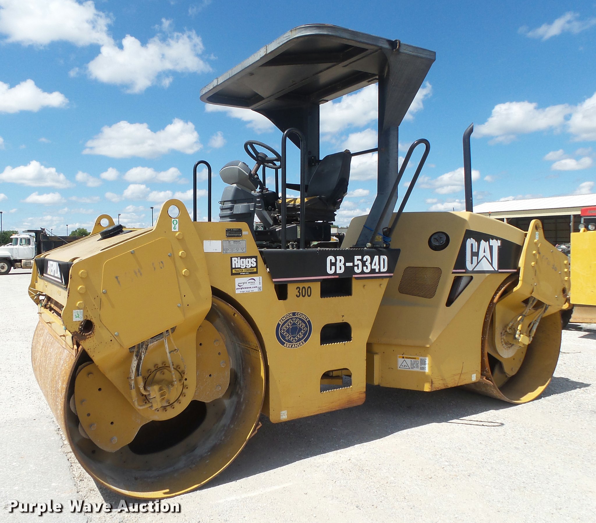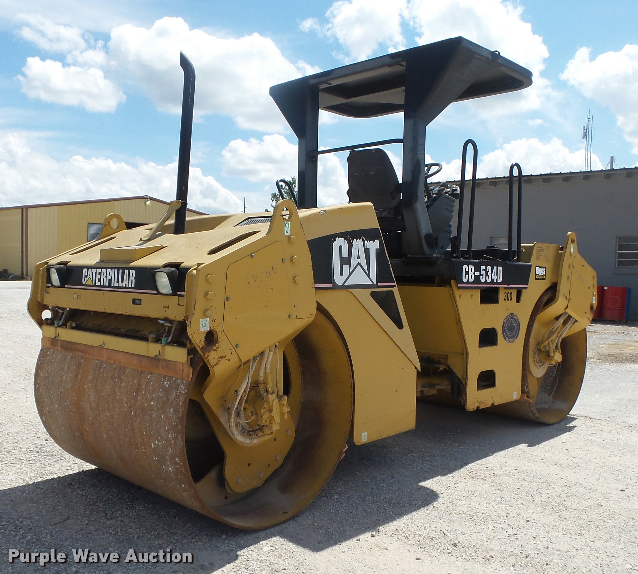 Purple Wave is selling a used Double Drum Roller Compactor in Arkansas. This item is a 2003 Caterpillar CB-534D double drum vibratory roller with the following: Caterpillar four cylinder diesel engine, Hydrostatic transmission, Canopy, Suspension seat, Work lights, 67"W x 50" diameter smooth drums, Double vibratory system, Independent drum controls, Front and rear drum scrapers, Front and rear water application, Serial CATCB534CFGH00196, Unit# 50469