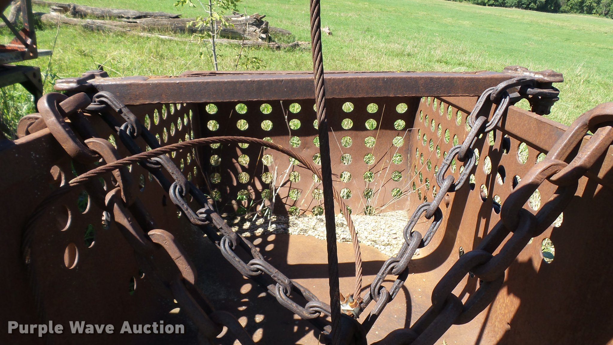 Purple Wave is selling a used Crane Attach. in Iowa. This item is a Hendrix dragline bucket with the following: 80"L x 56"W x 60"H, 1.5 cu.yd. capacity, 48" opening, (4) bolt-on teeth, Cables, Pulleys, Chains, Serial 31911