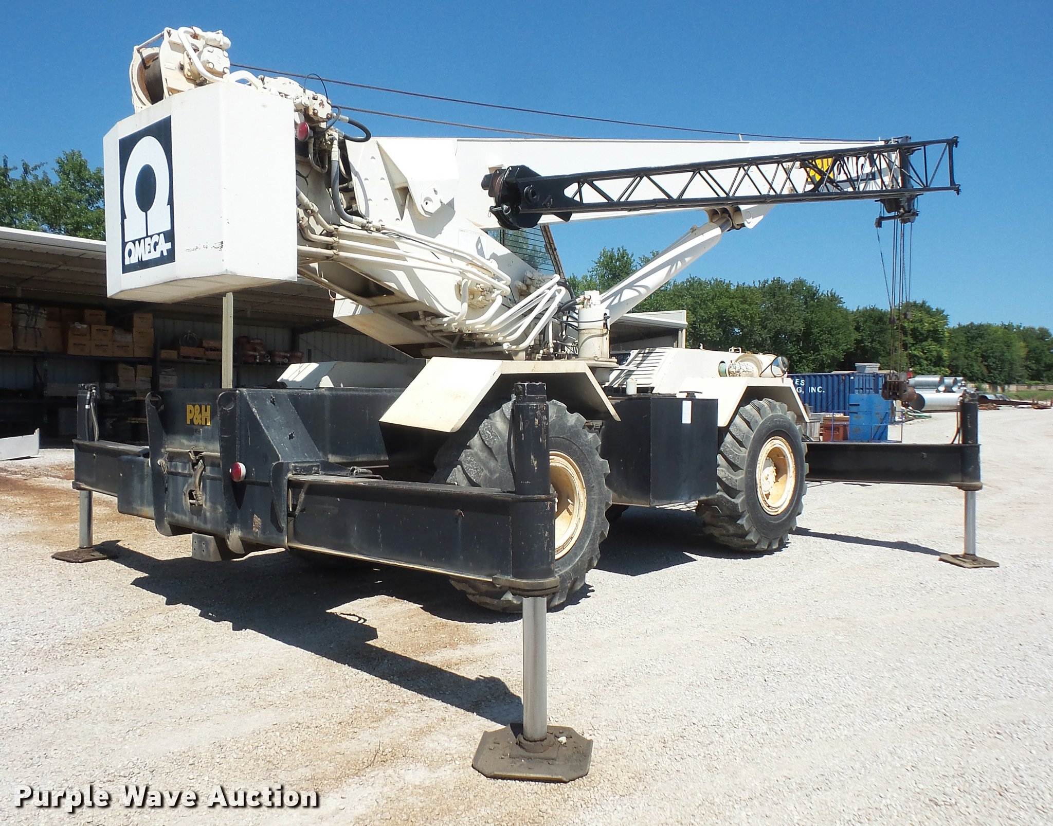 Purple Wave is selling a used Rough or All Terrain Crane in Kansas. This item is a 1981 P & H Omega 25 crane with the following: 8,624 hours on meter, Detroit Diesel four cylinder diesel engine, Three speed transmission, Tandem axle, (4) drive wheels, Four wheel steering, Backup alarm, Telescopic boom, 80' boom length, 30' jib, 50,000 lbs maximum lift capacity, Three sections, (2) winches, In-cab boom controls, Three sheave crane block, Crane ball and hook, Load A2B load monitor, Air brakes, 20.5-25 tires, Manuals included, Serial 50208