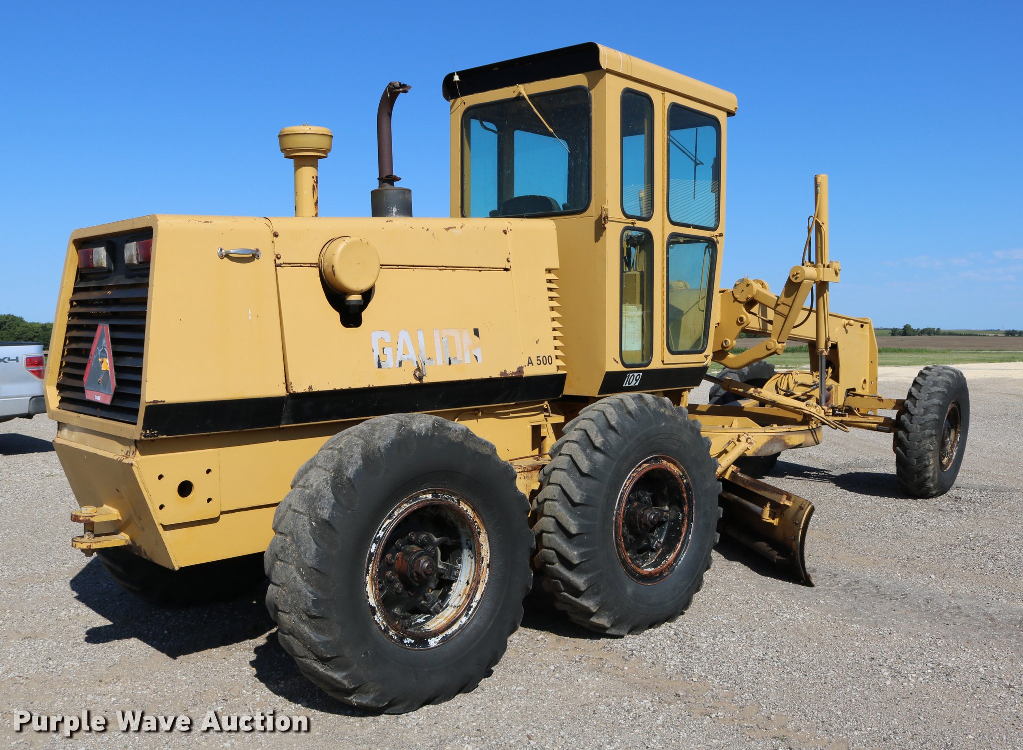 Purple Wave is selling a used Motor Grader in Kansas. This item is a 1982 Galion A500 motor grader with the following: 6,449 hours on meter, International Harvester UD-466-G167A six cylinder gas engine, Serial 67200014055793, Powershift transmission, 4F-4R gears, EROPS, Heat, Suspension seat, Nine control valves, Front work lights, 14'W moldboard, Left blade extension, Tip control, Side shift, 14.00-24 tires, Passenger side engine cover hold open bar missing, Engine noise, Unknown operating condition of heat, Side shift cylinder needs seal kit, Serial IF10366, Unit# 109