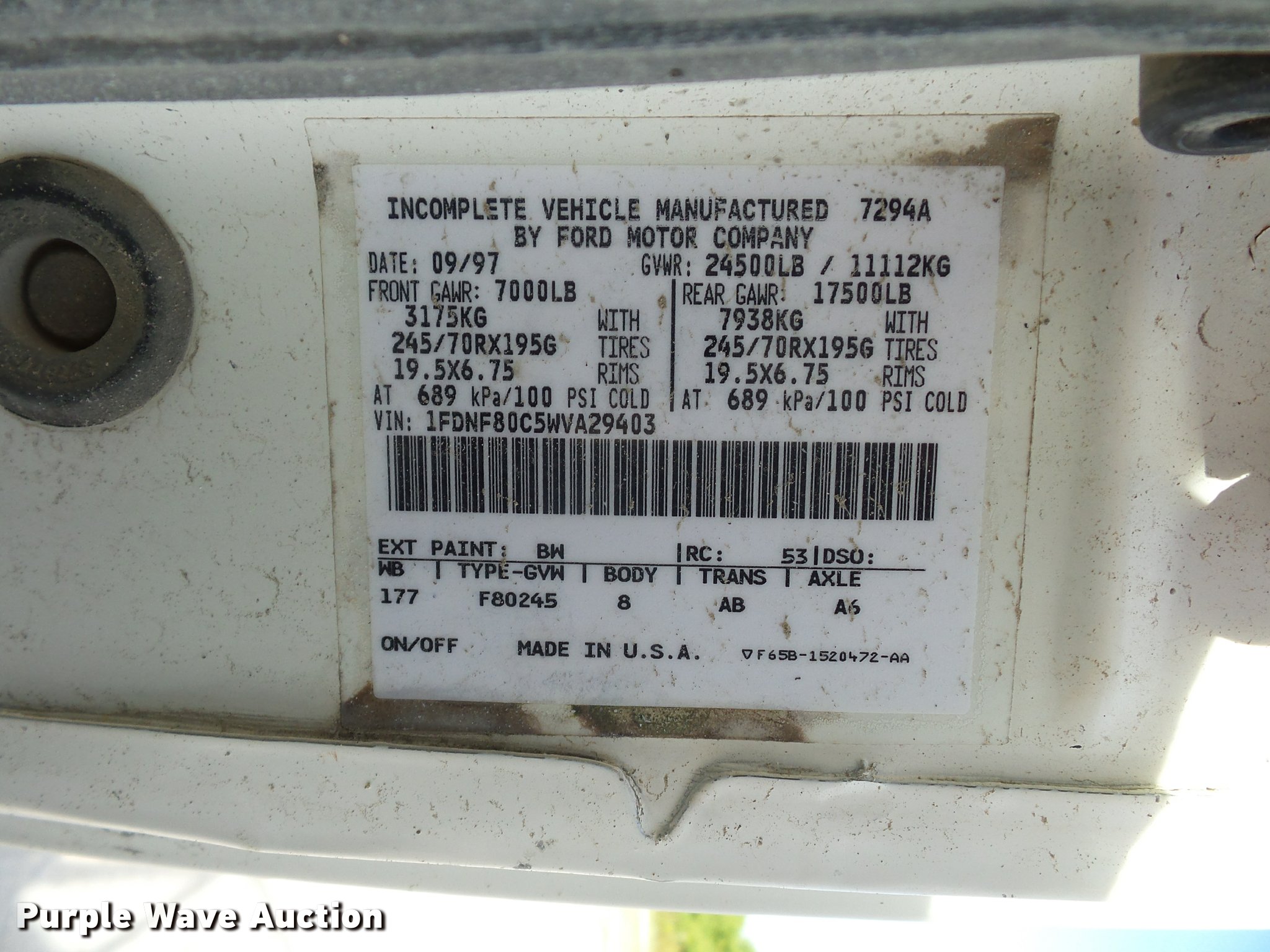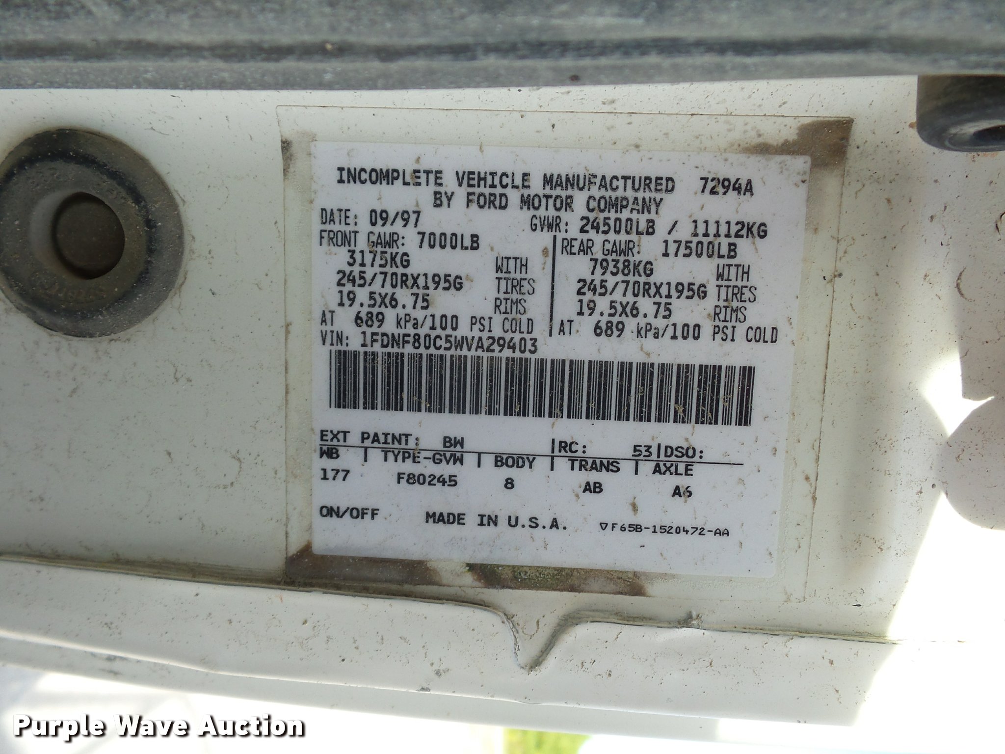 Purple Wave is selling a used Truck Chassis in Missouri. This item is a 1998 Ford F800 truck cab and chassis with the following: 58,990 miles on odometer, 7,573 hours on meter, Cummins ISB 5.9L L6 diesel engine, Automatic transmission, Heat, AM/FM, Manual windows and locks, Vinyl interior, 14' from rear of cab to rear of frame, 106" from rear of cab to center of axle, Hydraulic brakes, 245/70R19.5 tires