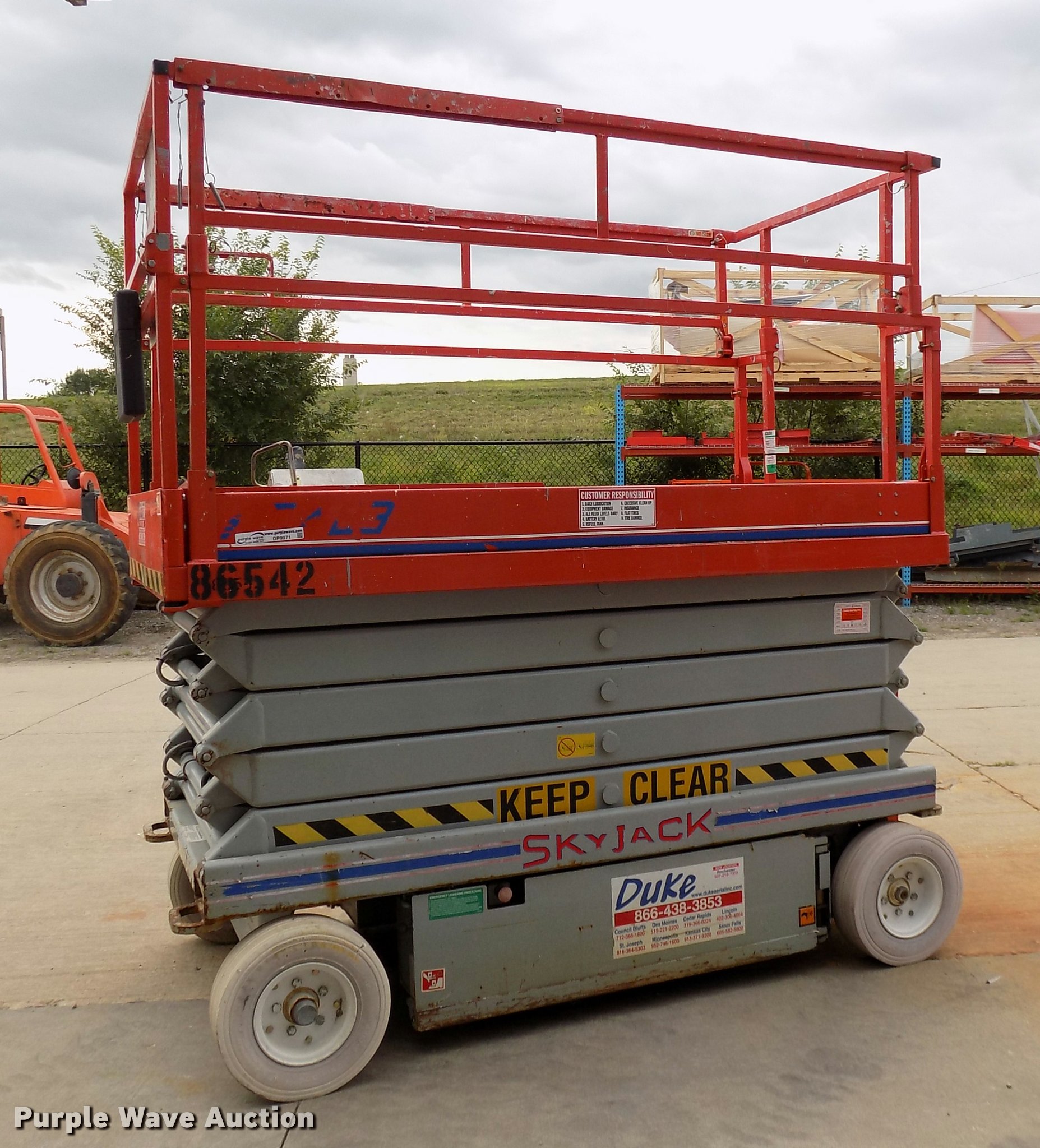1998 Sky Jack 4830 scissor lift. 833 hours on meter, 24V operation, 500 lbs maximum lift capacity, 36' maximum working height, 30' maximum drive height, 81"L x 48"W platform Platform and ground controls, Platform extensions, Safety alarm, 92"L x 48"W x 95"H, 4.00-8 solid non-marking tires, Serial 86542. Duke Aerial Equipment. 560 Waconia Ct SW. Cedar Rapids, IA 52404