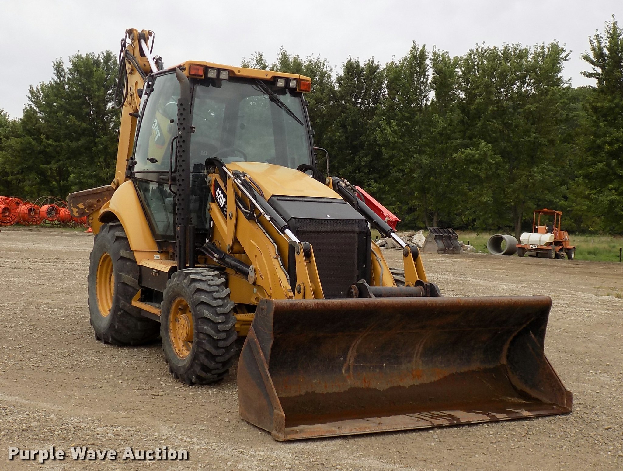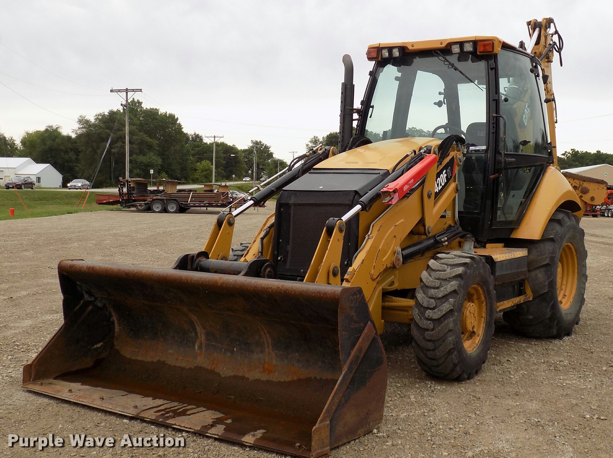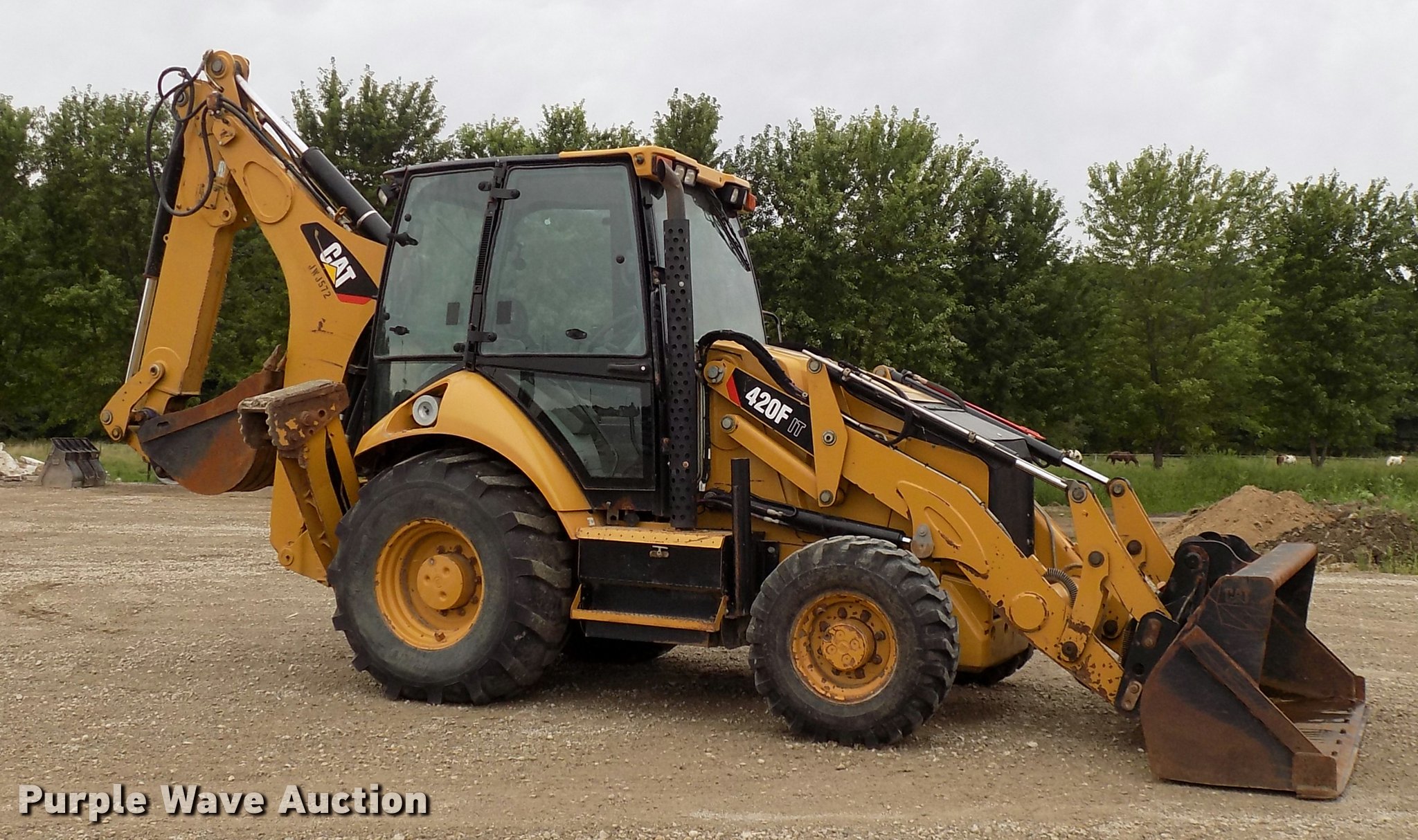 Purple Wave is selling a used Tractor Loader Backhoe in Iowa. This item is a 2012 Caterpillar 420F IT backhoe with the following: 2,793 hours on meter, Caterpillar C4 diesel engine, Shuttle shift transmission, 4F-4R gears, Four wheel drive, EROPS, Heat, AM/FM, Tilt steering wheel, Pilot control, Wipers, Backup alarm, Integrated tool carrier, Caterpillar 92"W loader bucket, Bolt-on cutting edge, Auxiliary hydraulics, Caterpillar 17"W backhoe bucket, (4) teeth, Auxiliary hydraulics, 125/80-18 front tires, 19.5L-24 rear tires, Serial CAT0420FJJWJ00572