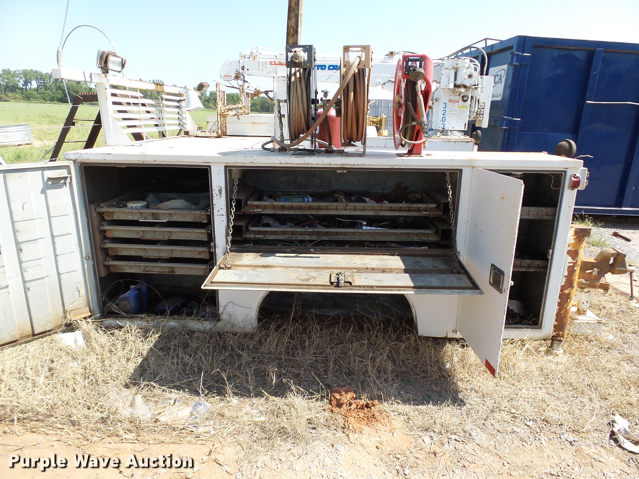 Purple Wave is selling a used Automotive Parts or Acces. in Oklahoma. This item is a Rawson-Koenig DA35B service bed with the following: 10.5'L x 96"W overall, 9'L box, Internal shelving with pull out drawers, Work lights, Auto Crane 3203 crane, Wired controls, (3) hose reels, Wilton vise, Outriggers, Serial 126948