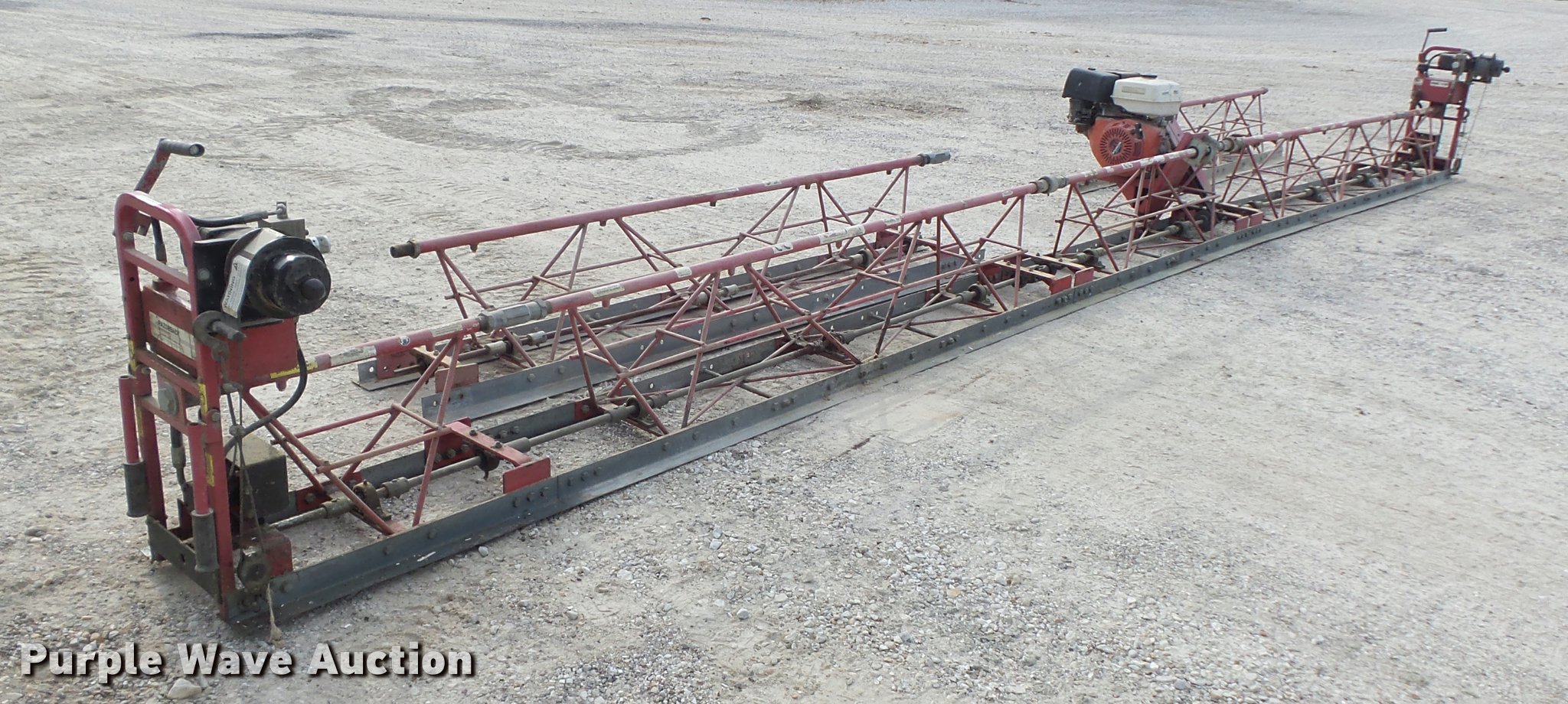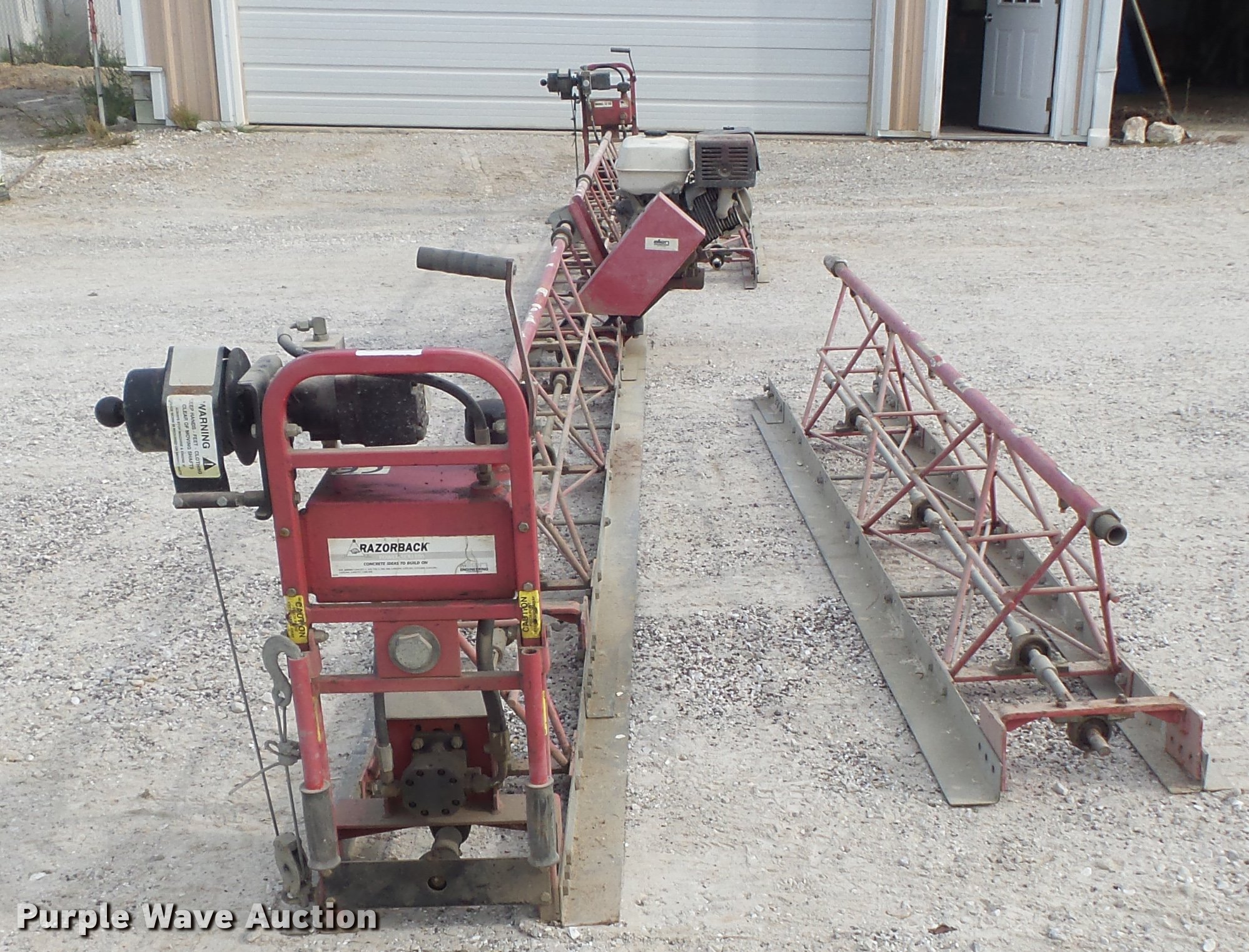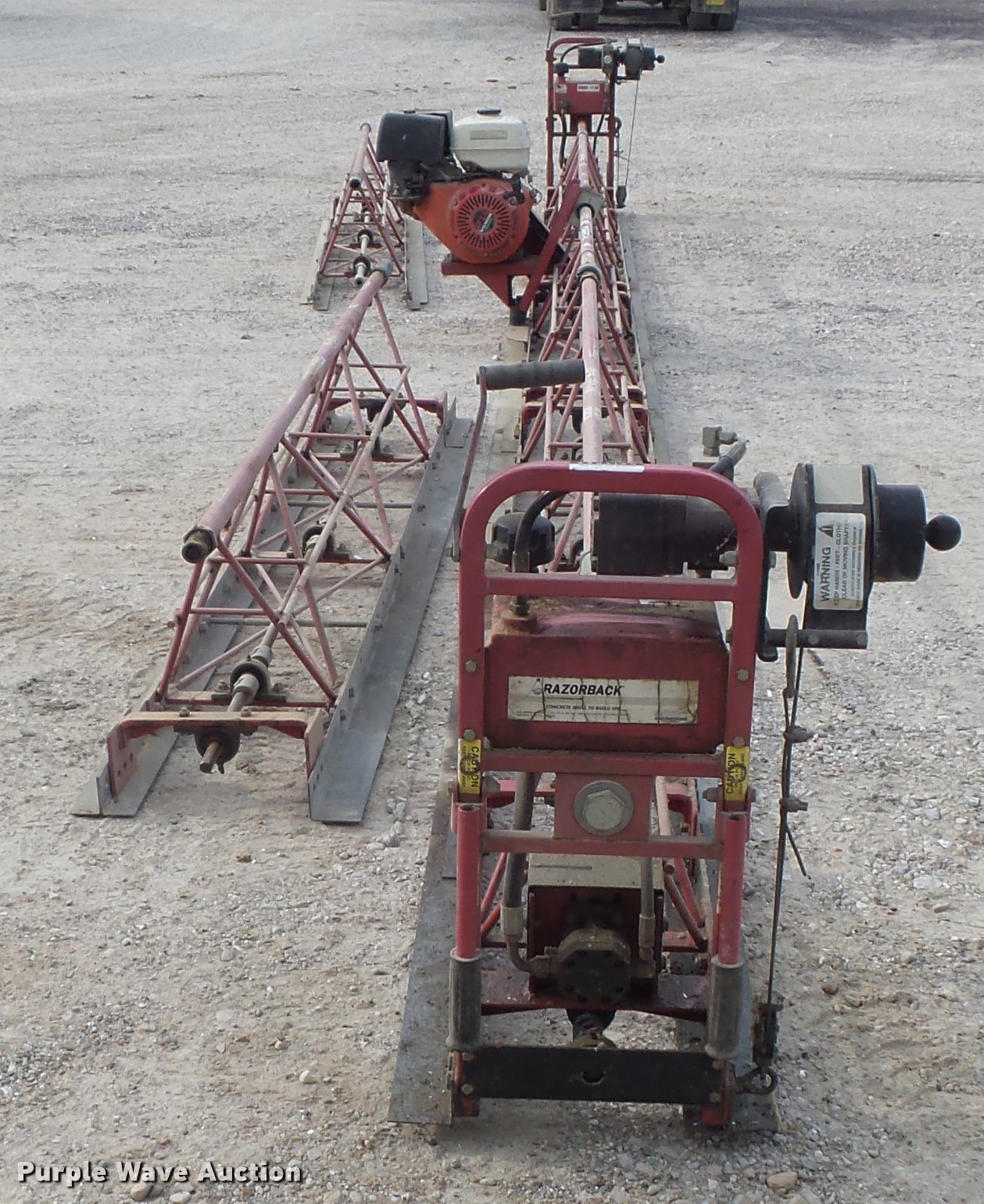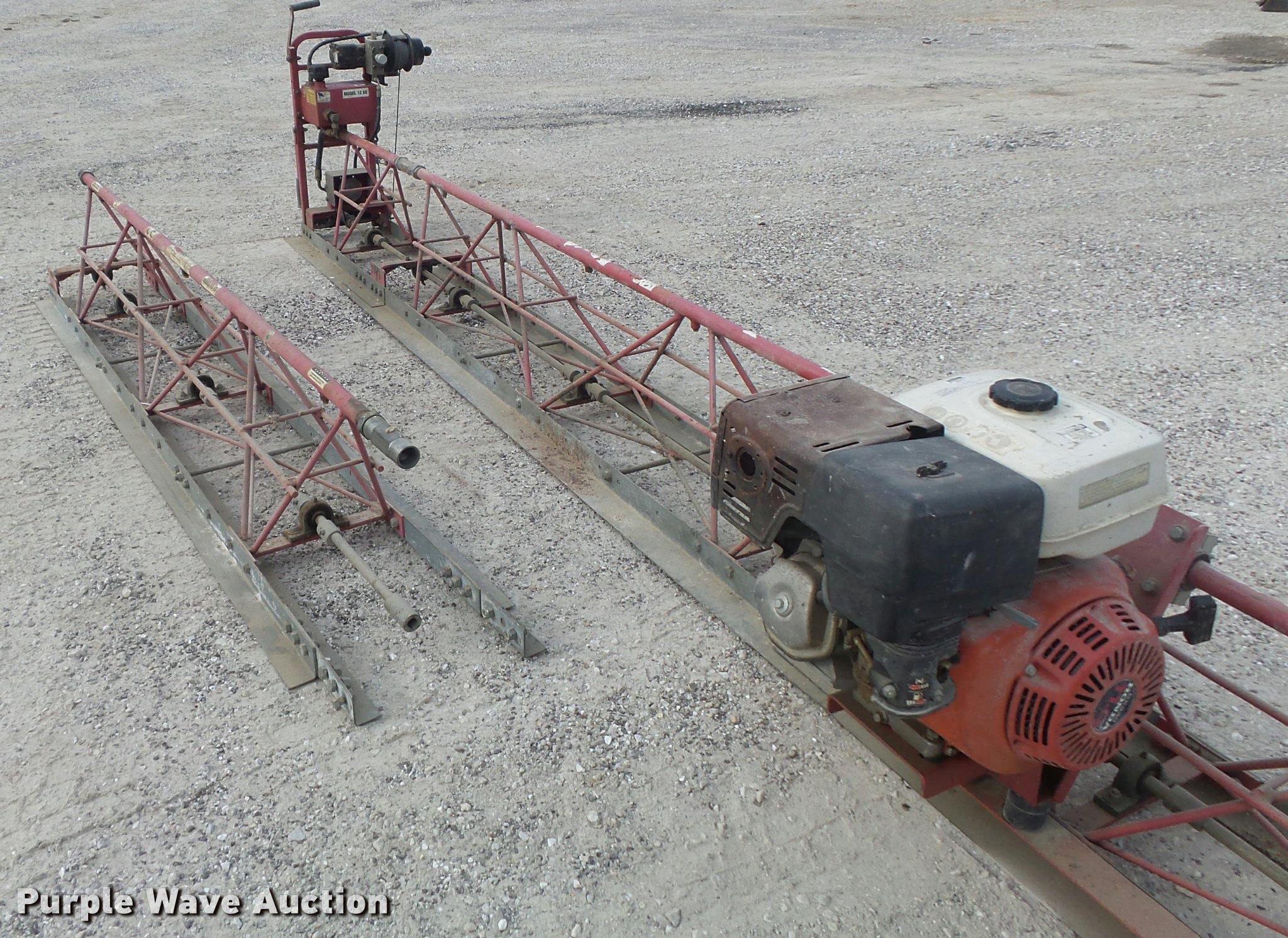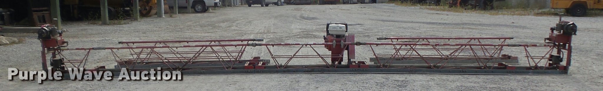 Allen Engineering Razorback 12ED power screed. Honda 11 HP single cylinder gas engine Recoil start, 25'L main truss frame assembly (2) 90" sections, (2) 30" sections with winches, 60" section with engine, (2) 90" additional sections, (2) hydraulic winches Variable speed control. Lincoln County. 219 Hwy H. Troy, MO 63379