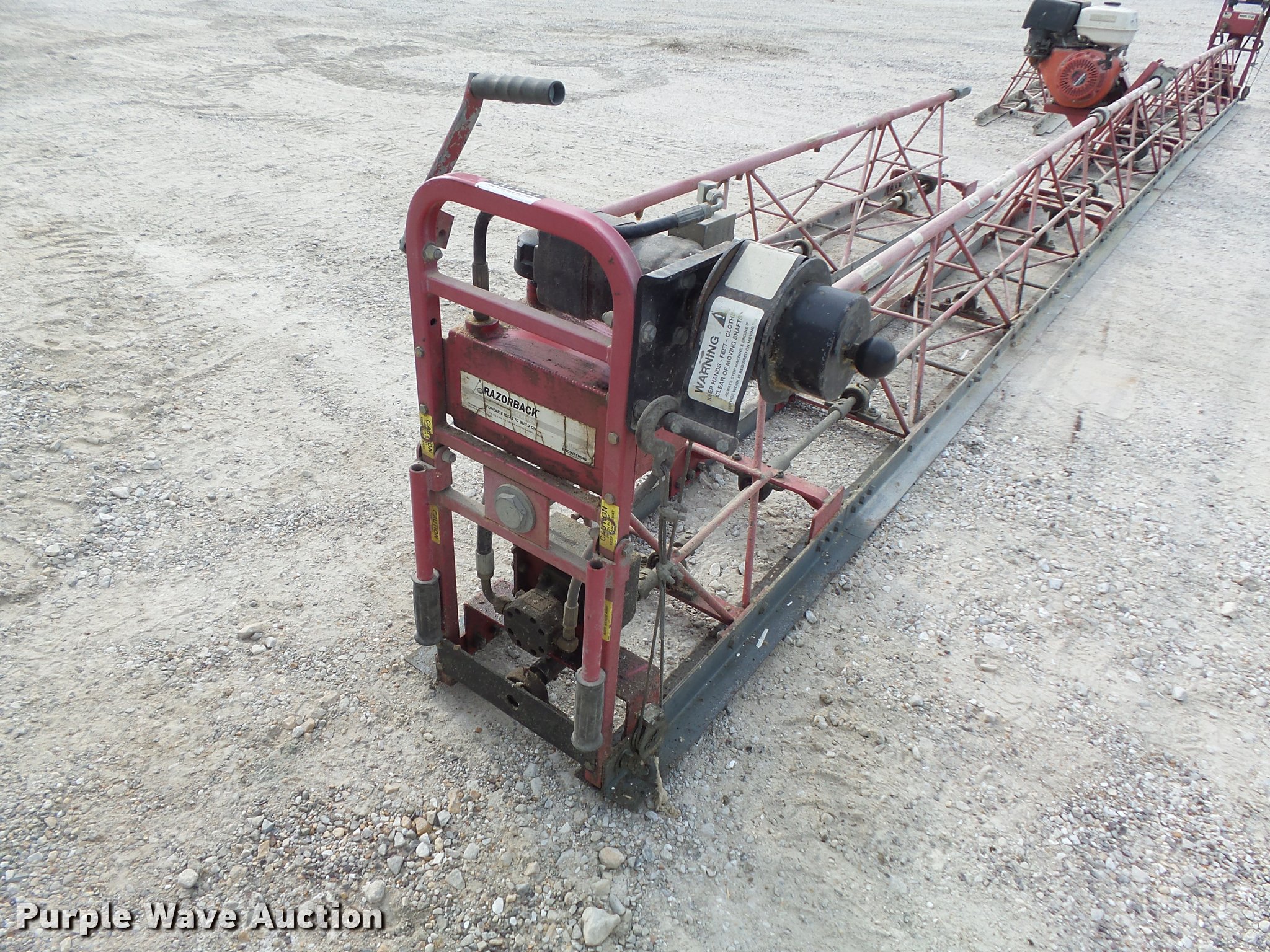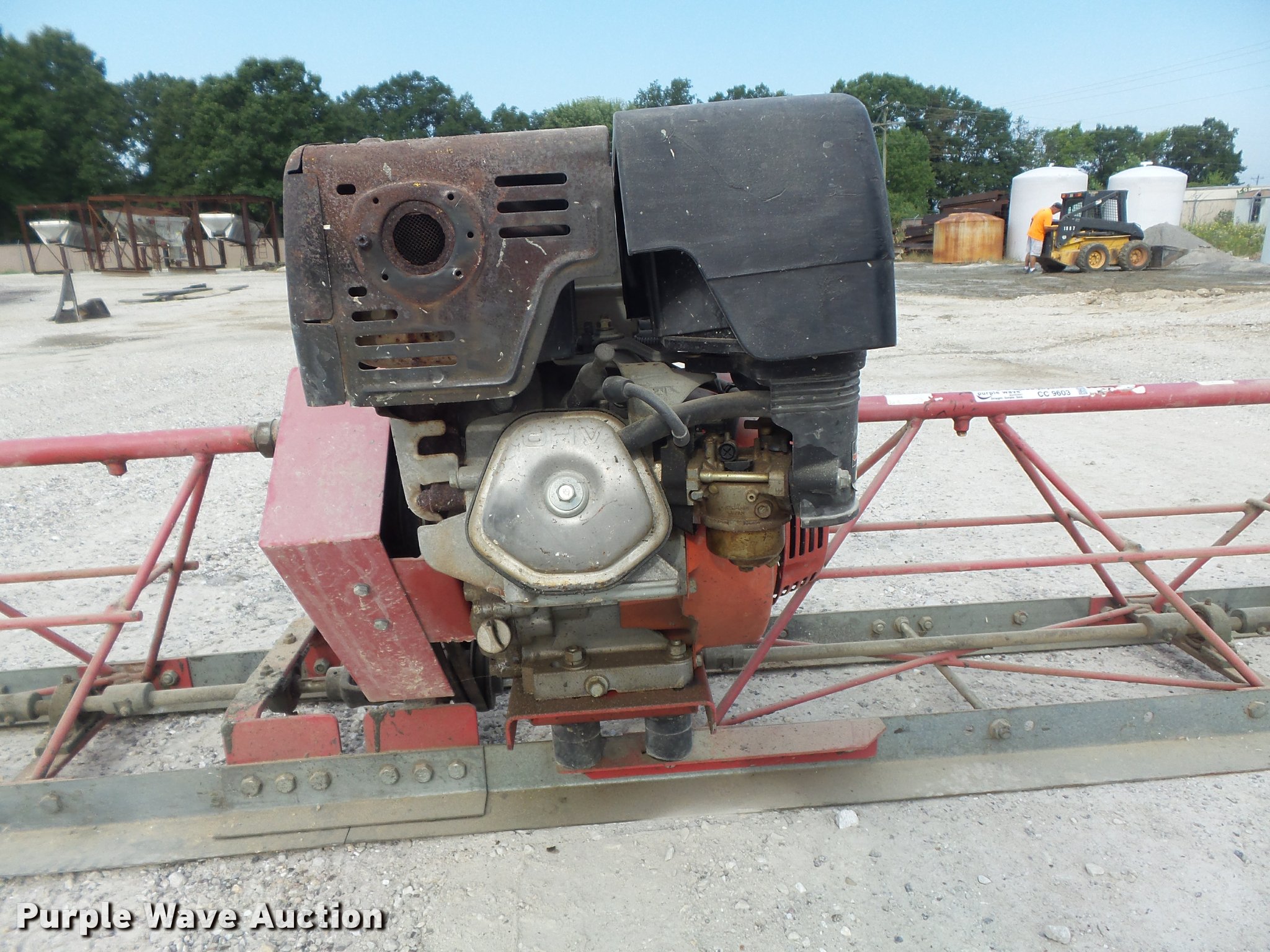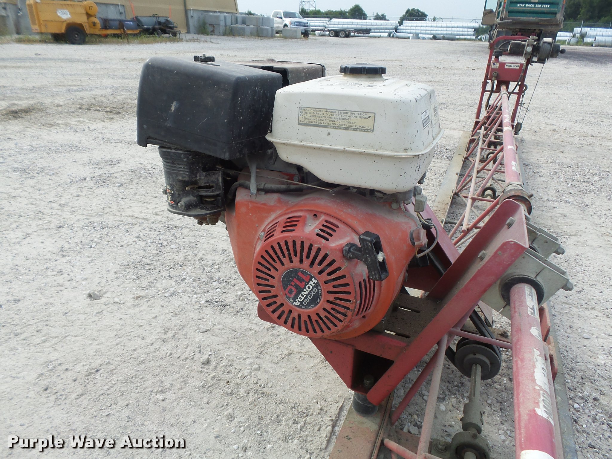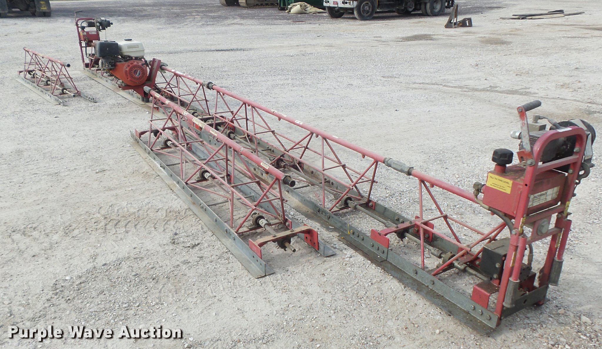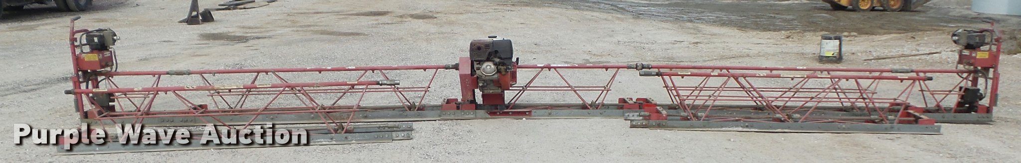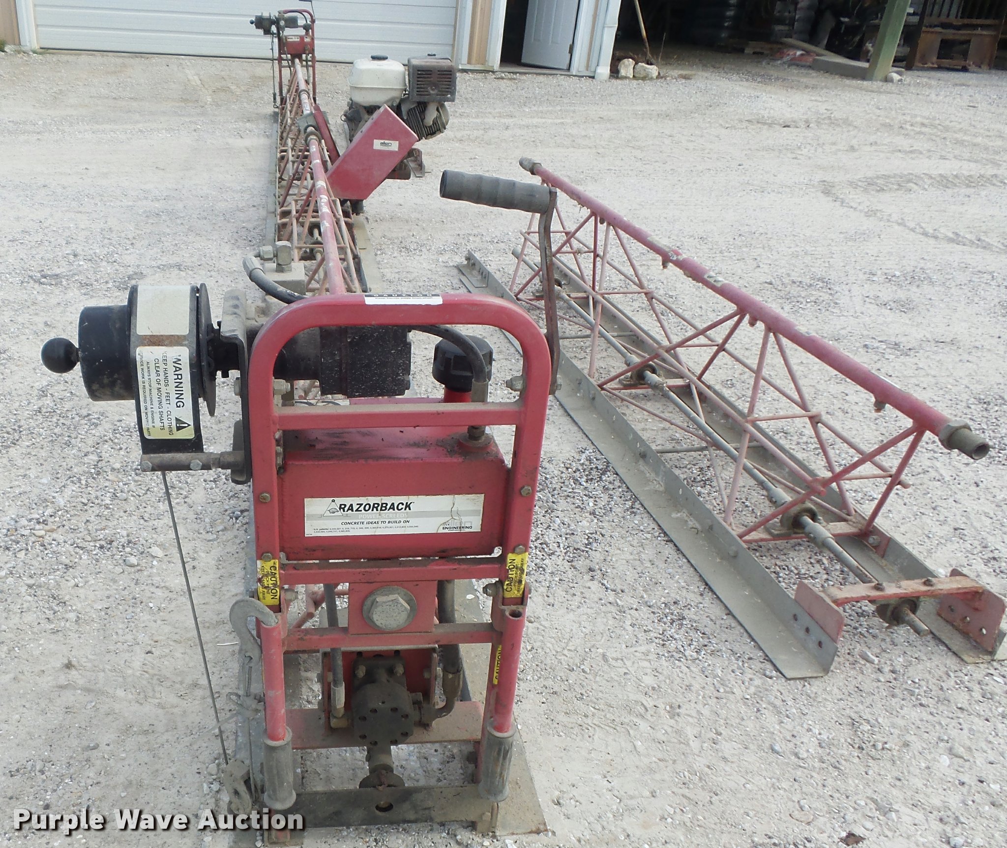 Allen Engineering Razorback 12ED power screed. Honda 11 HP single cylinder gas engine Recoil start, 25'L main truss frame assembly (2) 90" sections, (2) 30" sections with winches, 60" section with engine, (2) 90" additional sections, (2) hydraulic winches Variable speed control. Lincoln County. 219 Hwy H. Troy, MO 63379
