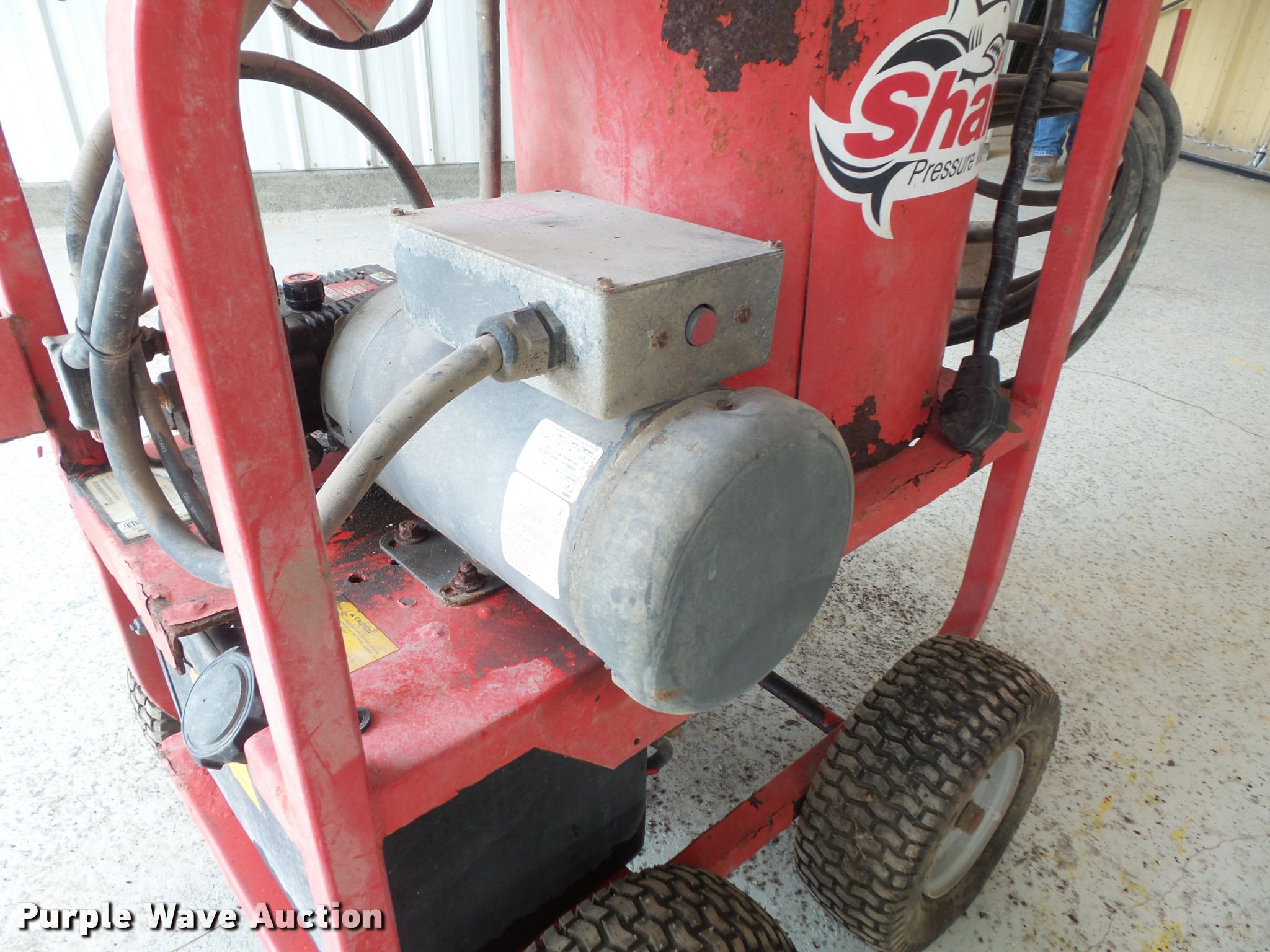Purple Wave is selling a used Pressure Washer in Missouri. This item is a Shark STP-3520A pressure washer with the following: Diesel or kerosene burner, 2,000 psi, 3.5 gpm, Thermostat controlled temperature, Hose and wash wand, Electric motor making nose, possible bearing issue, Serial S0306-123910