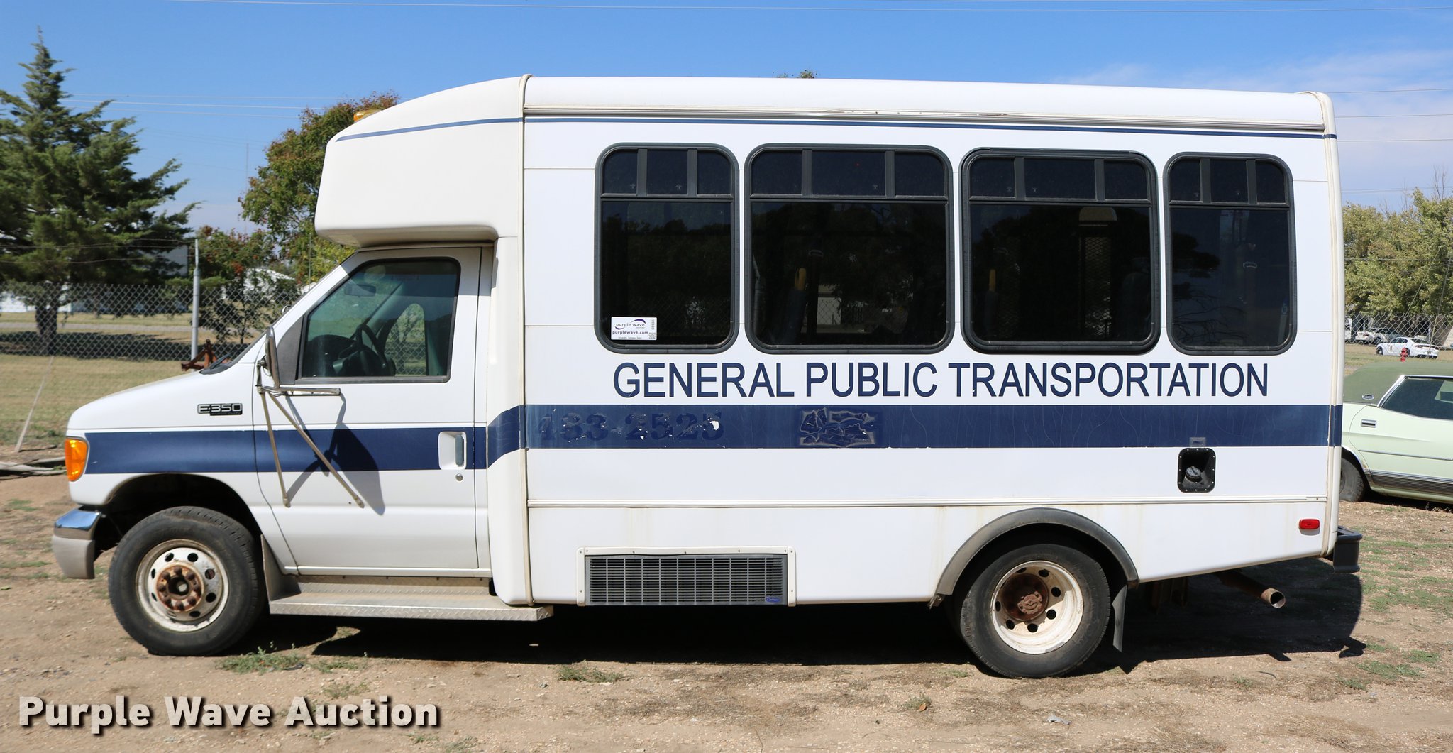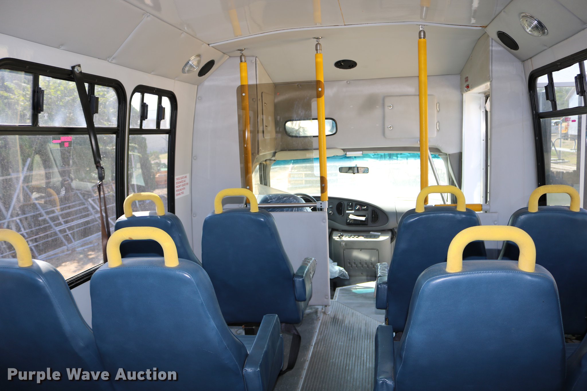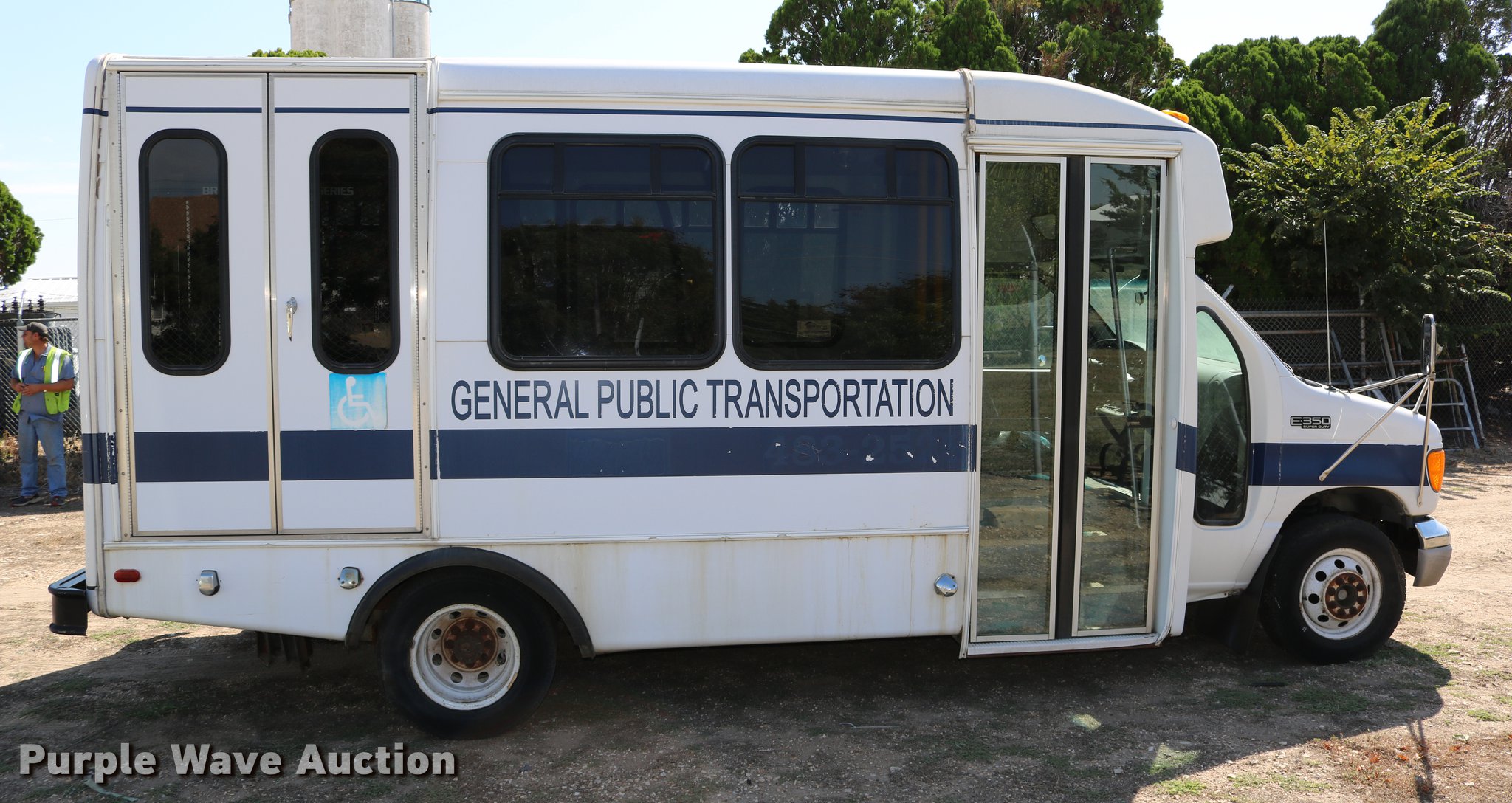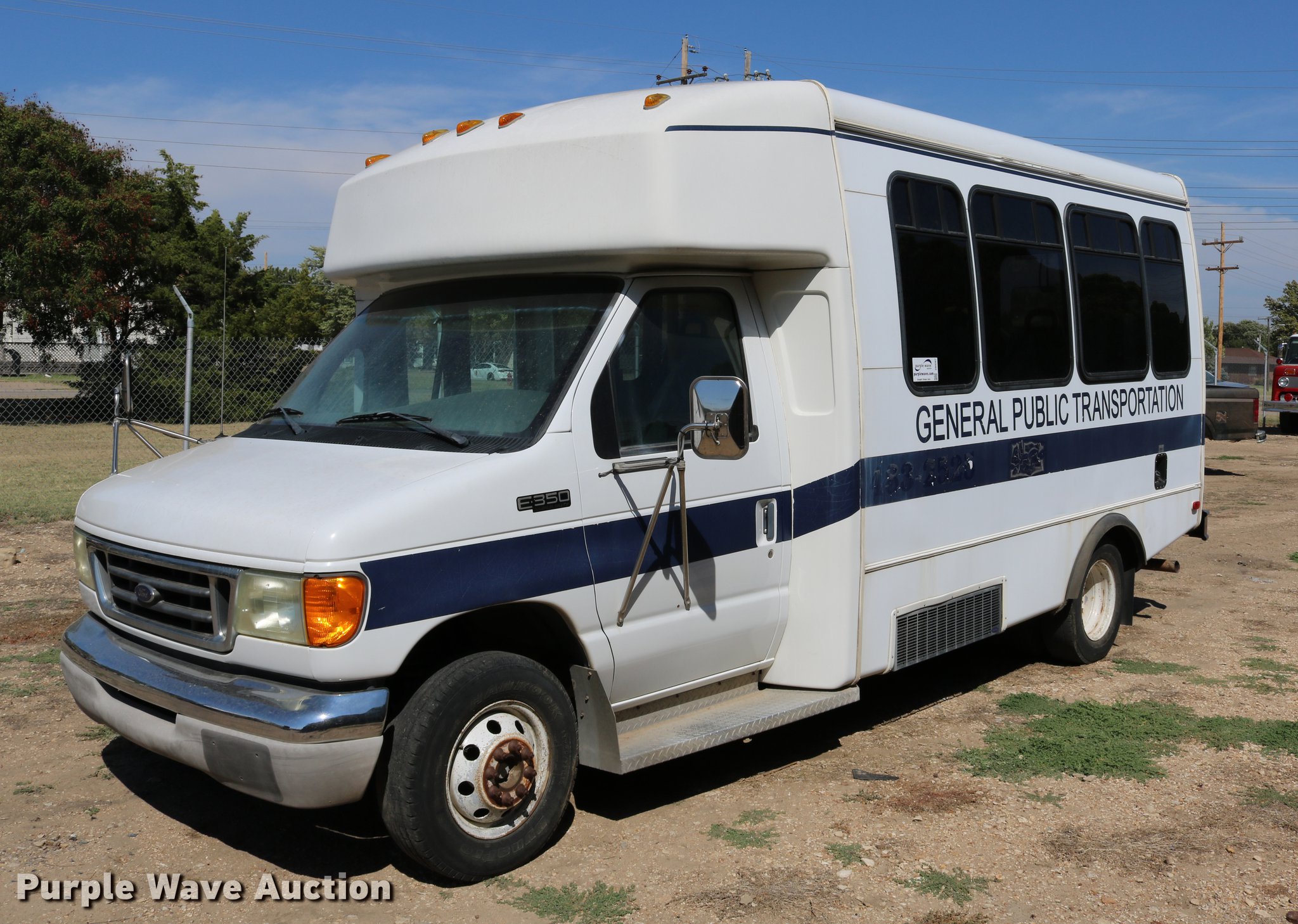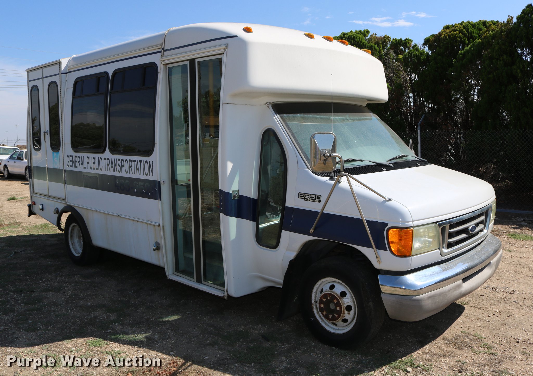 Purple Wave is selling a used Bus in Kansas. This item is a 2003 Ford E350 Super Duty shuttle bus with the following: 139,462 miles on odometer, 6.8L V10 SOHC 20V gas engine, Automatic transmission, Single axle, AC and heat, Cruise, AM/FM/cassette, Power drivers seat, Electric passenger door, 10 passenger capacity, Braun L917FIB wheelchair lift, Ceiling, rear, and side emergency exits, Carrier EM-02 roof AC unit, Backup alarm, 158" wheelbase, 225/75R16 tires, GVWR 11,500 lbs