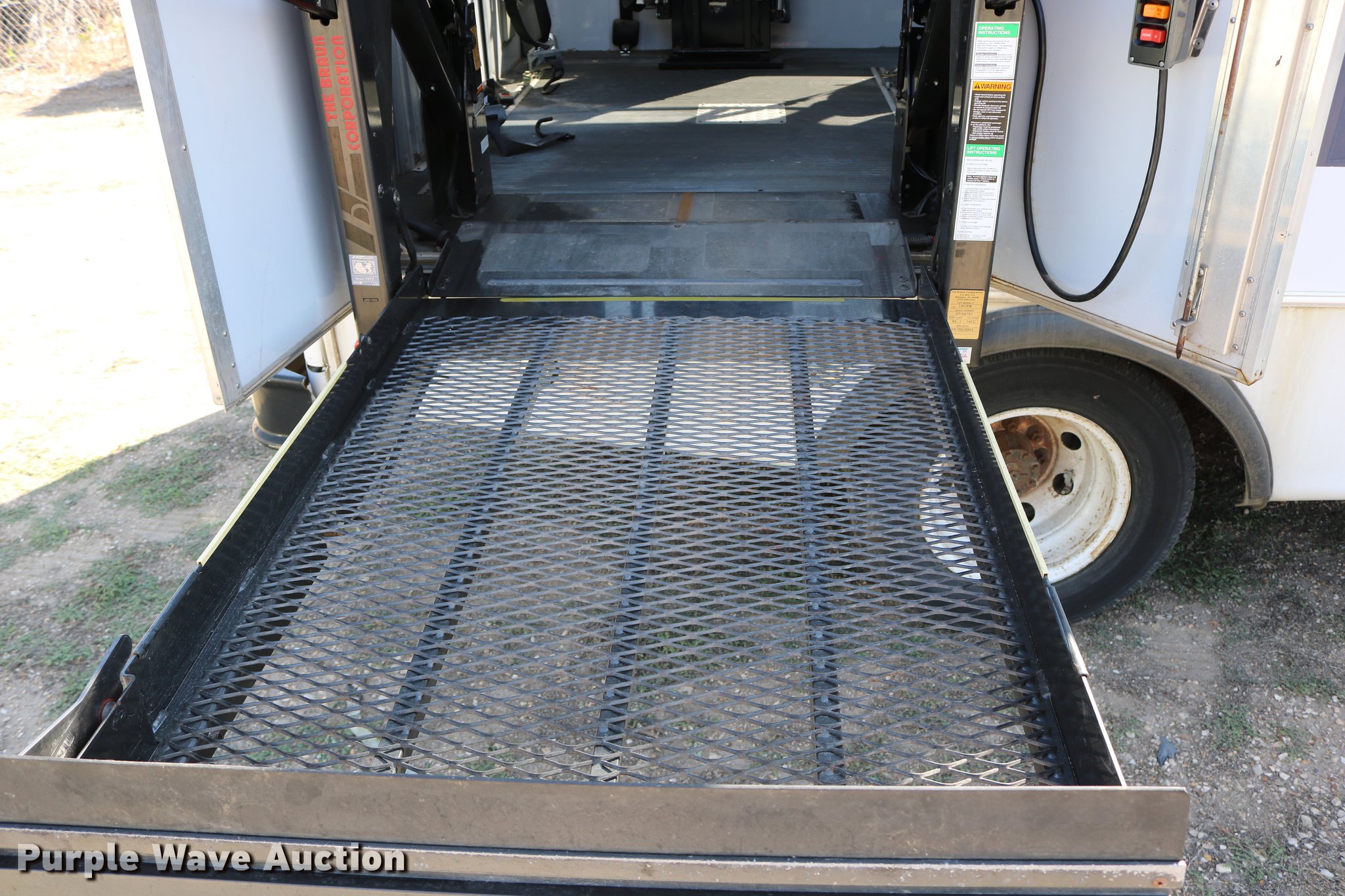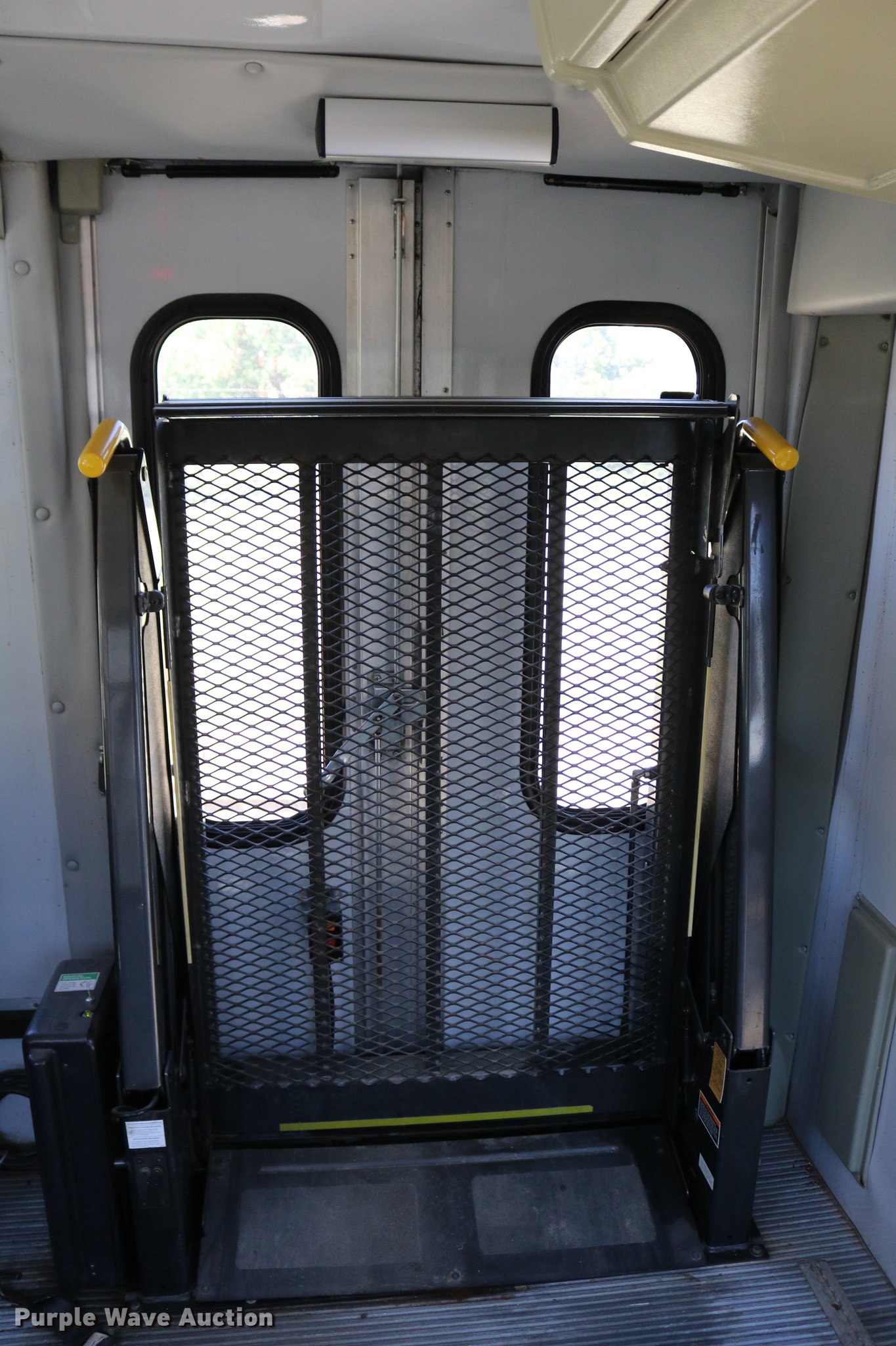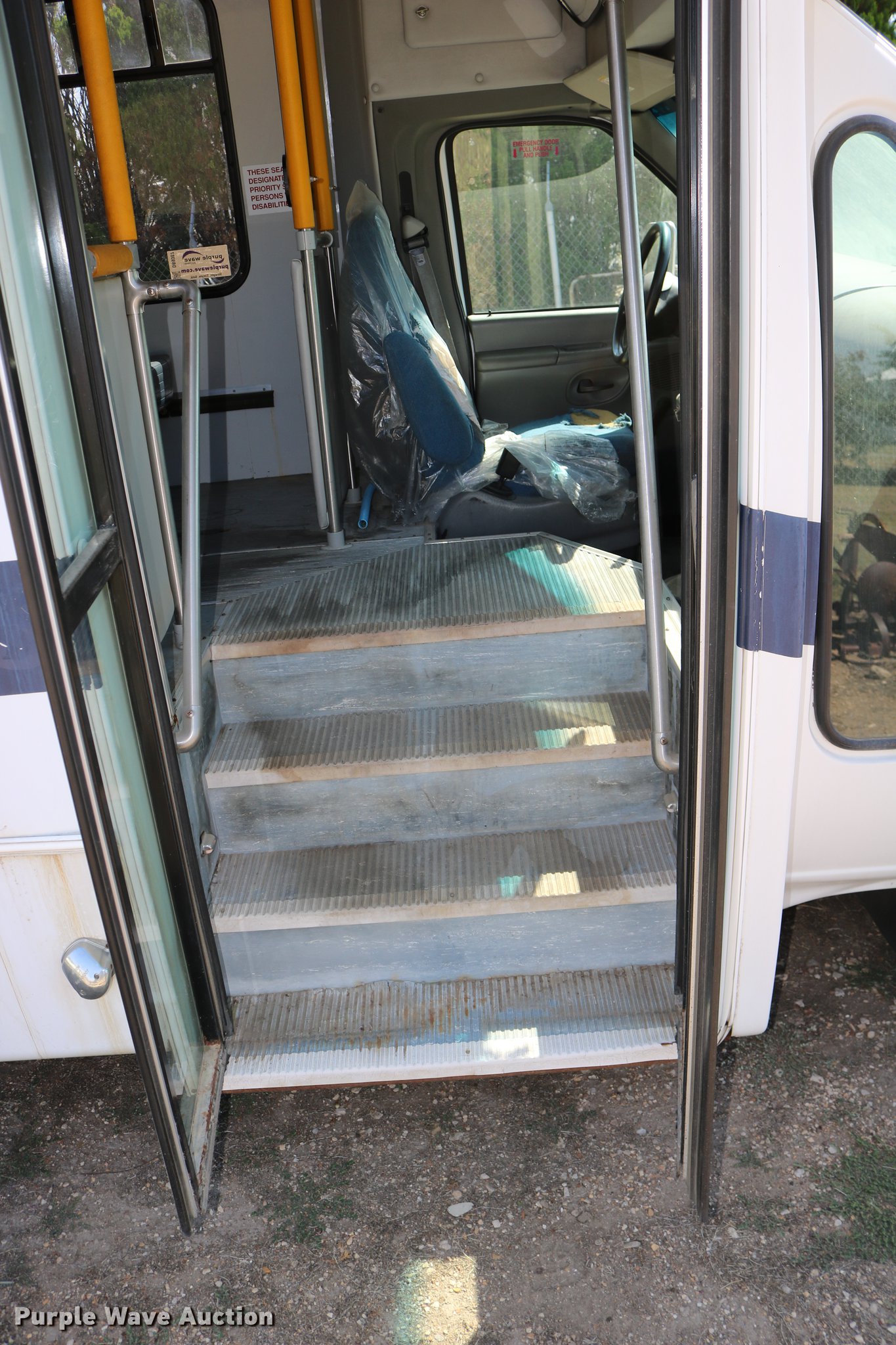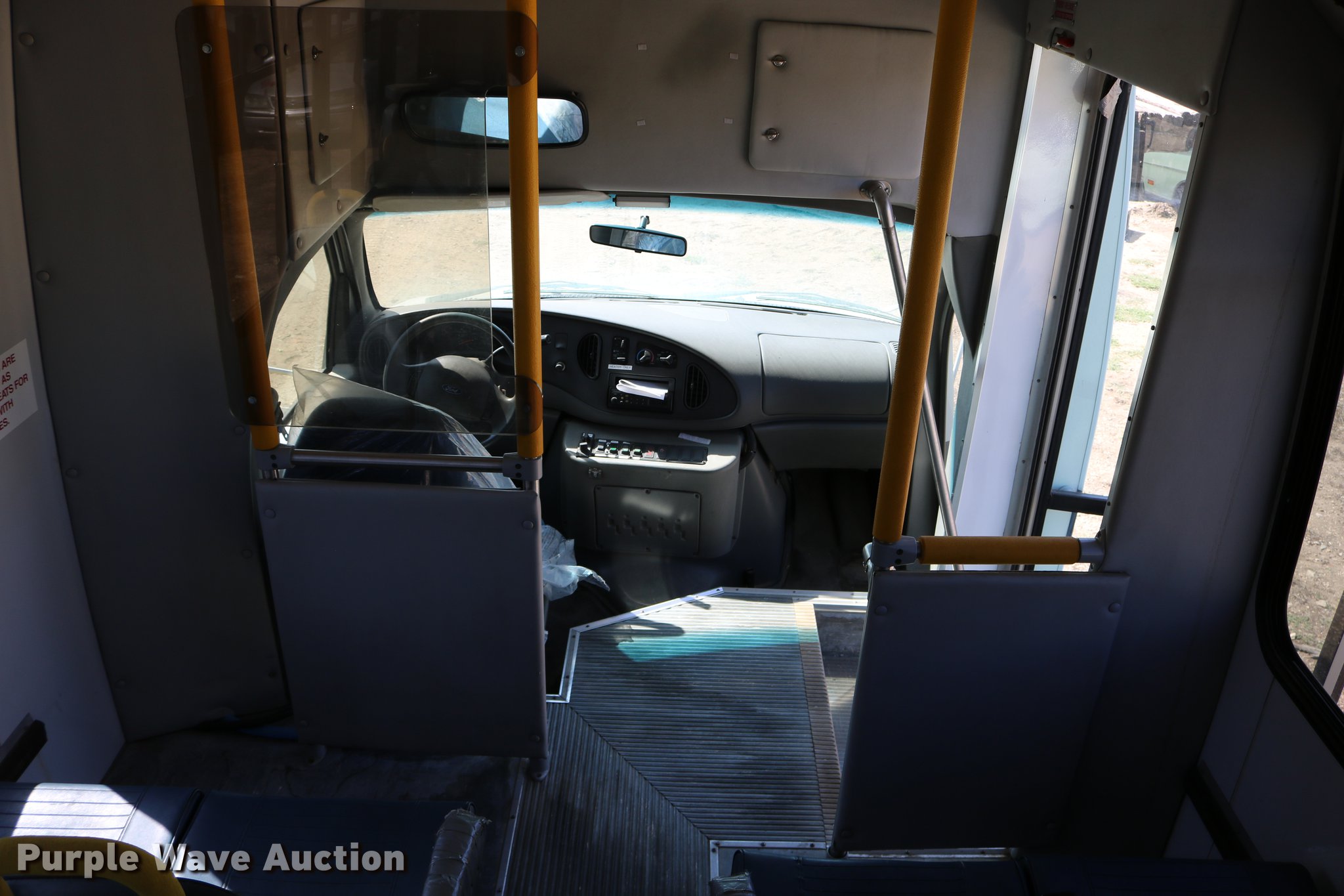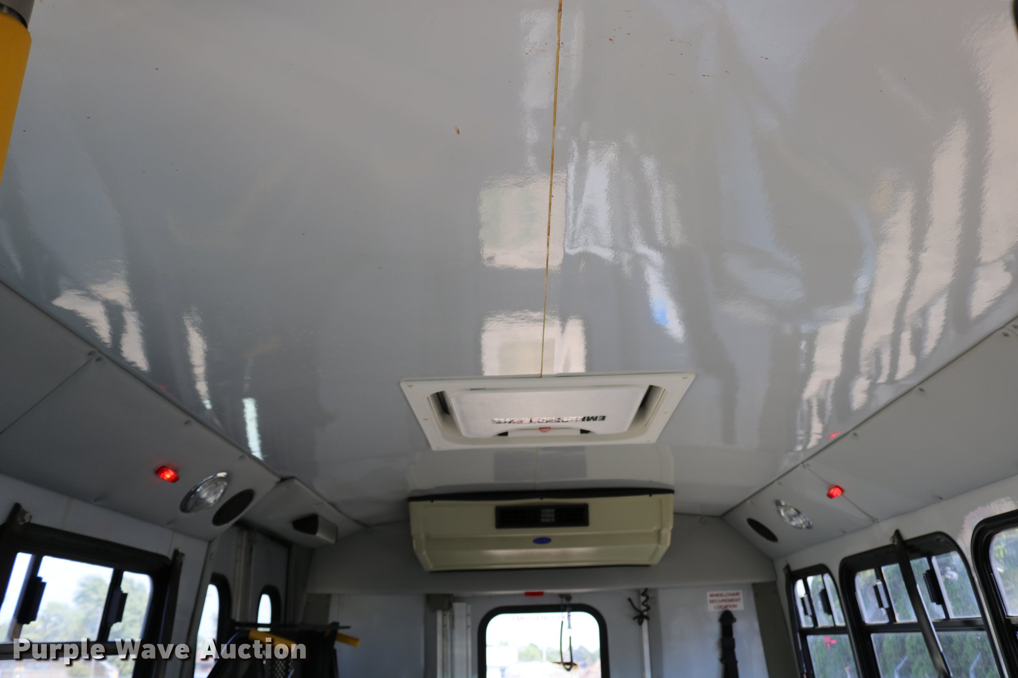 Purple Wave is selling a used Bus in Kansas. This item is a 2003 Ford E350 Super Duty shuttle bus with the following: 139,462 miles on odometer, 6.8L V10 SOHC 20V gas engine, Automatic transmission, Single axle, AC and heat, Cruise, AM/FM/cassette, Power drivers seat, Electric passenger door, 10 passenger capacity, Braun L917FIB wheelchair lift, Ceiling, rear, and side emergency exits, Carrier EM-02 roof AC unit, Backup alarm, 158" wheelbase, 225/75R16 tires, GVWR 11,500 lbs