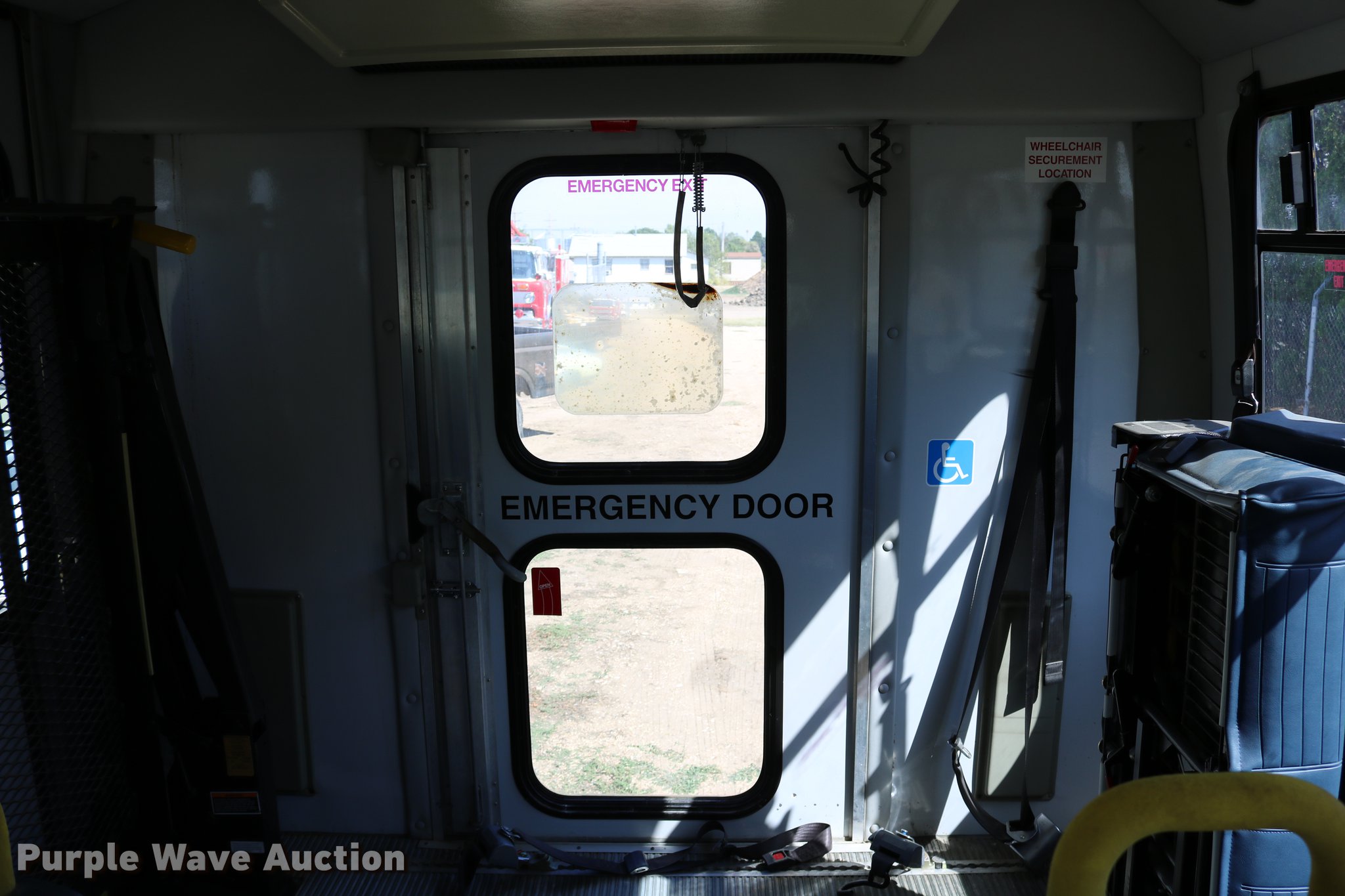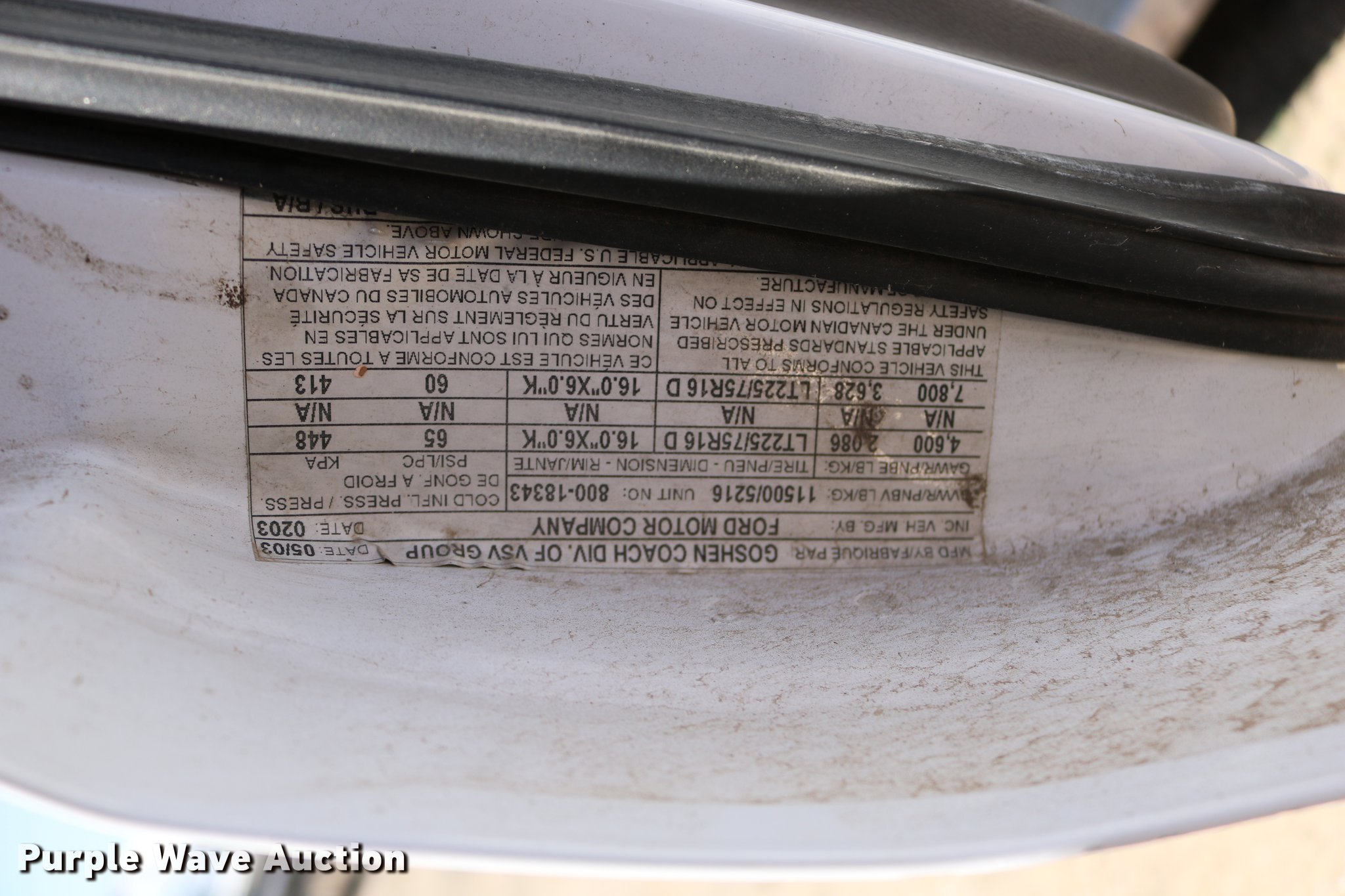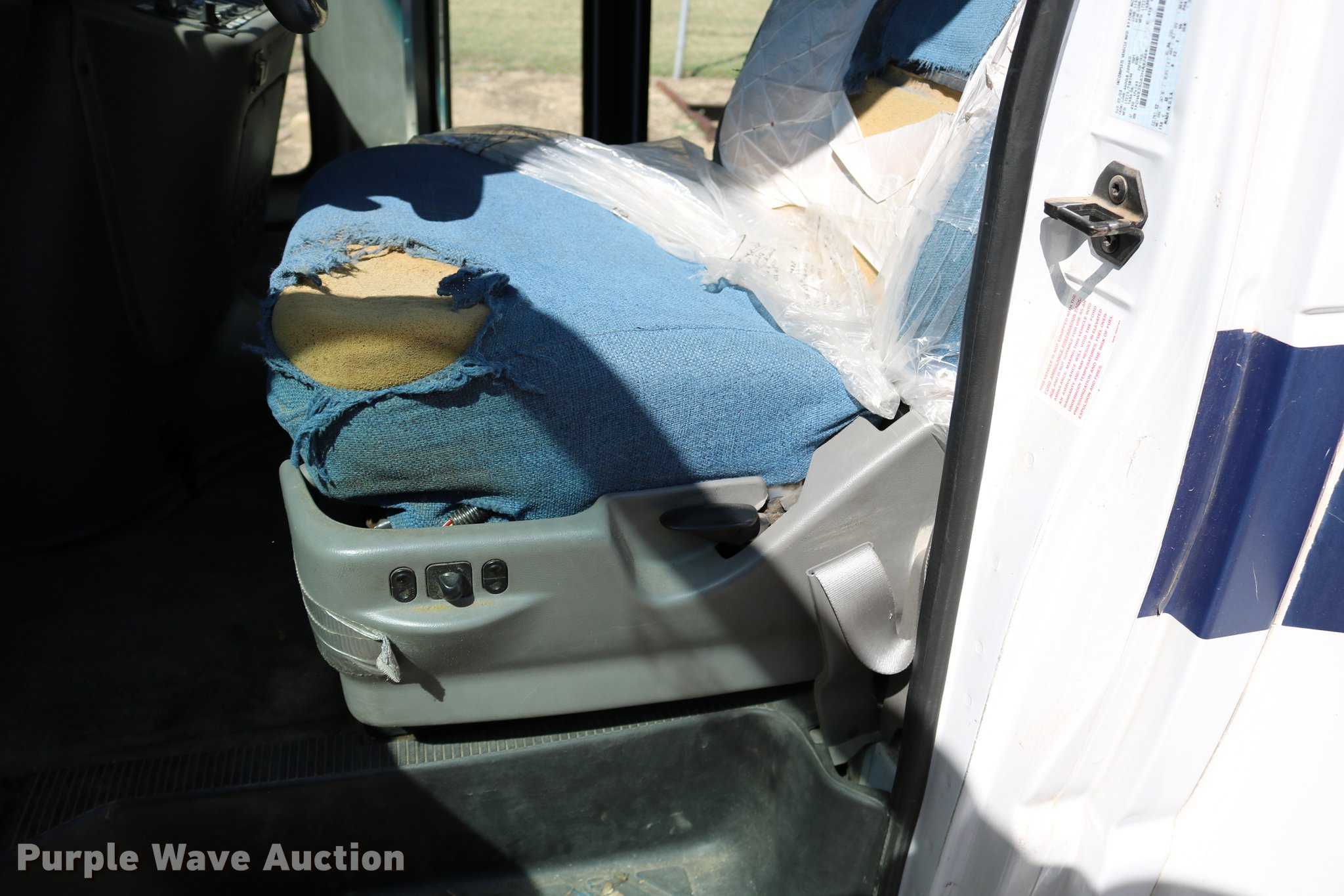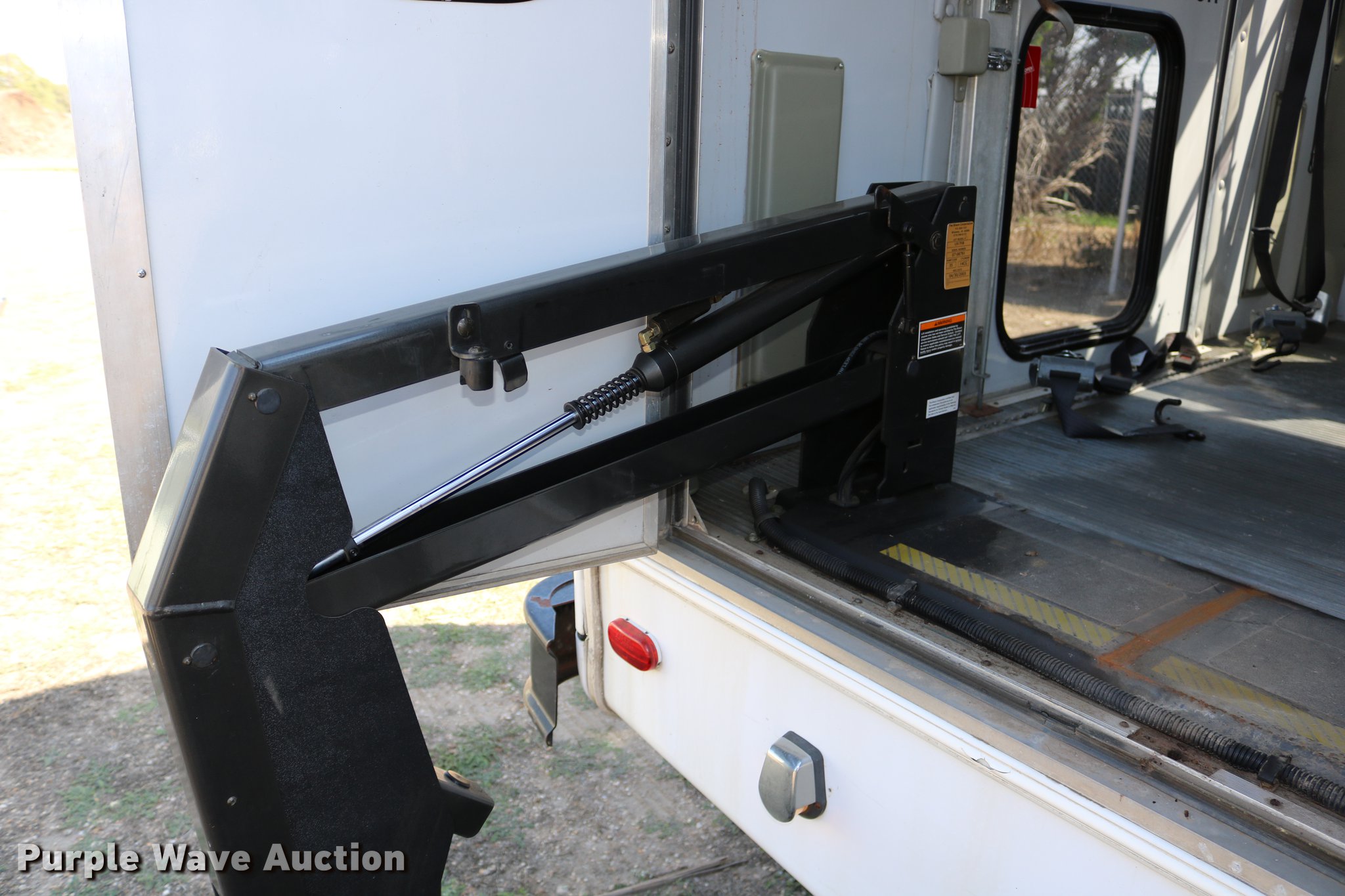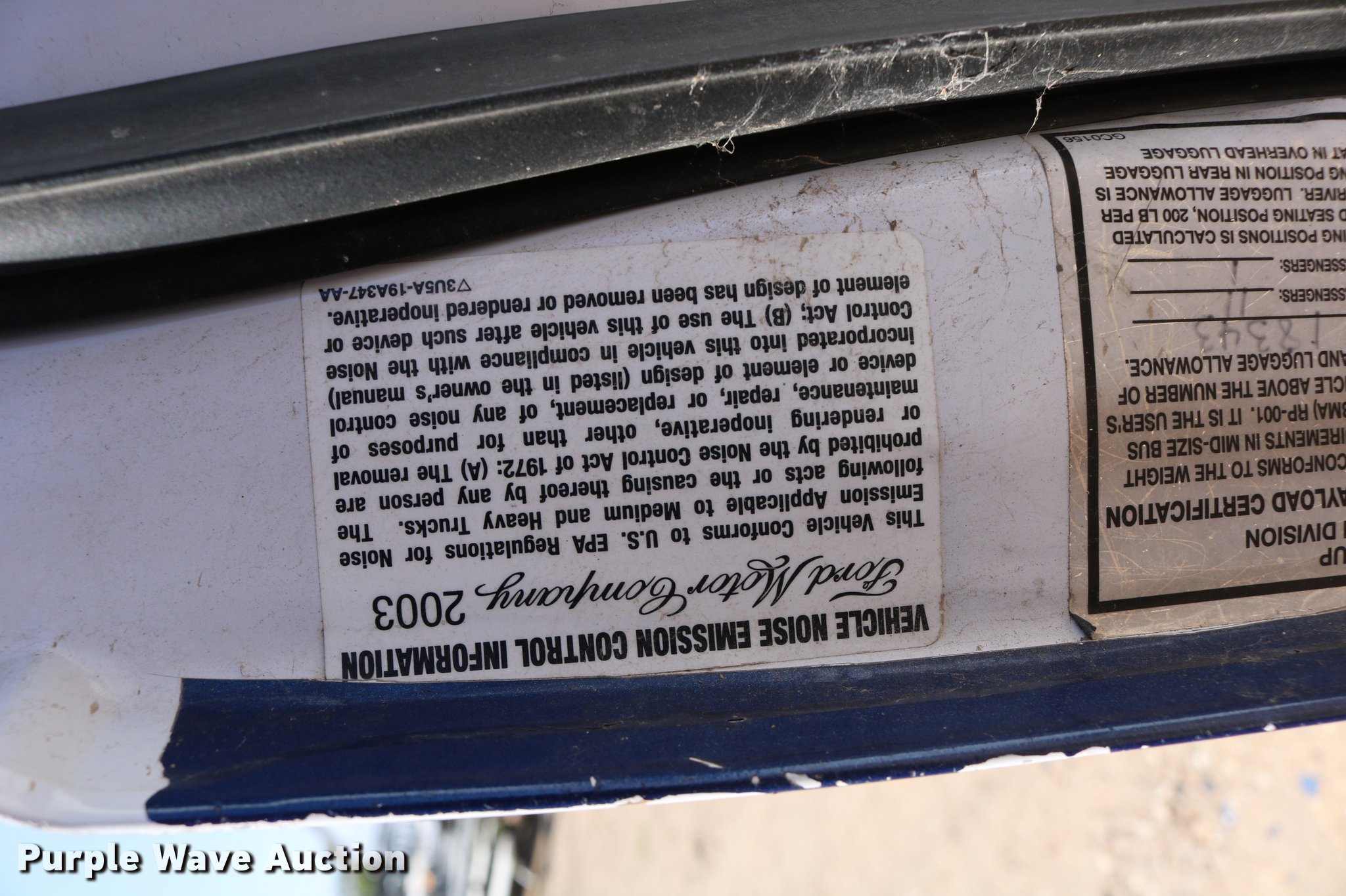 Purple Wave is selling a used Bus in Kansas. This item is a 2003 Ford E350 Super Duty shuttle bus with the following: 139,462 miles on odometer, 6.8L V10 SOHC 20V gas engine, Automatic transmission, Single axle, AC and heat, Cruise, AM/FM/cassette, Power drivers seat, Electric passenger door, 10 passenger capacity, Braun L917FIB wheelchair lift, Ceiling, rear, and side emergency exits, Carrier EM-02 roof AC unit, Backup alarm, 158" wheelbase, 225/75R16 tires, GVWR 11,500 lbs