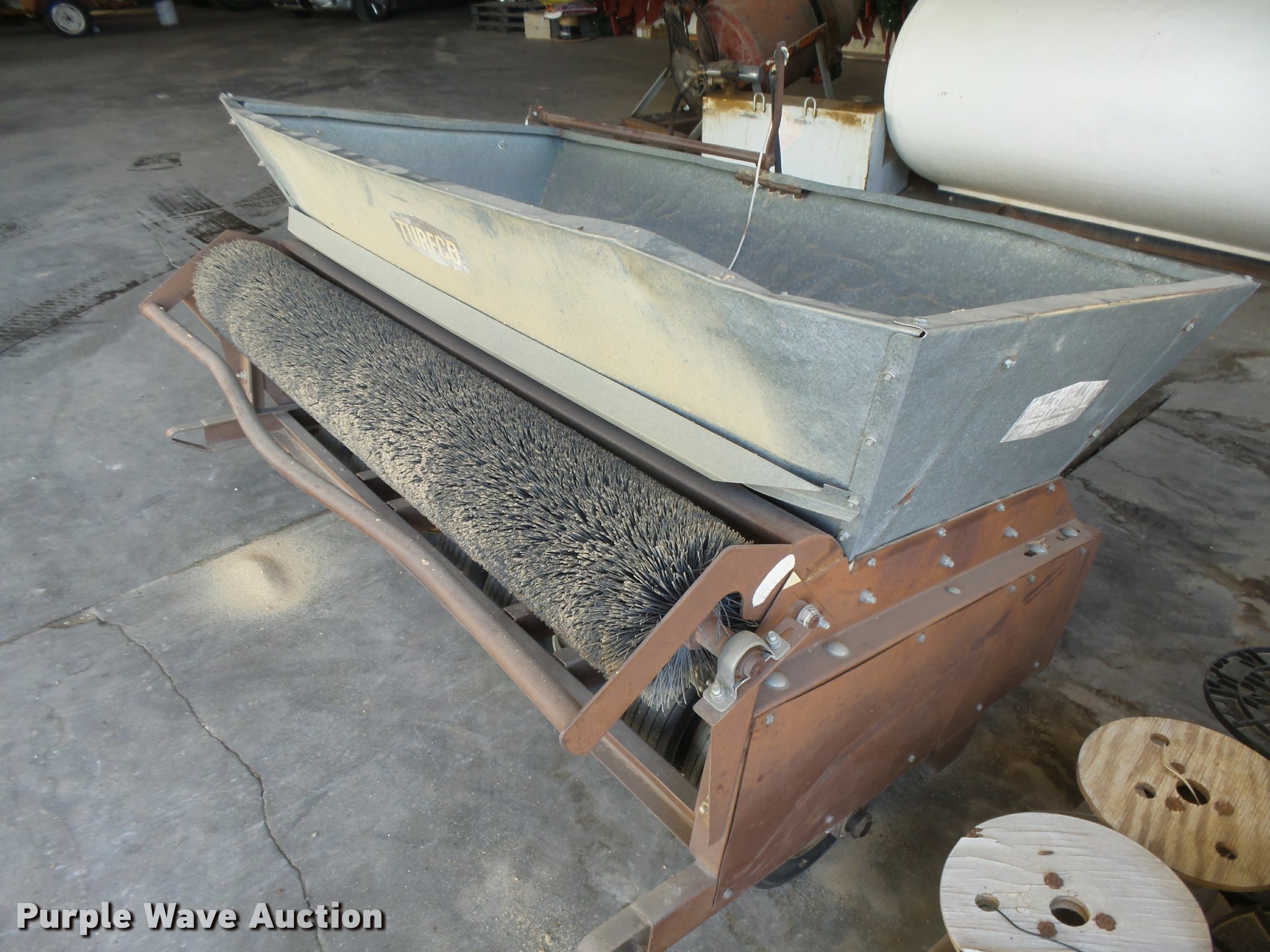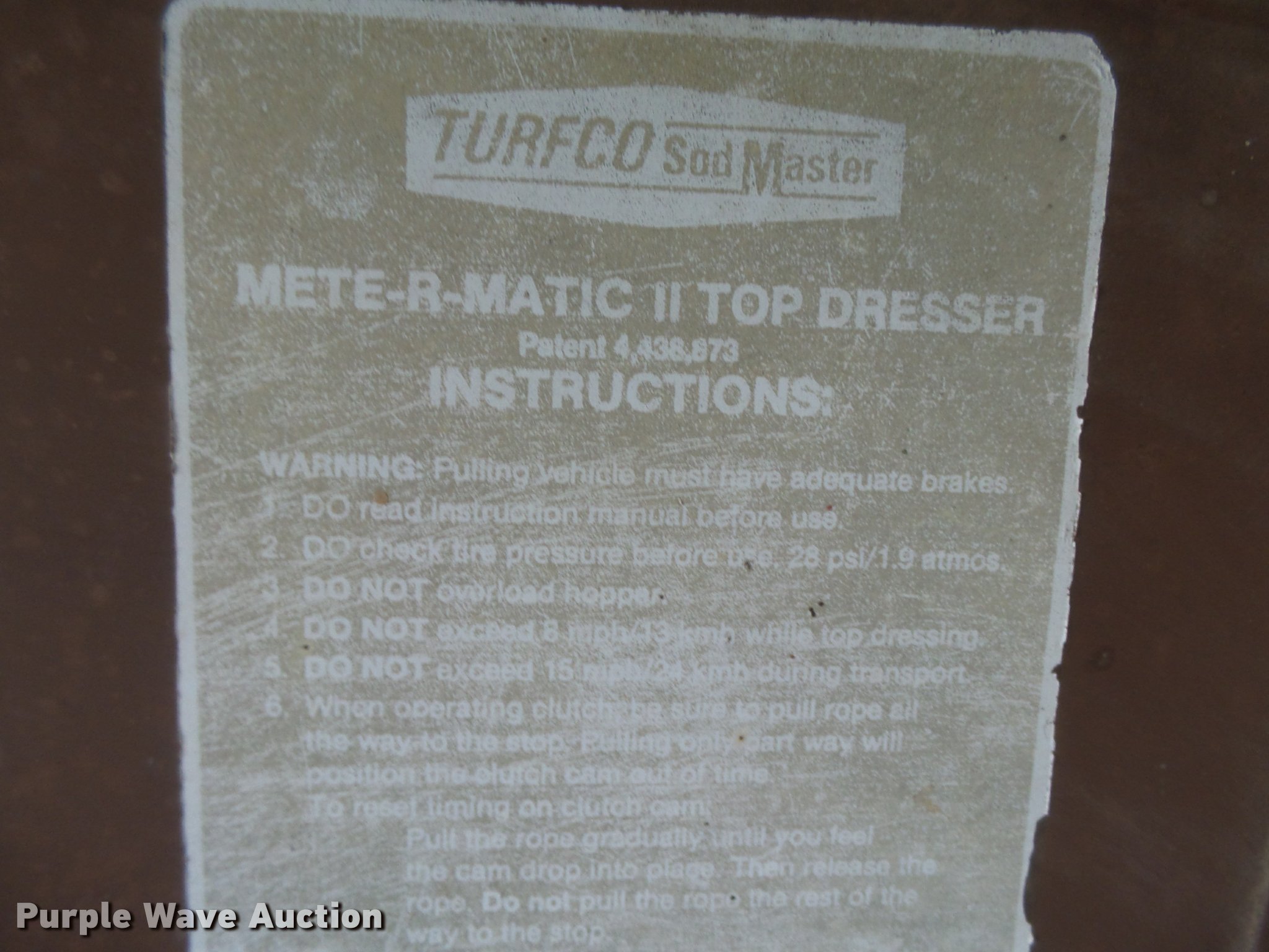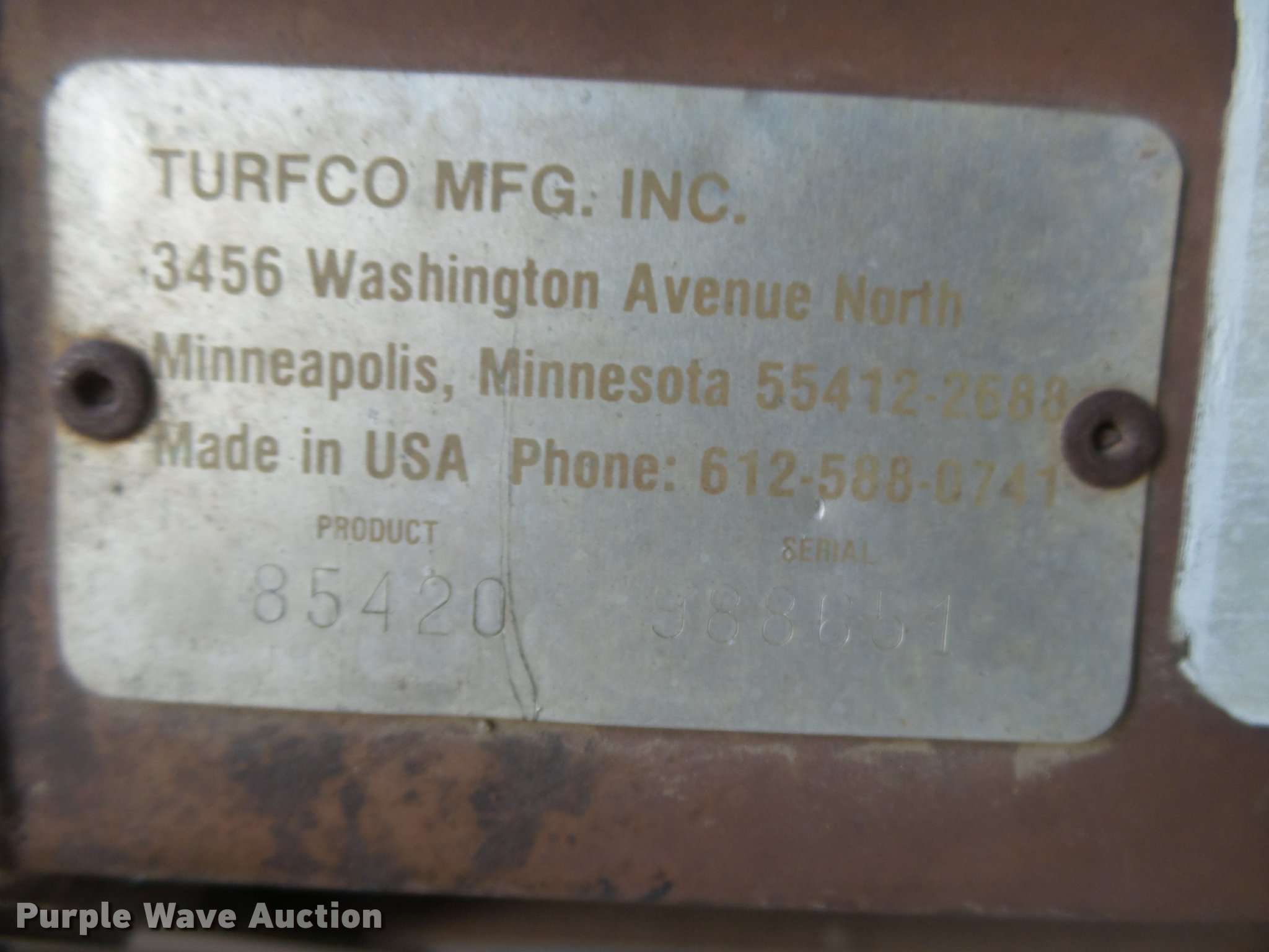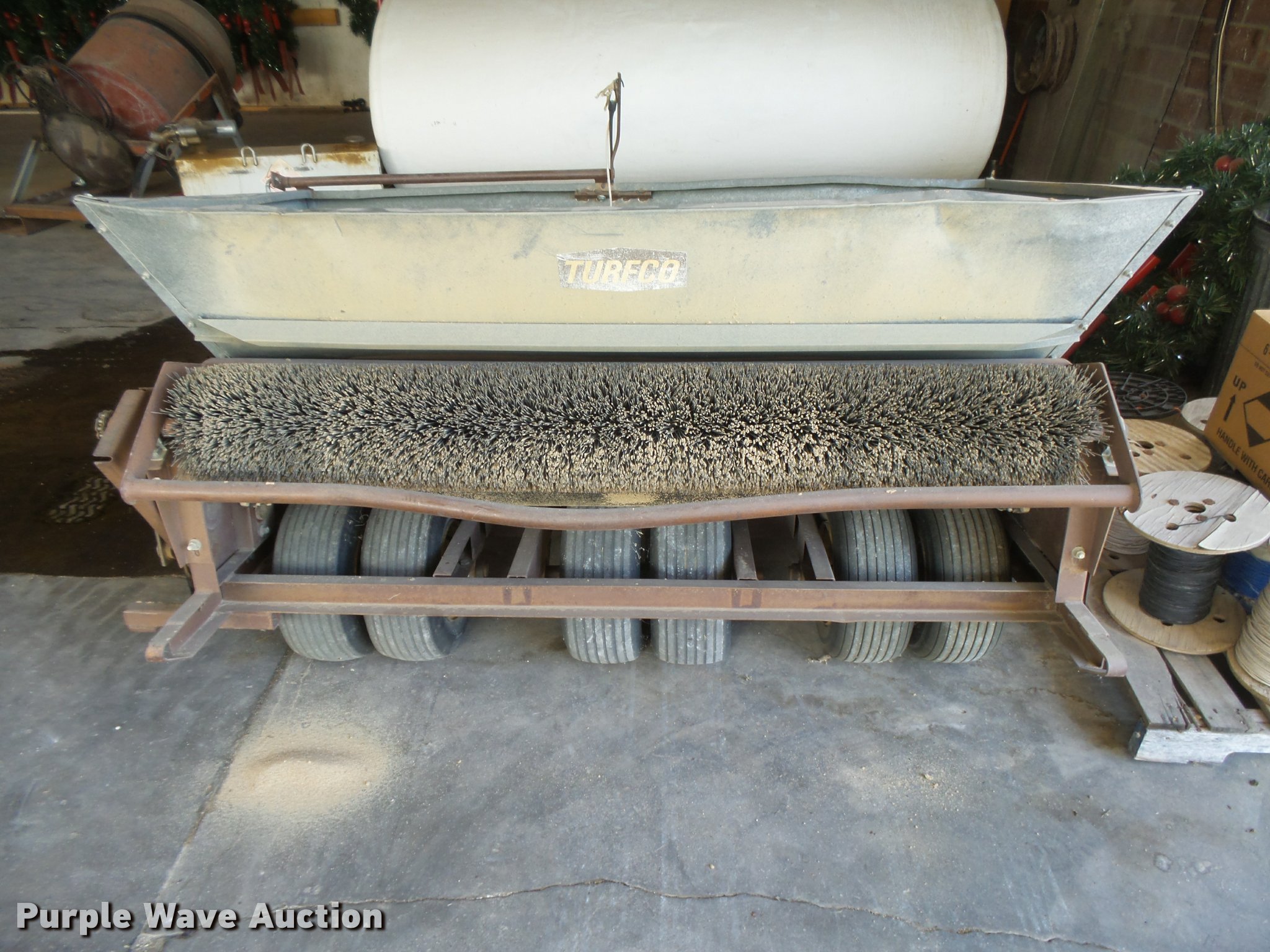 Purple Wave is selling a used Lawn and Garden in Kansas. This item is a Turfco 85420 sand spreader with the following: 66"W, Ground drive, Pin hitch, Metermatic II top dresser, Serial 988651