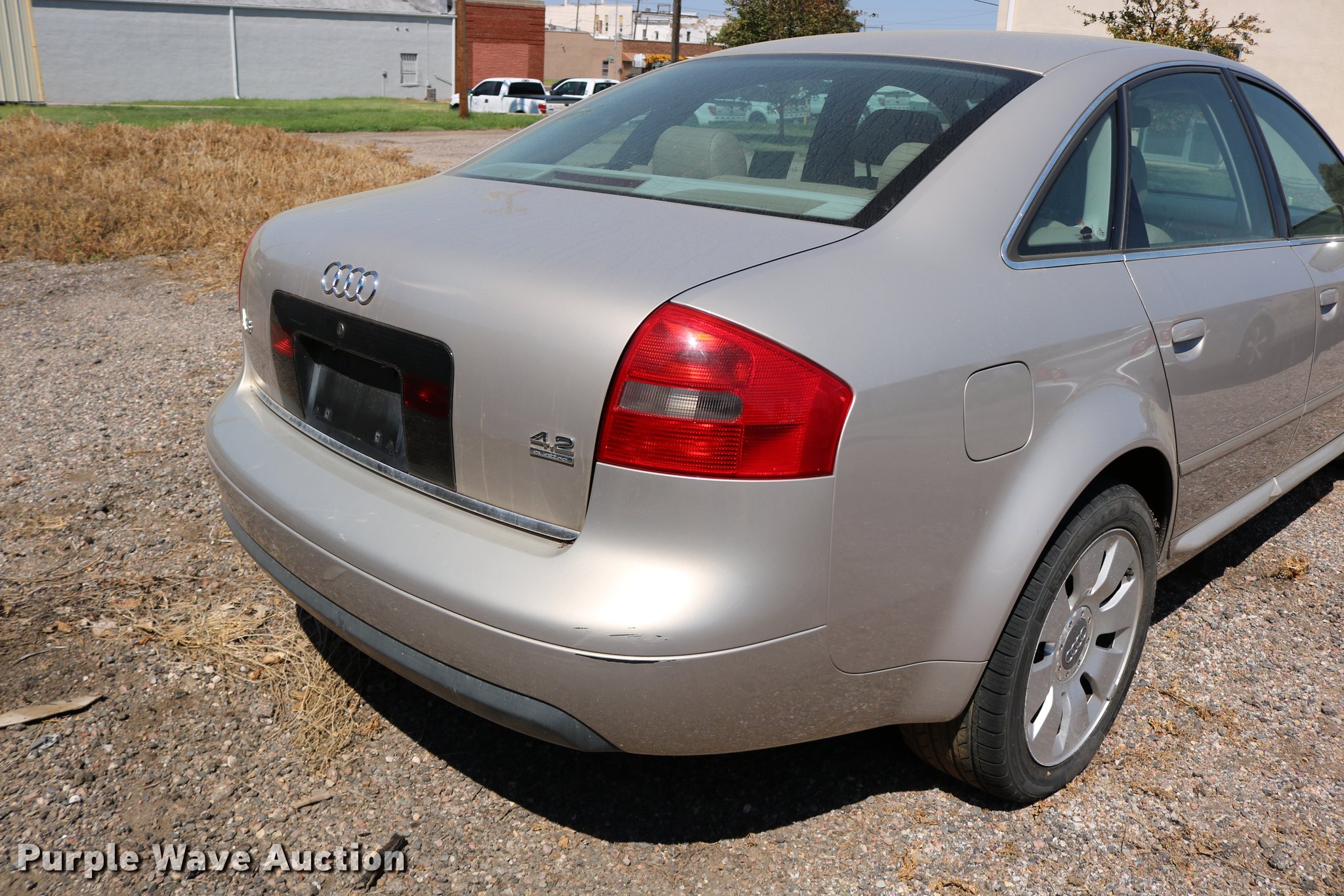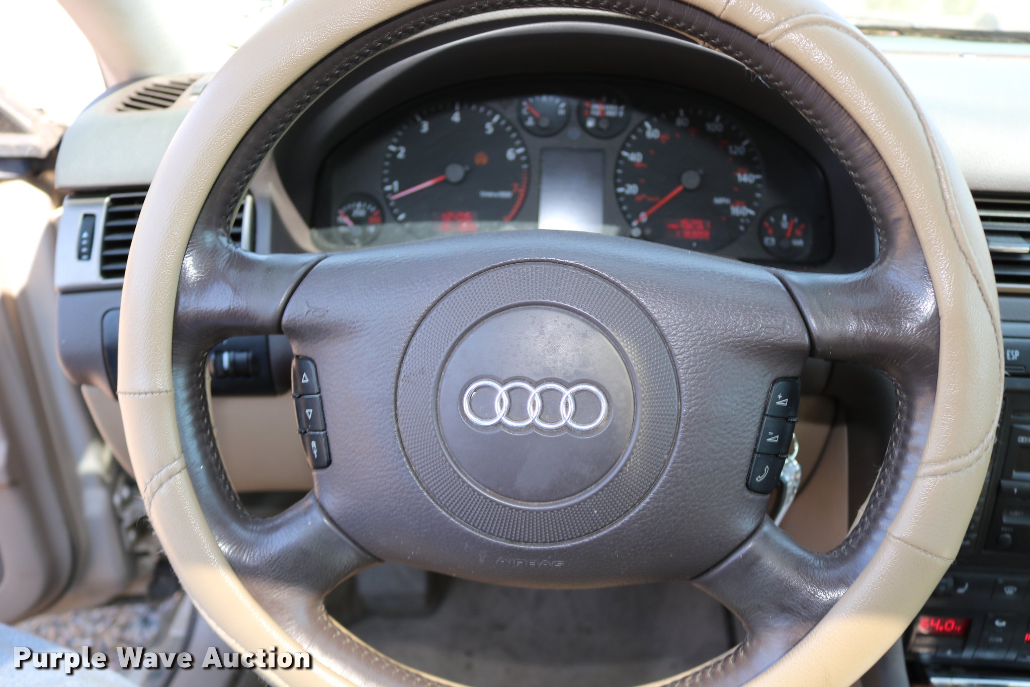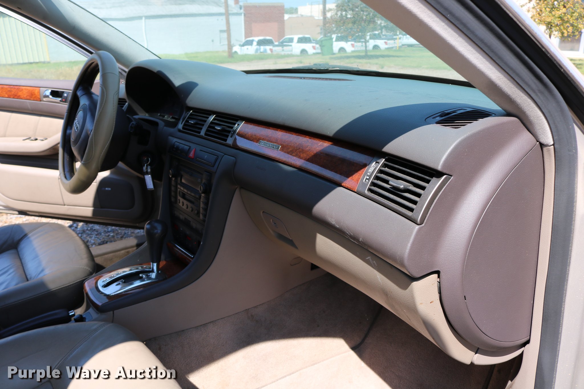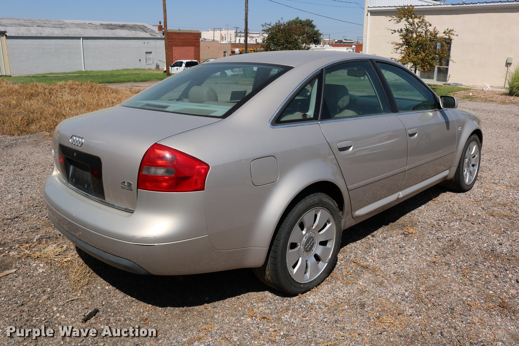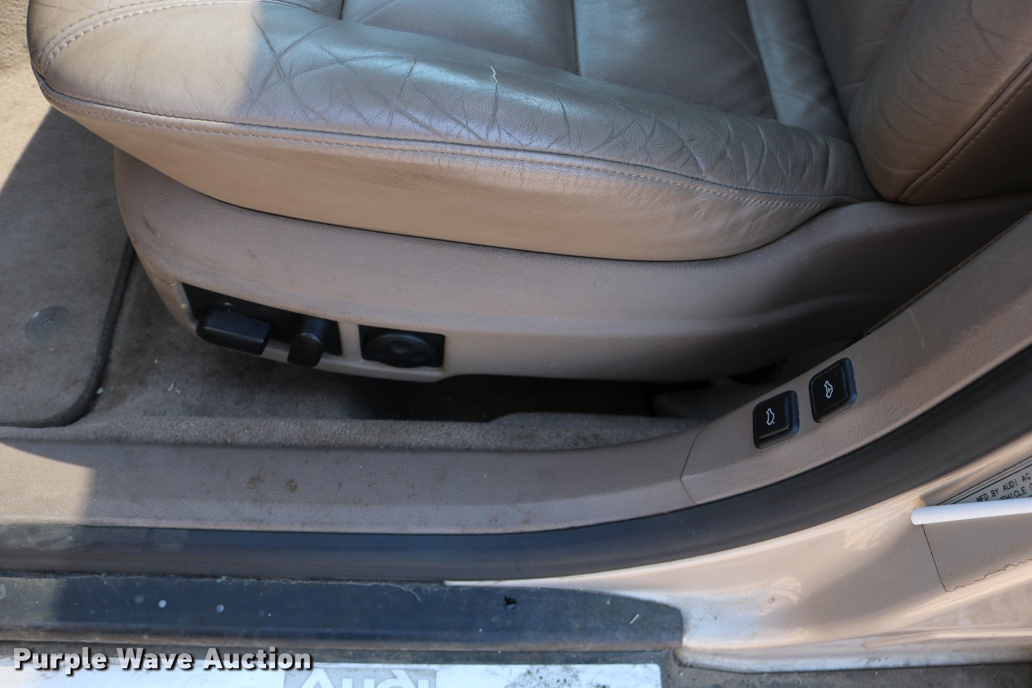 Purple Wave is selling a used Passenger Vehicle in Kansas. This item is a 2001 Audi A6 with the following: 116,809 miles on odometer, 4.2L V8 DOHC 40V gas engine, Automatic transmission, AC and heat, Tilt, Cruise, AM/FM/cassette, Power windows, locks, mirrors, and seats, Leather interior, Power sunroof, 245/45R17 tires, Weak battery, Unknown operating condition