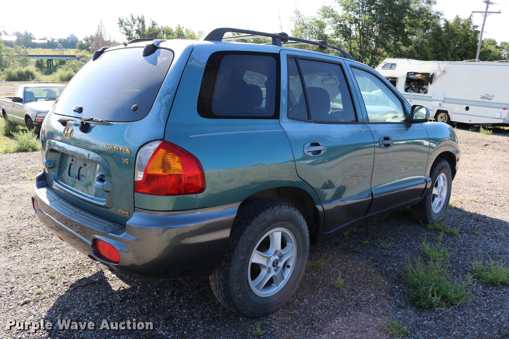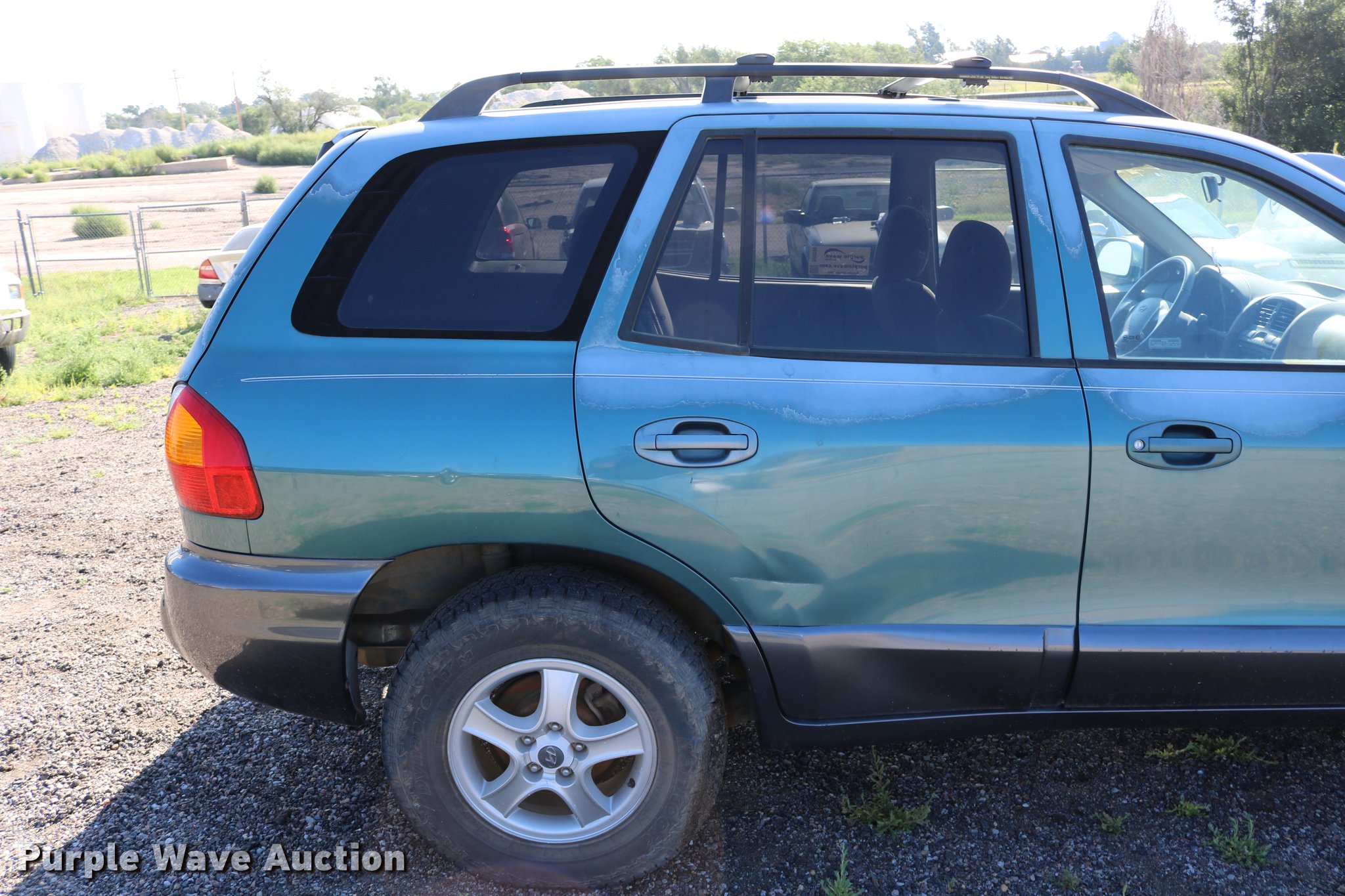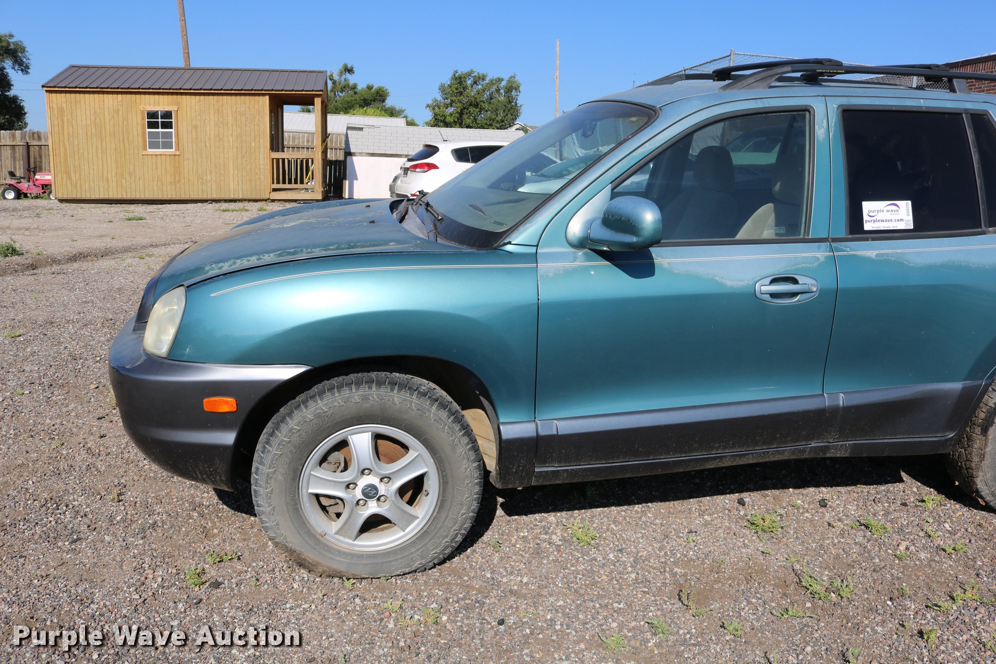Purple Wave is selling a used Passenger Vehicle in Kansas. This item is a 2002 Hyundai Santa Fe SUV with the following: 133,127 miles on odometer, 2.7L V6 DOHC 24V gas engine, Manual transmission, Four wheel drive, AC and heat, Tilt, Cruise, AM/FM/cassette, Power windows, locks, and mirrors, Cloth interior, Fog lights, 225/75R16 tires, Weak battery, Dash is loose, Unknown operating condition