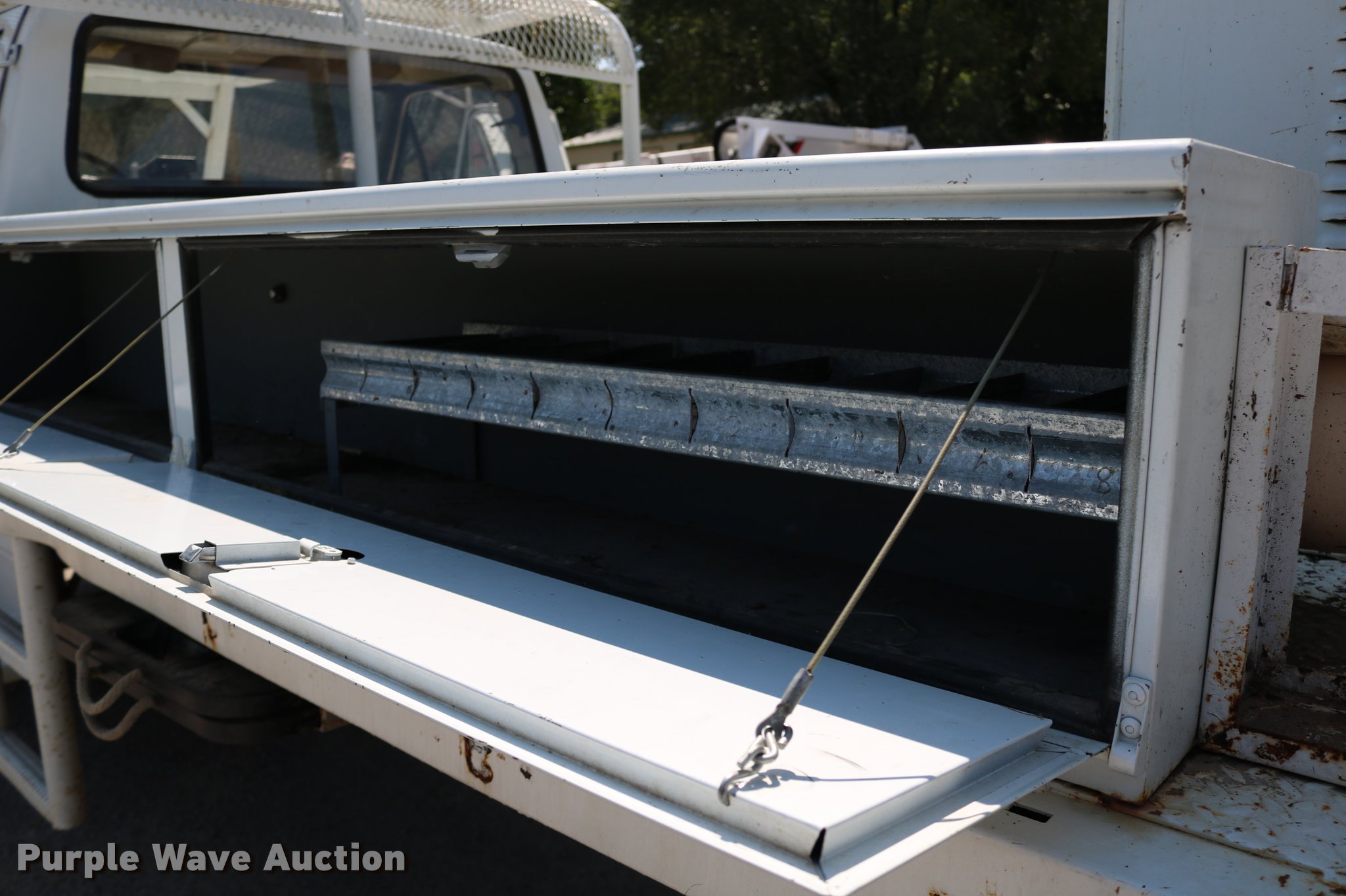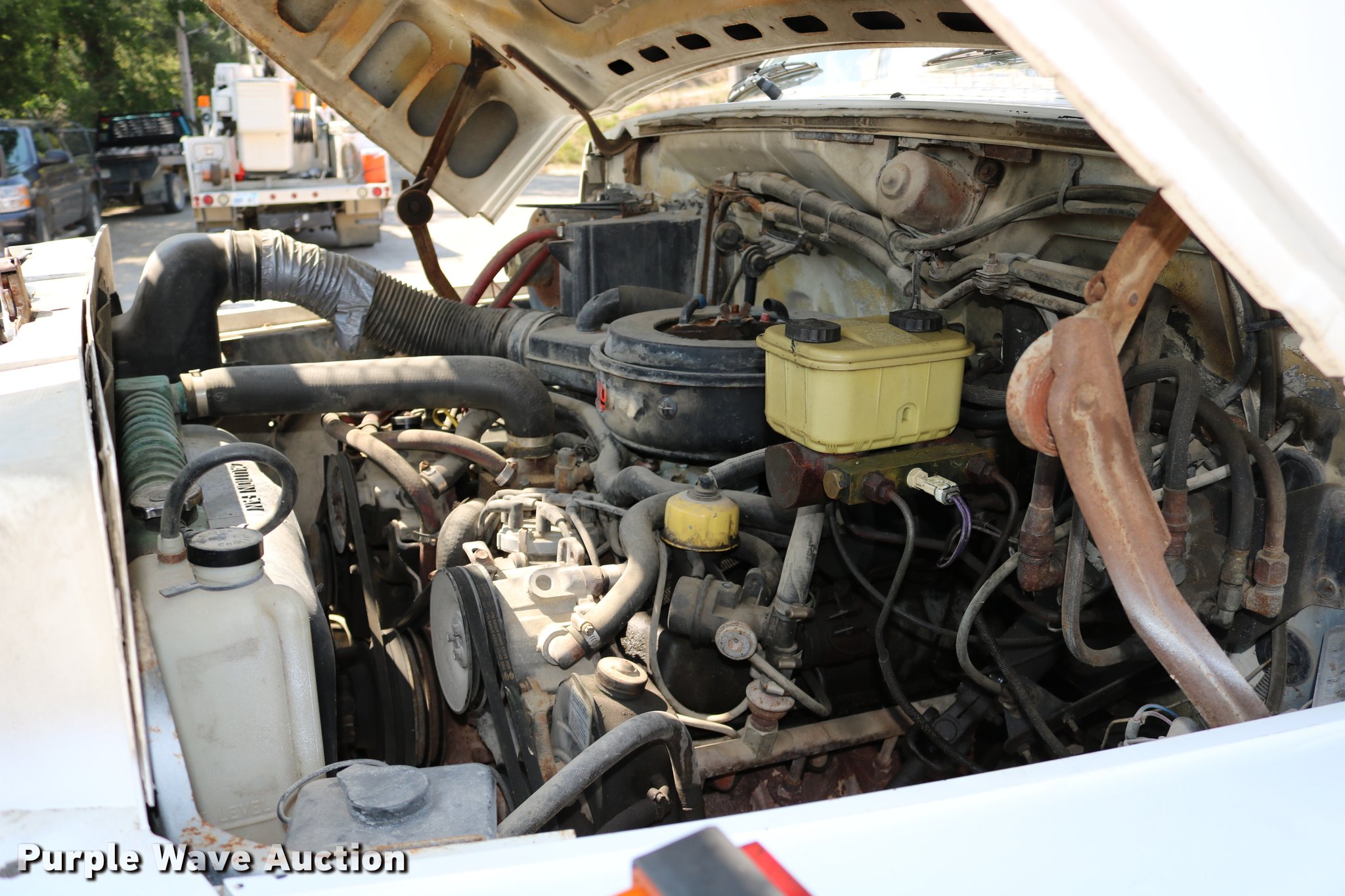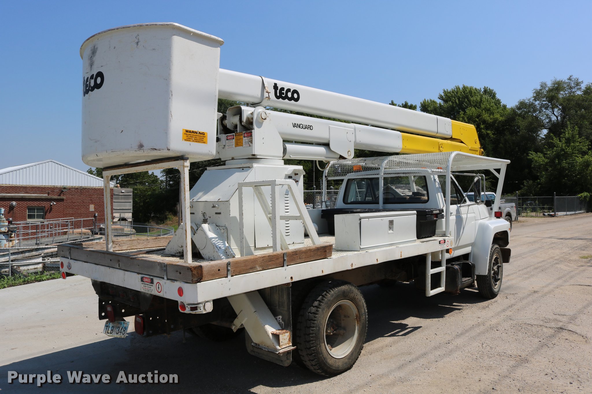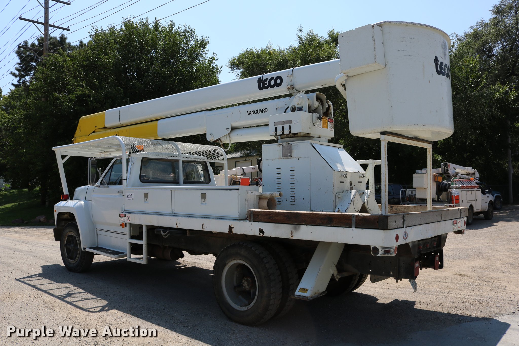 Purple Wave is selling a used Bucket Truck in Kansas. This item is a 1985 Ford F600 bucket truck with the following: 40,679 miles on odometer, Ford 6.1L V8 gas engine, Five speed manual transmission, Heat, Beacon light, PTO, Flatbed, (3) toolboxes, Teco V550T2TFEZ boom, 50' boom length, 700 lbs max lift capacity, Two man basket, Ground and platform controls, Boom rotation, Articulating insulated boom, (2) outriggers, Serial 20888500, Single fuel tank, Spring suspension, Hydraulic brakes, 172" wheelbase, 8.25-20 tires, GVWR 21,200 lbs, Unit is hard to start