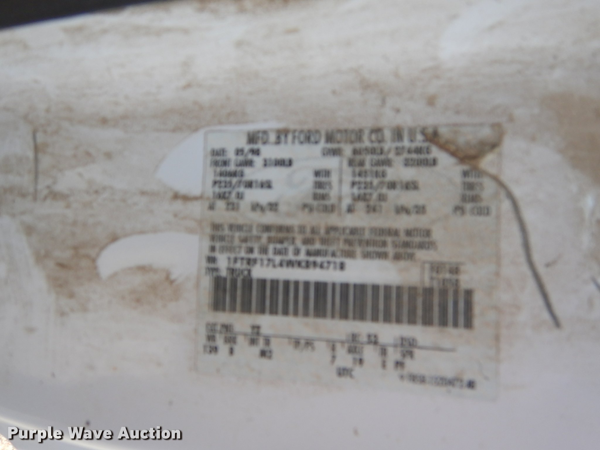 Purple Wave is selling a used 1/2 Ton Pickup or Van in Kansas. This item is a 1998 Ford F150 XL pickup truck with the following: 154,380 miles on odometer, 5.4L V8 SOHC 16V gas engine, Automatic transmission, AC and heat, Tilt, Cruise, AM/FM, Manual windows and locks, Cloth interior, Bed liner, Ball hitch, Trailer wiring, 225/75R16 tires, ABS light on, Possible engine issues, Glove box does not close, Unit# 21