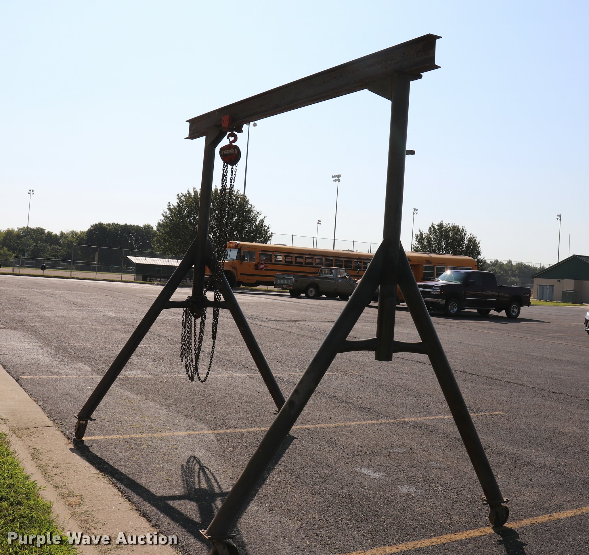 Purple Wave is selling a used Tools in Kansas. This item is a Shop built winch stand with the following: 119"L x 82"W x 117"H, Lynx TL-1000 1/2 ton hoist, Steel construction, Casters