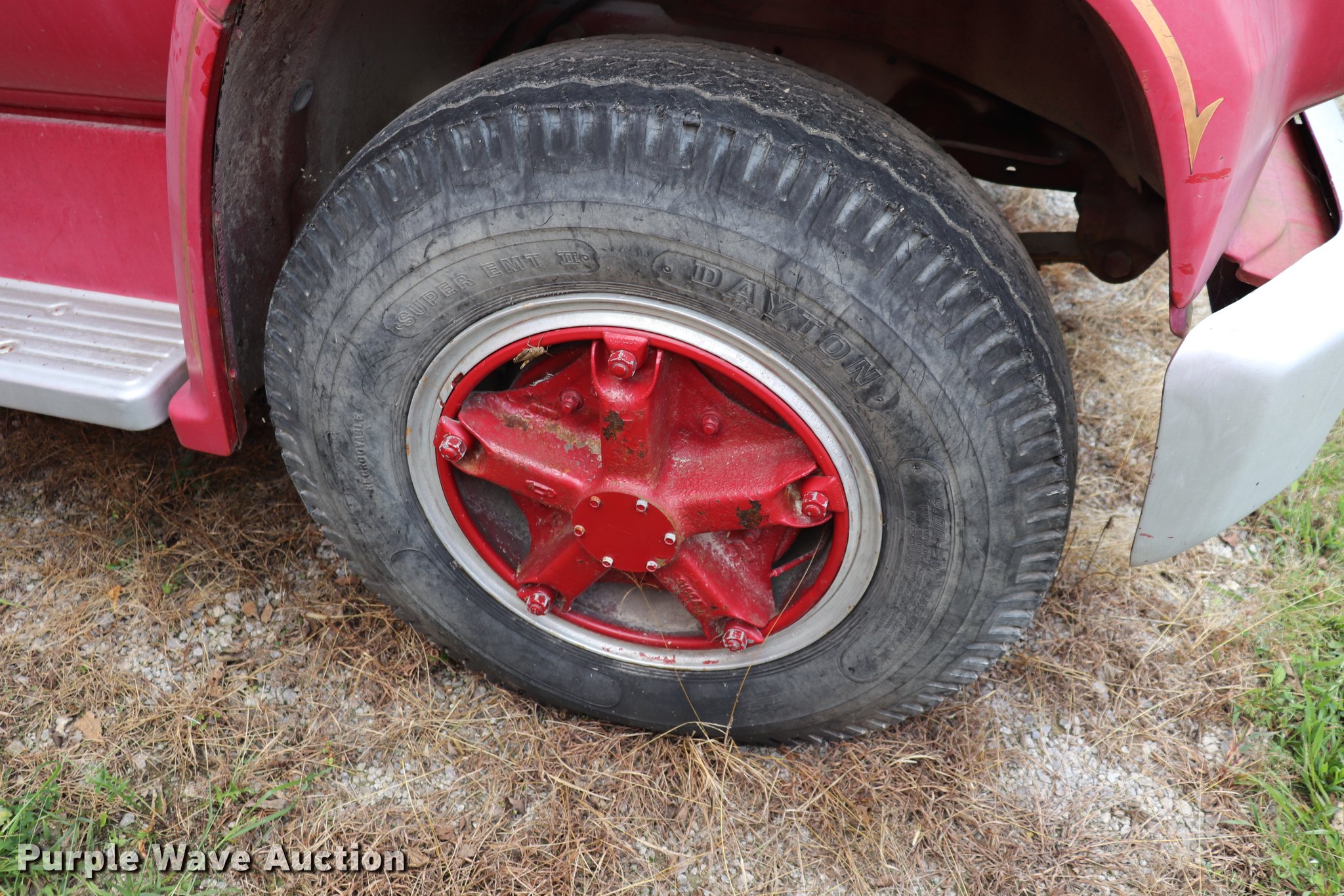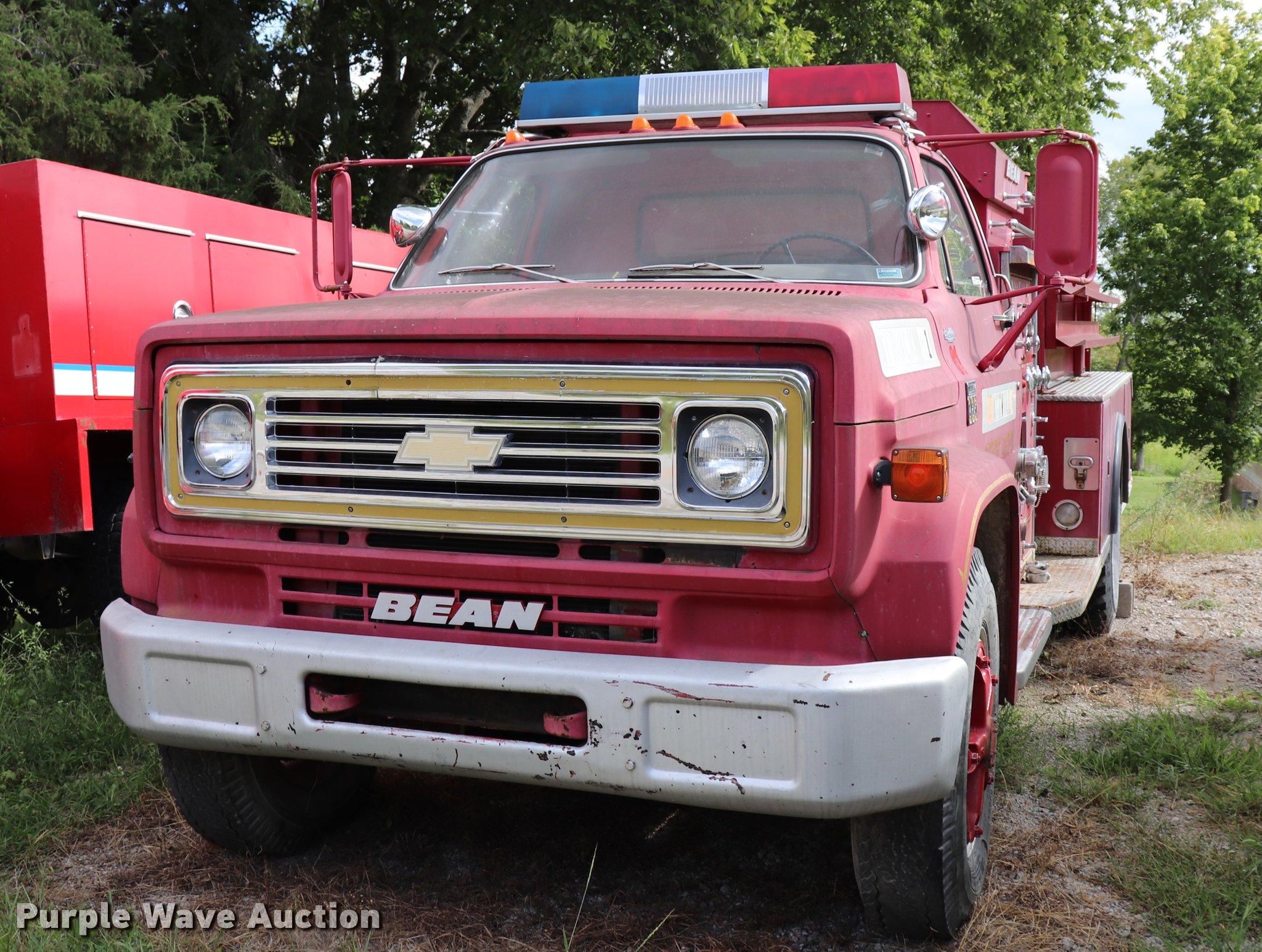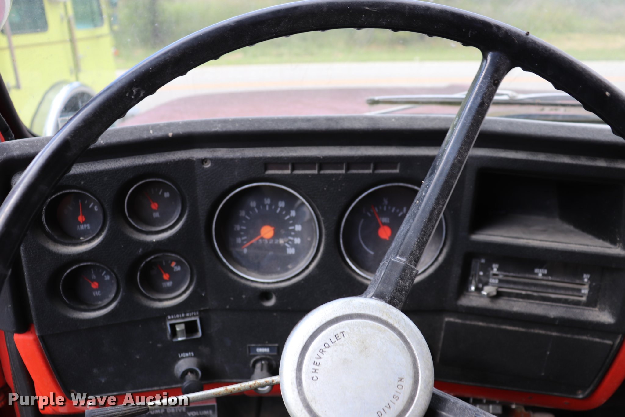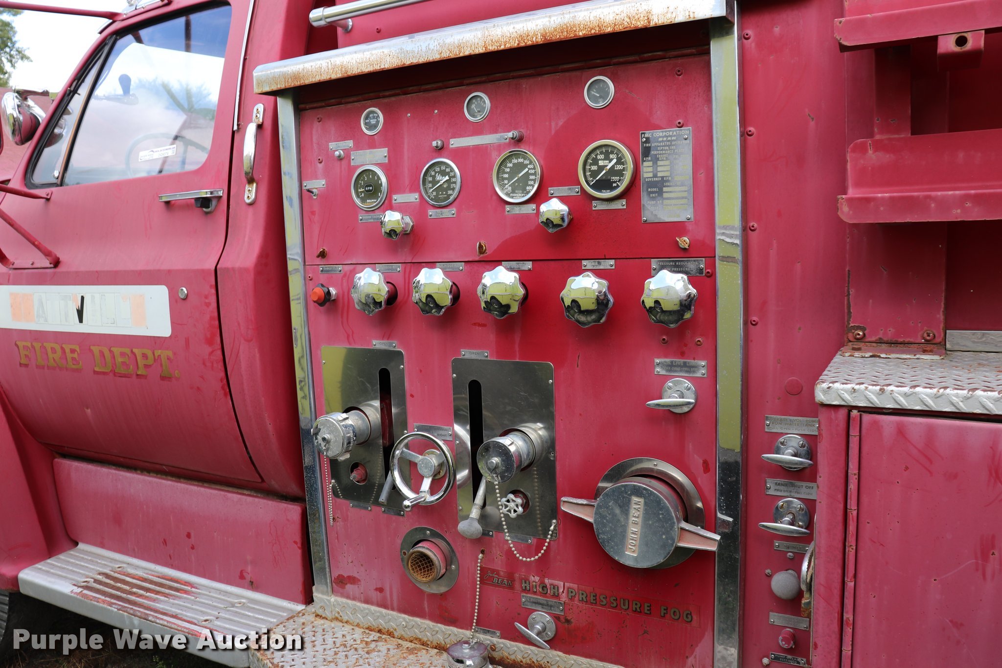 Purple Wave is selling a used Fire Truck or Emergency Vehicle in Kansas. This item is a 1974 Chevrolet C65 fire truck with the following: 23,322 miles on odometer, 366 C.I.D. eight cylinder gas engine, Five speed manual transmission, Single axle, AC and heat, Suspension seat, Rear work lights, (3) spotlights, Light bars, PTO, Bean platform, Model 9083, Serial 75A9H75C3610, 750 gpm pump, 750 gallon tank, Left, right, and rear storage compartments, 9.00-20 front tires, GVWR 25,500 lbs, 10.00-20 rear tires, Unknown operating condition, Unit 64