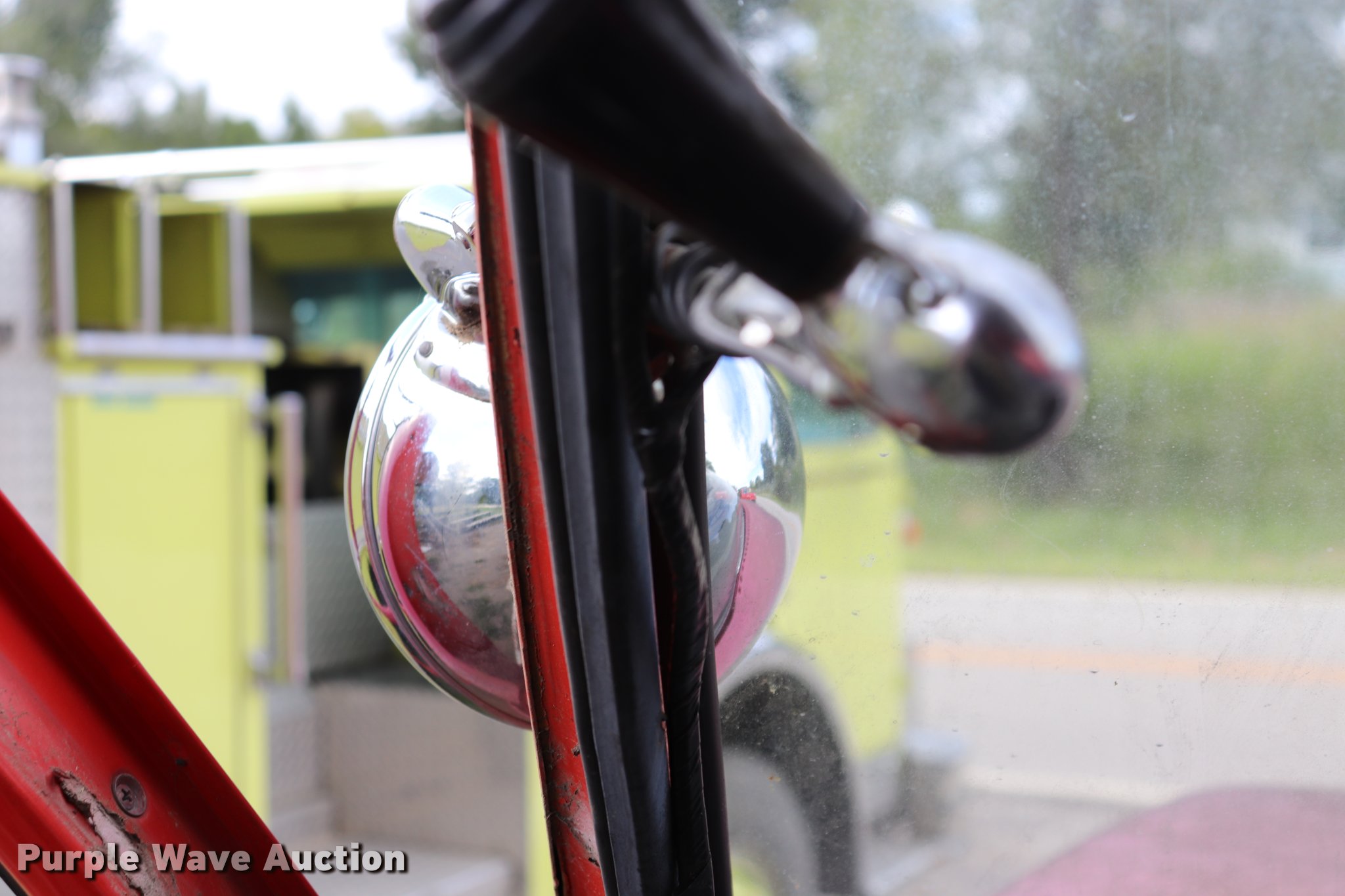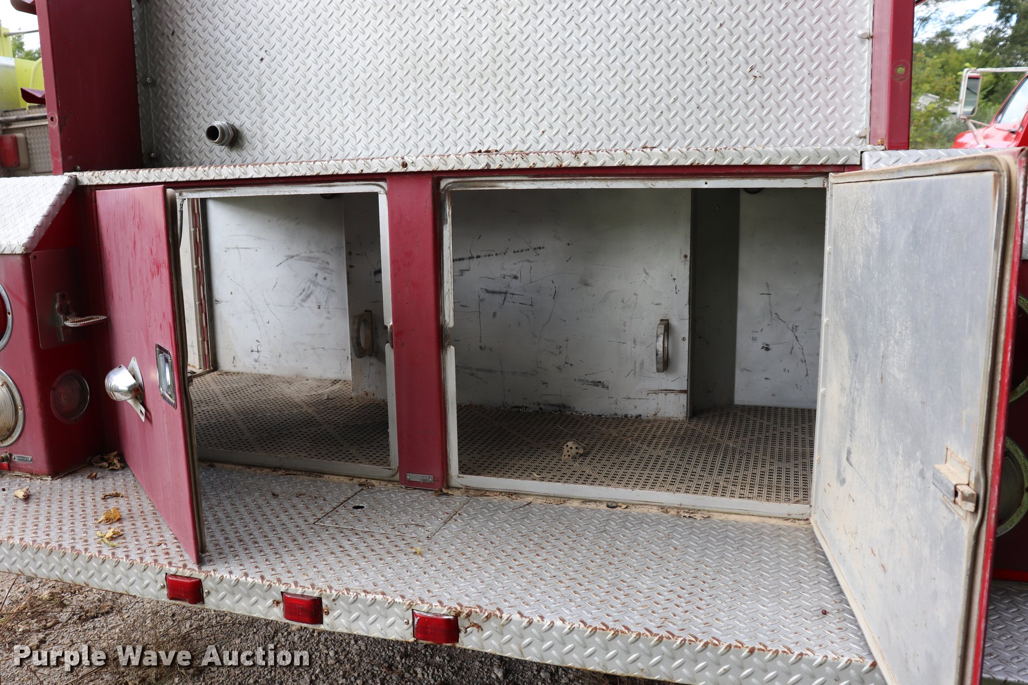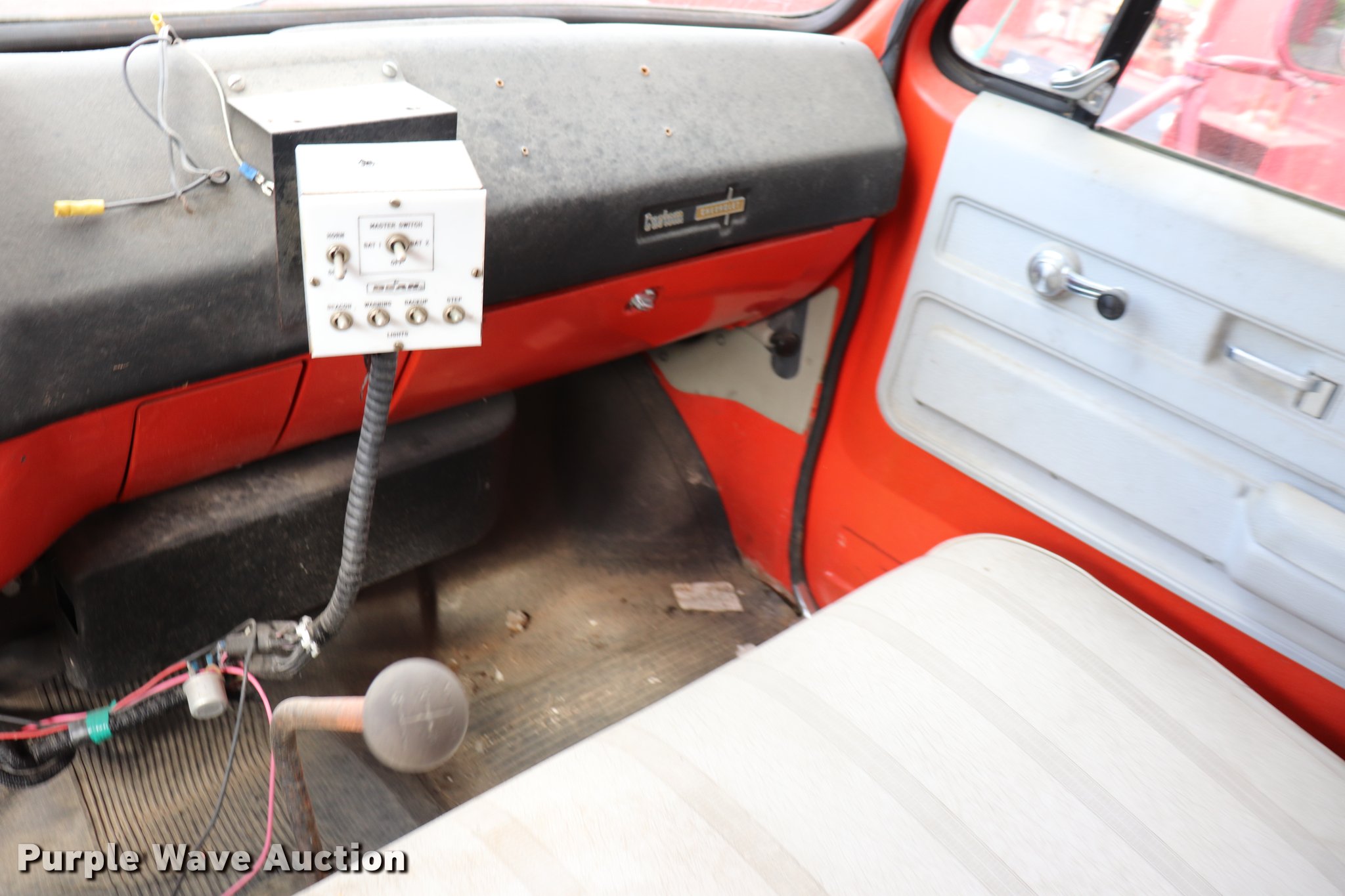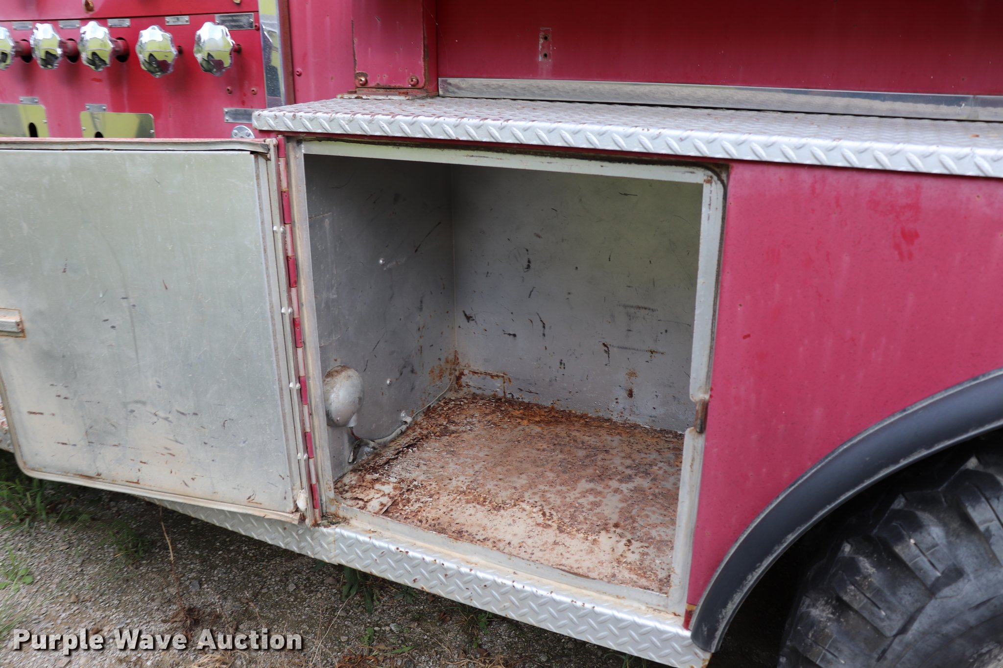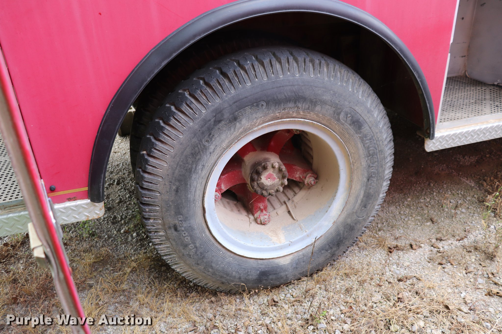 Purple Wave is selling a used Fire Truck or Emergency Vehicle in Kansas. This item is a 1974 Chevrolet C65 fire truck with the following: 23,322 miles on odometer, 366 C.I.D. eight cylinder gas engine, Five speed manual transmission, Single axle, AC and heat, Suspension seat, Rear work lights, (3) spotlights, Light bars, PTO, Bean platform, Model 9083, Serial 75A9H75C3610, 750 gpm pump, 750 gallon tank, Left, right, and rear storage compartments, 9.00-20 front tires, GVWR 25,500 lbs, 10.00-20 rear tires, Unknown operating condition, Unit 64