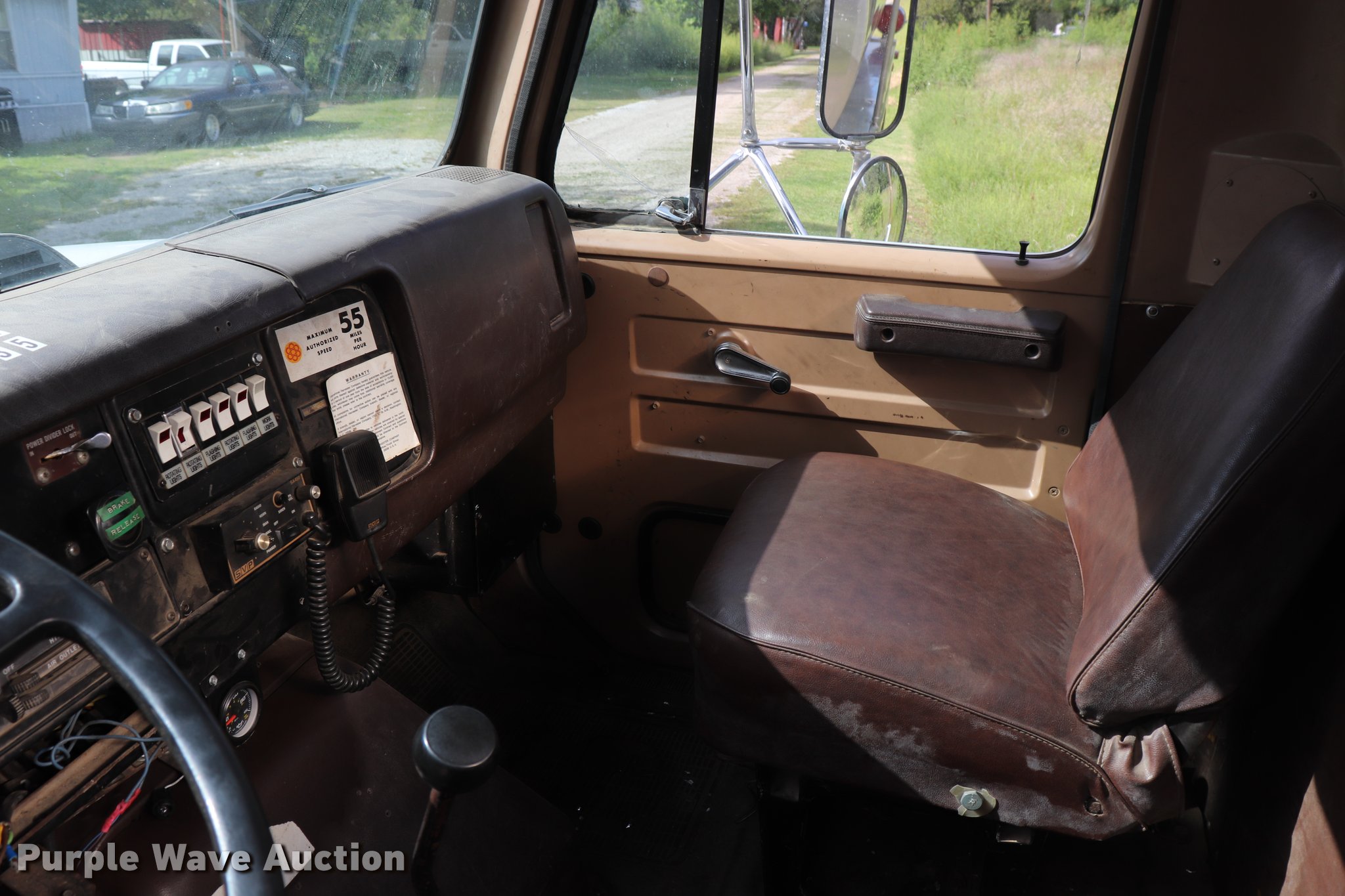 1982 International S1900 tanker fire truck. 55,490 miles on odometer, International 7.6L L6 turbo diesel engine, 10 speed manual transmission, Tandem axle, AC and heat, Suspension seat, Backup alarm, Rear work lights, Rear mounted storage compartment, 2,300 gallon tank, Waterous dependable pump Model PB18-25158, 18 HP gas engine, 250 gpm, 175 max discharge, Serial P4133, 80,000 lbs front mounted winch, Single fuel tank, 11R22.5 tires, Cracked driver side wing glass, Side latch broken, Unknown operating condition. Kansas title. Title distribution may be delayed up to 14 days from verification of funds. 2HTAX1959CCA16303. Rural Fire District No. 3. 1812 158th St. Fort Scott, KS 66701