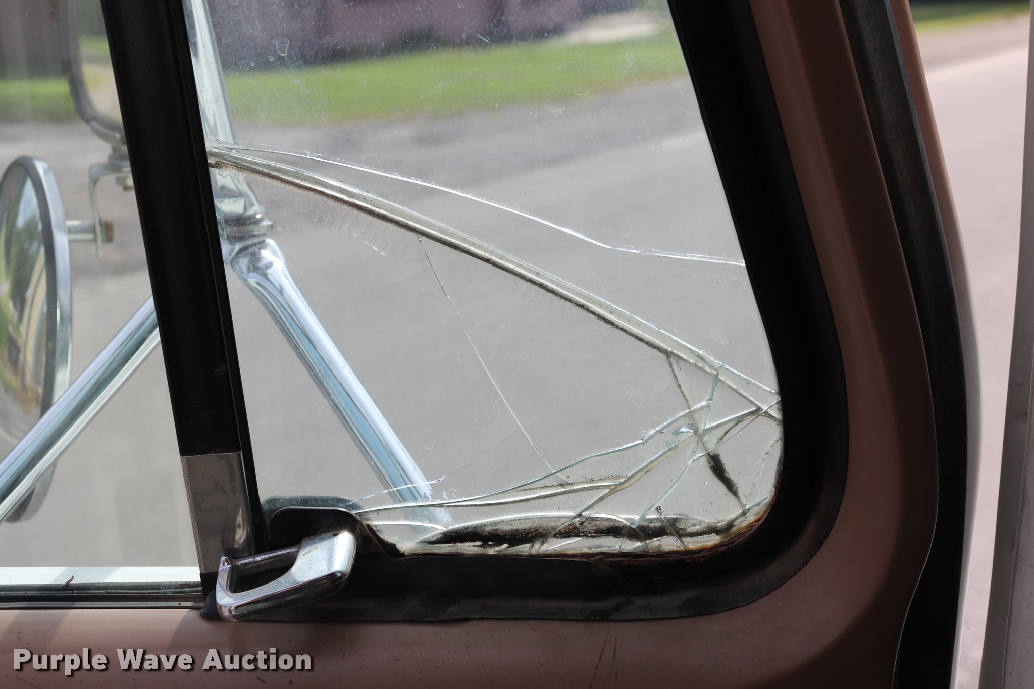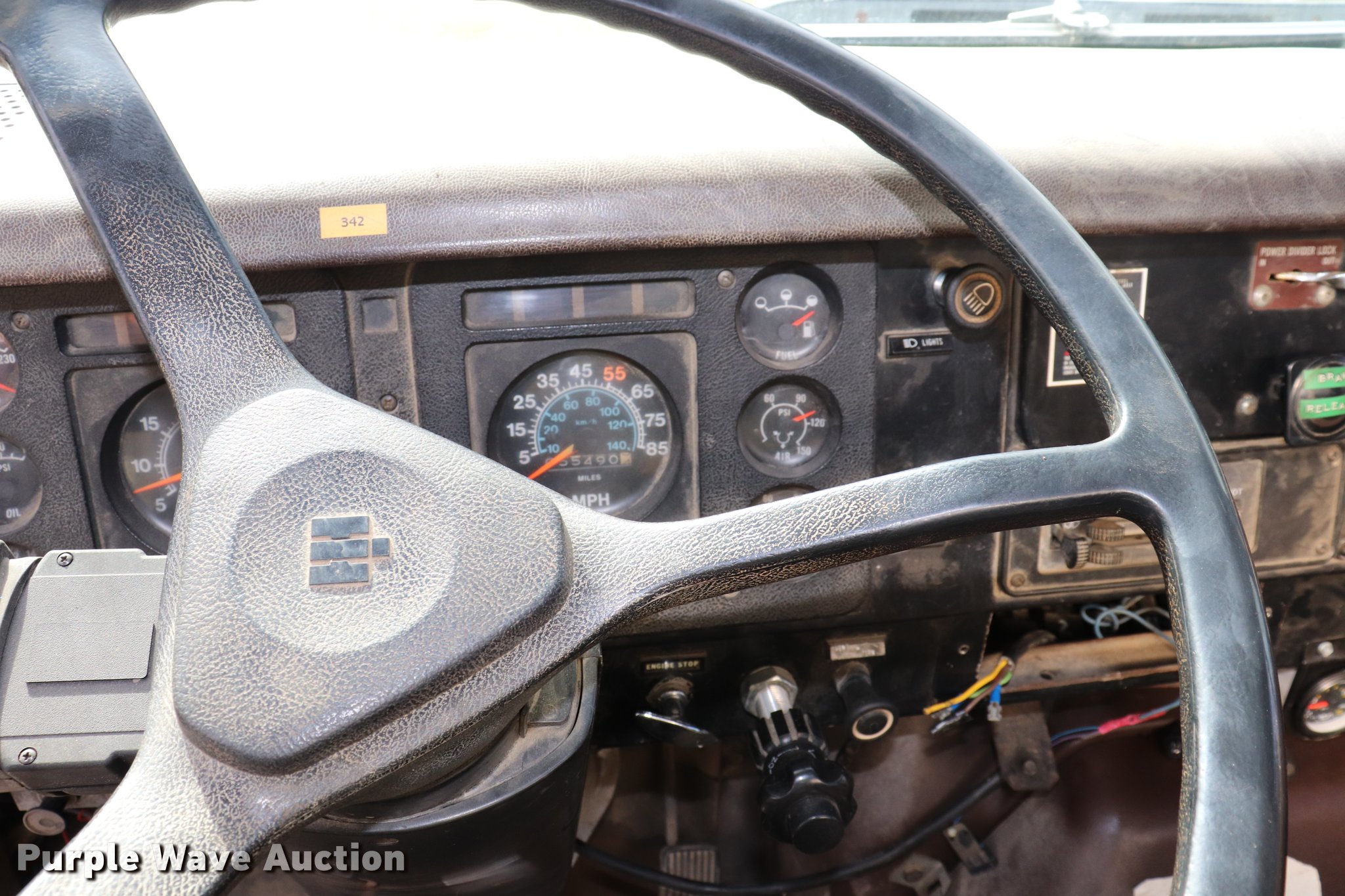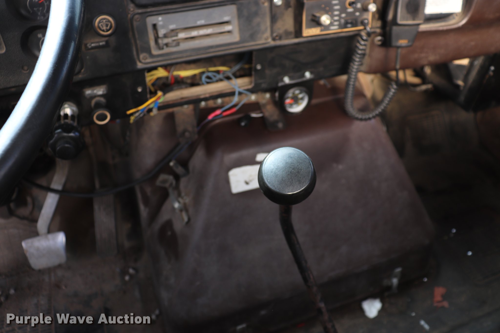 Purple Wave is selling a used Fire Truck or Emergency Vehicle in Kansas. This item is a 1982 International S1900 tanker fire truck with the following: 55,490 miles on odometer, International 7.6L L6 turbo diesel engine, 10 speed manual transmission, Tandem axle, AC and heat, Suspension seat, Backup alarm, Rear work lights, Rear mounted storage compartment, 2,300 gallon tank, Waterous dependable pump, Model PB18-25158, 18 HP gas engine, 250 gpm, 175 max discharge, Serial P4133, 80,000 lbs front mounted winch, Single fuel tank, 11R22.5 tires, Cracked driver side wing glass, Side latch broken, Unknown operating condition