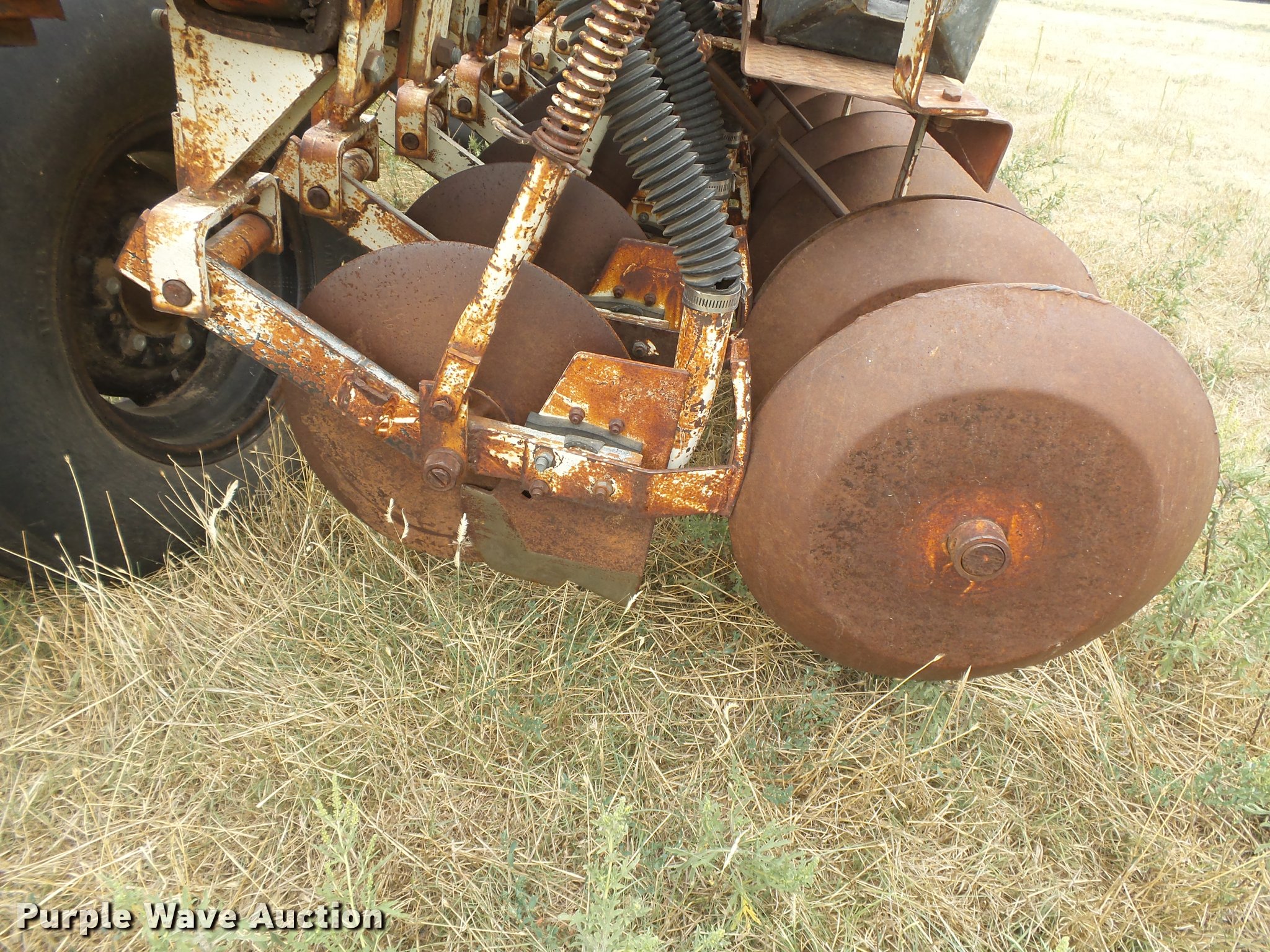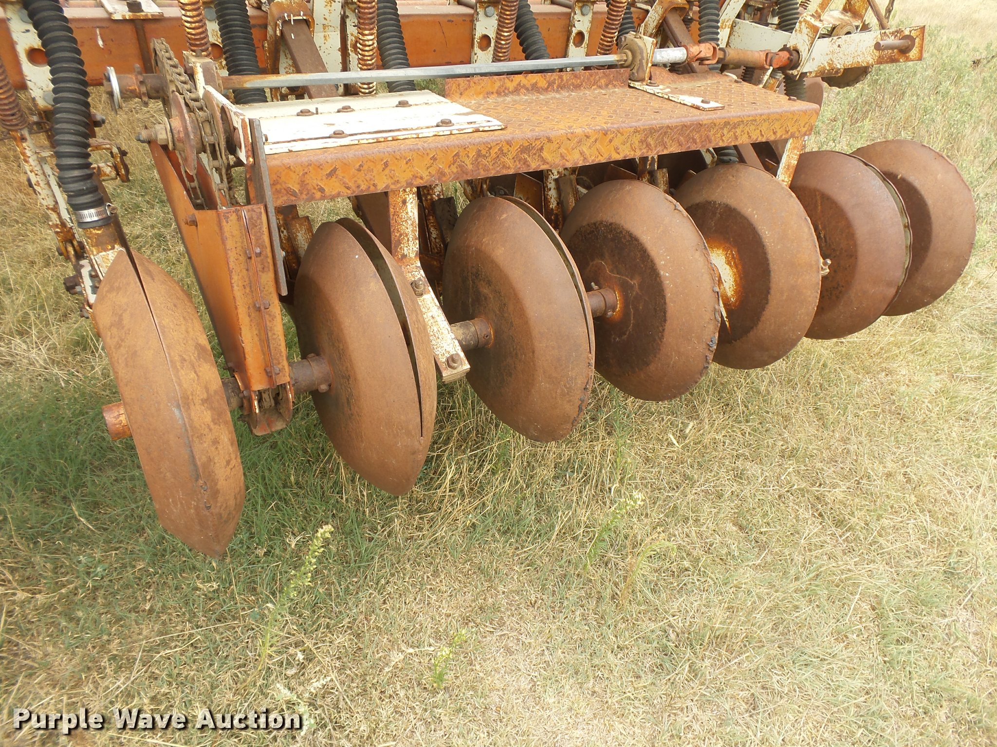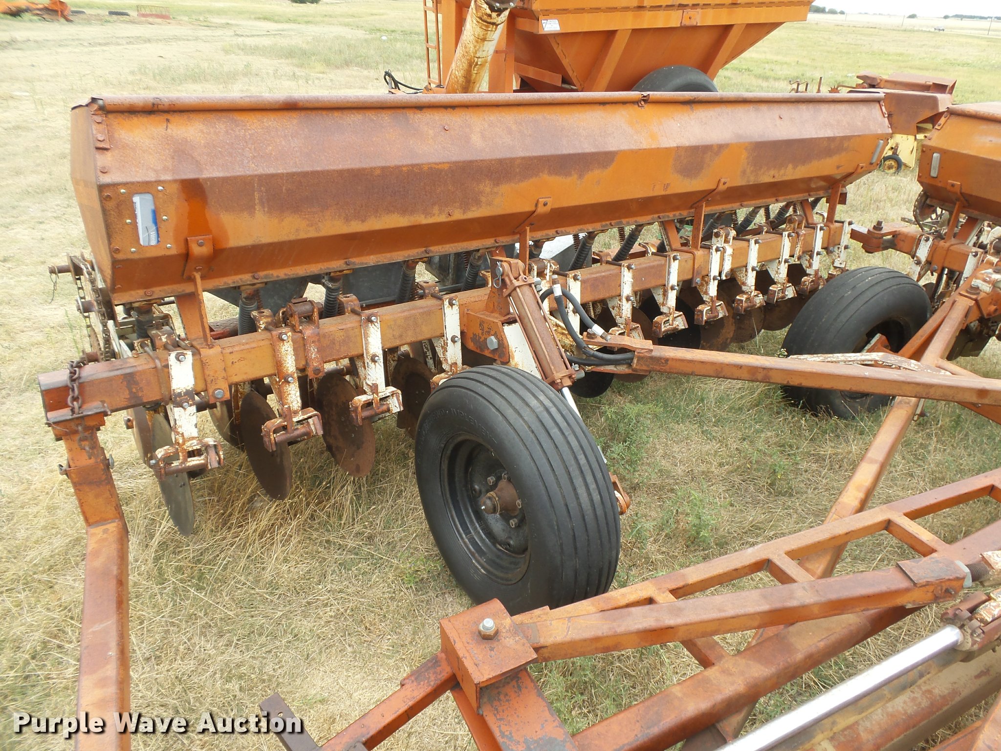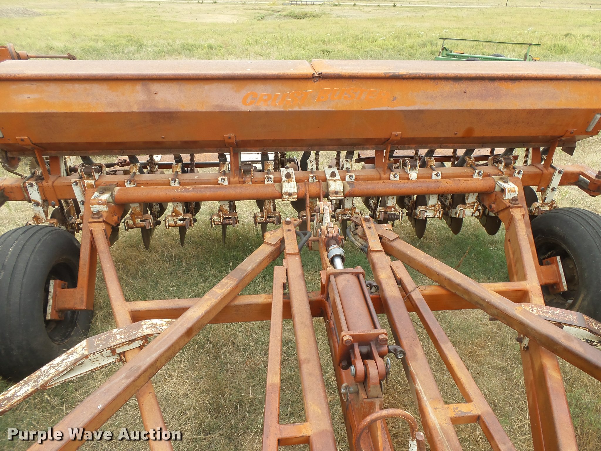 Purple Wave is selling a used Grain Drill or Seeder in Kansas. This item is a CrustBuster grain drill with the following: 10" spacing, Optional hoppers for 30" spacing, Bulk fill system, Hydraulic lift and fold, Ground driven, Single disk openers, Steel press wheels, Pin hitch, 9.5L-15SL tires, Serial DR7735