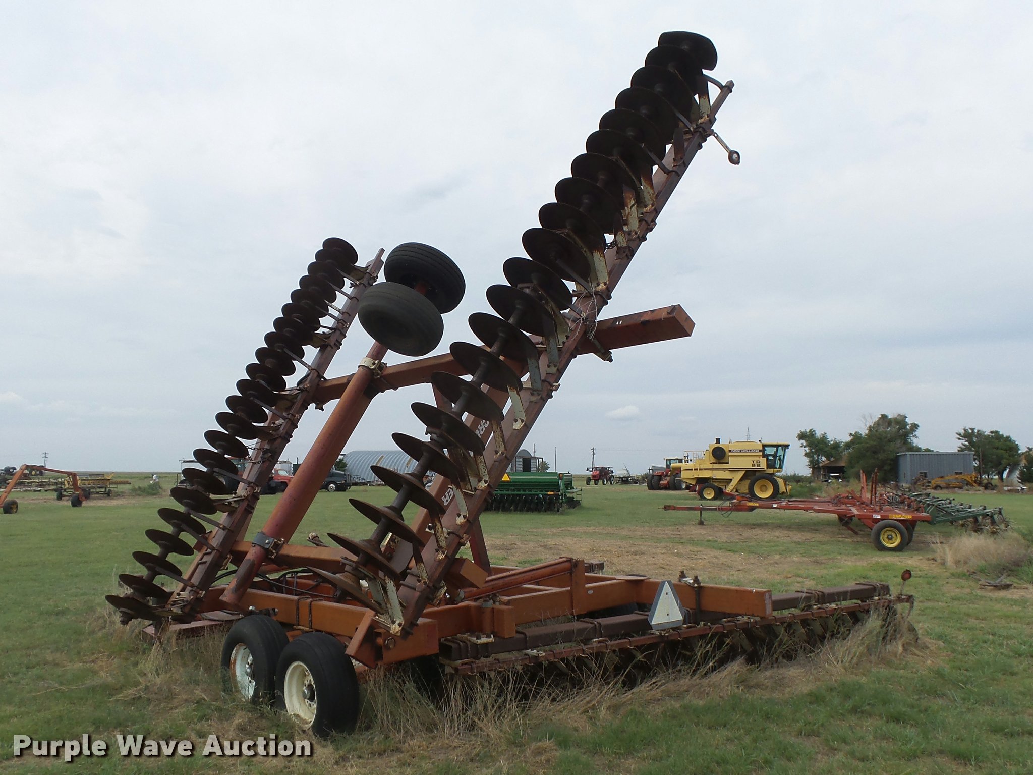 Purple Wave is selling a used Disk in Kansas. This item is a CrustBuster tandem disk with the following: 30'W, 17" diameter front blades, 21" diameter rear blades, 9" spacing, Manual leveler, Hydraulic lift and fold, Slab hitch, 11L-15 tires, Serial 137