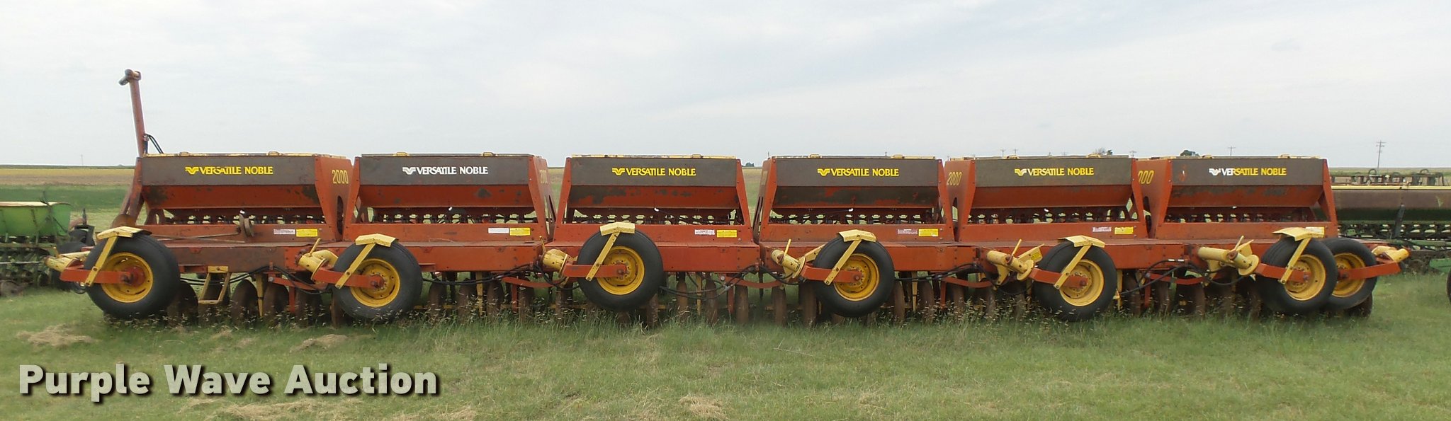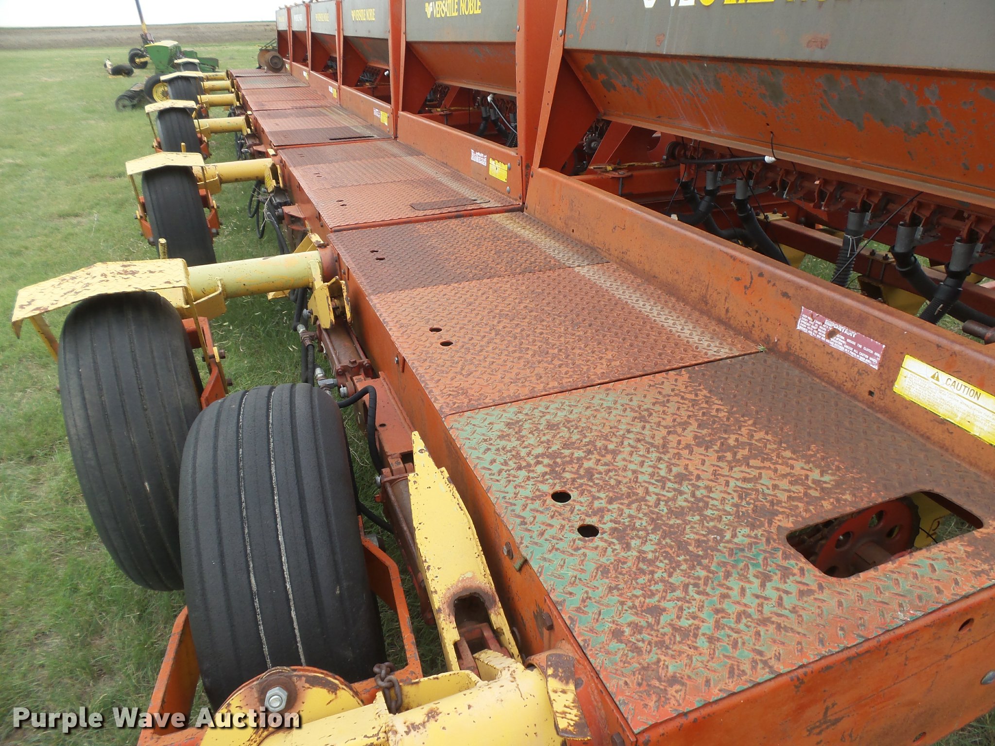 Purple Wave is selling a used Grain Drill or Seeder in Kansas. This item is a 1981 Versatile Noble 2000 hoe grain drill with the following: 40'W, Hydraulic lift, Bulk fill system, 10" carbide tips, Steel press wheels, Hydraulic transport package, Pin hitch, (7) 9.5-15 transport tires, (6) 9.5-15 drive/outside tires, Serial 7514