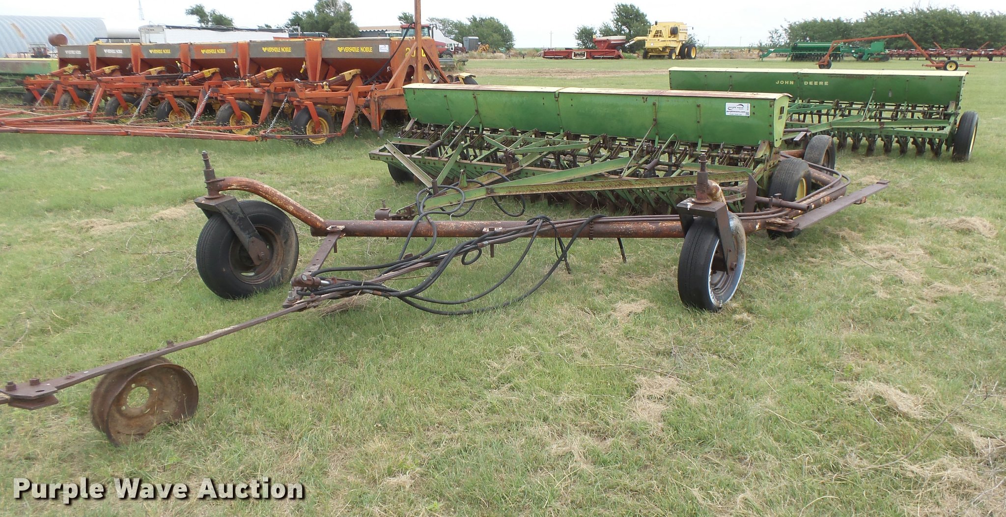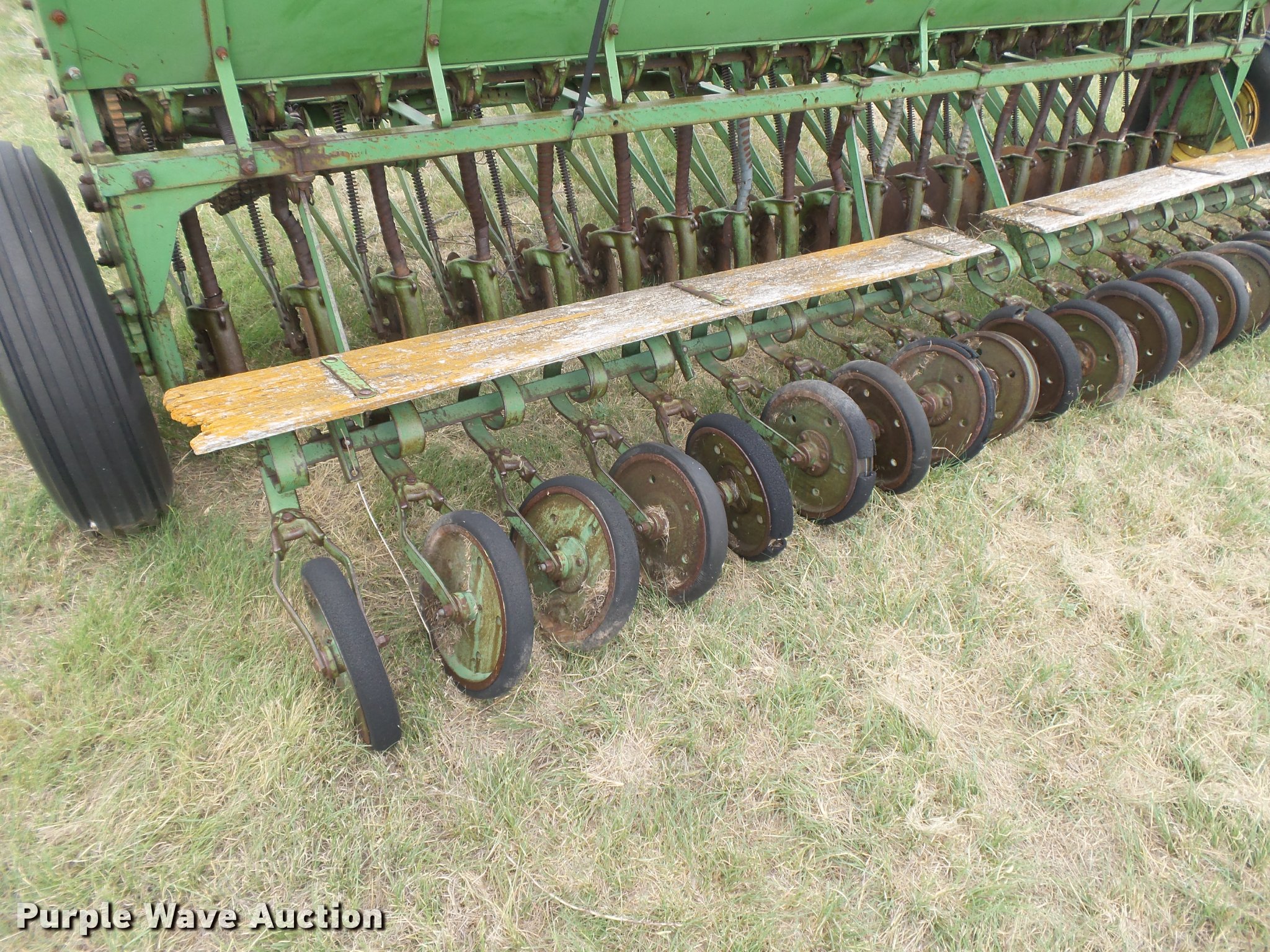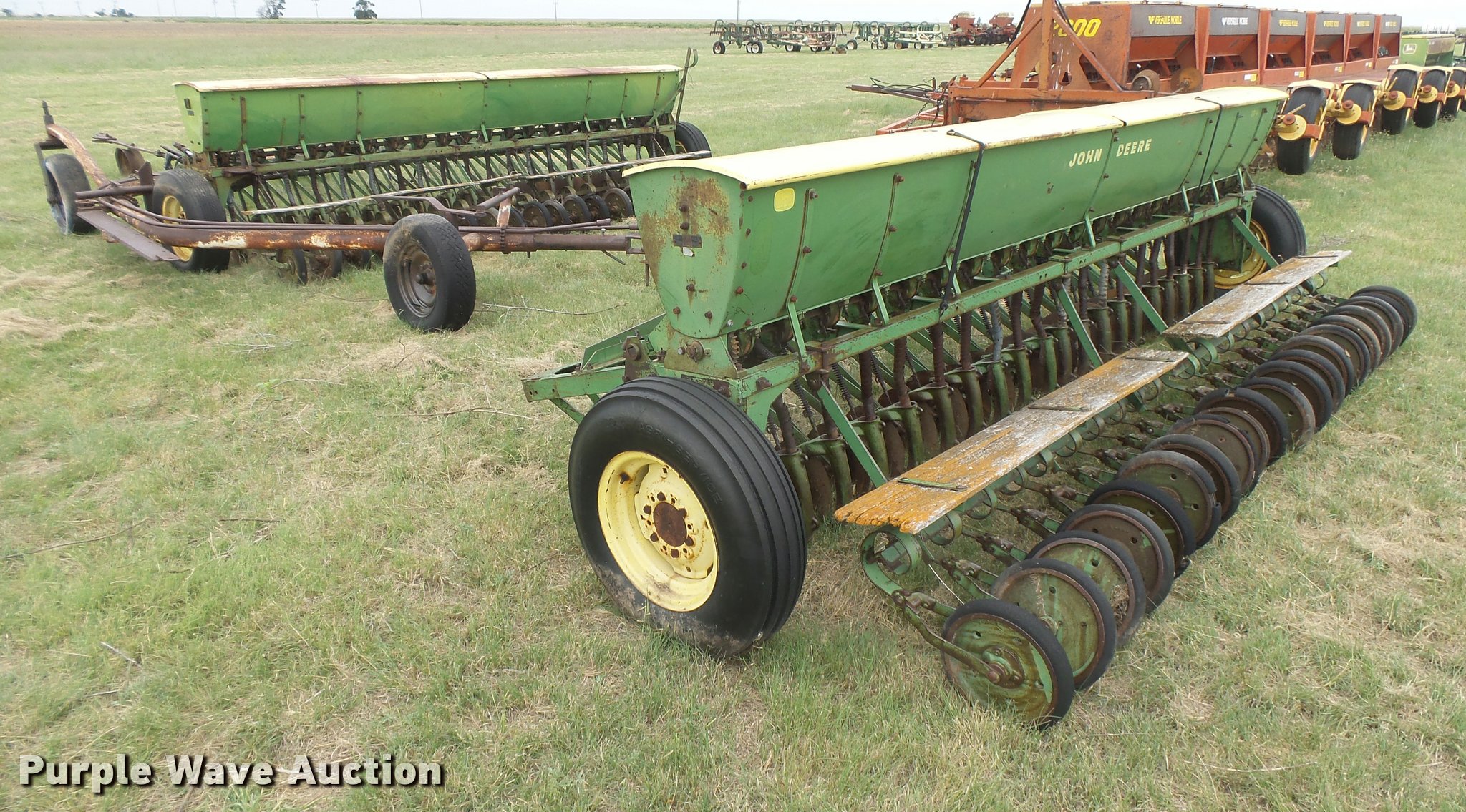 Purple Wave is selling a used Grain Drill or Seeder in Kansas. This item is a (2) John Deere DRA hoe grain drills with the following: 28'W, 7.5" spacing, Bulk fill system, Double box, Ground meter drive, Single disk openers, Rubber closing system, Waldra hitch, Pin hitch, (4) 7.60-15 drive/outside tires, Serial 59080, 64082
