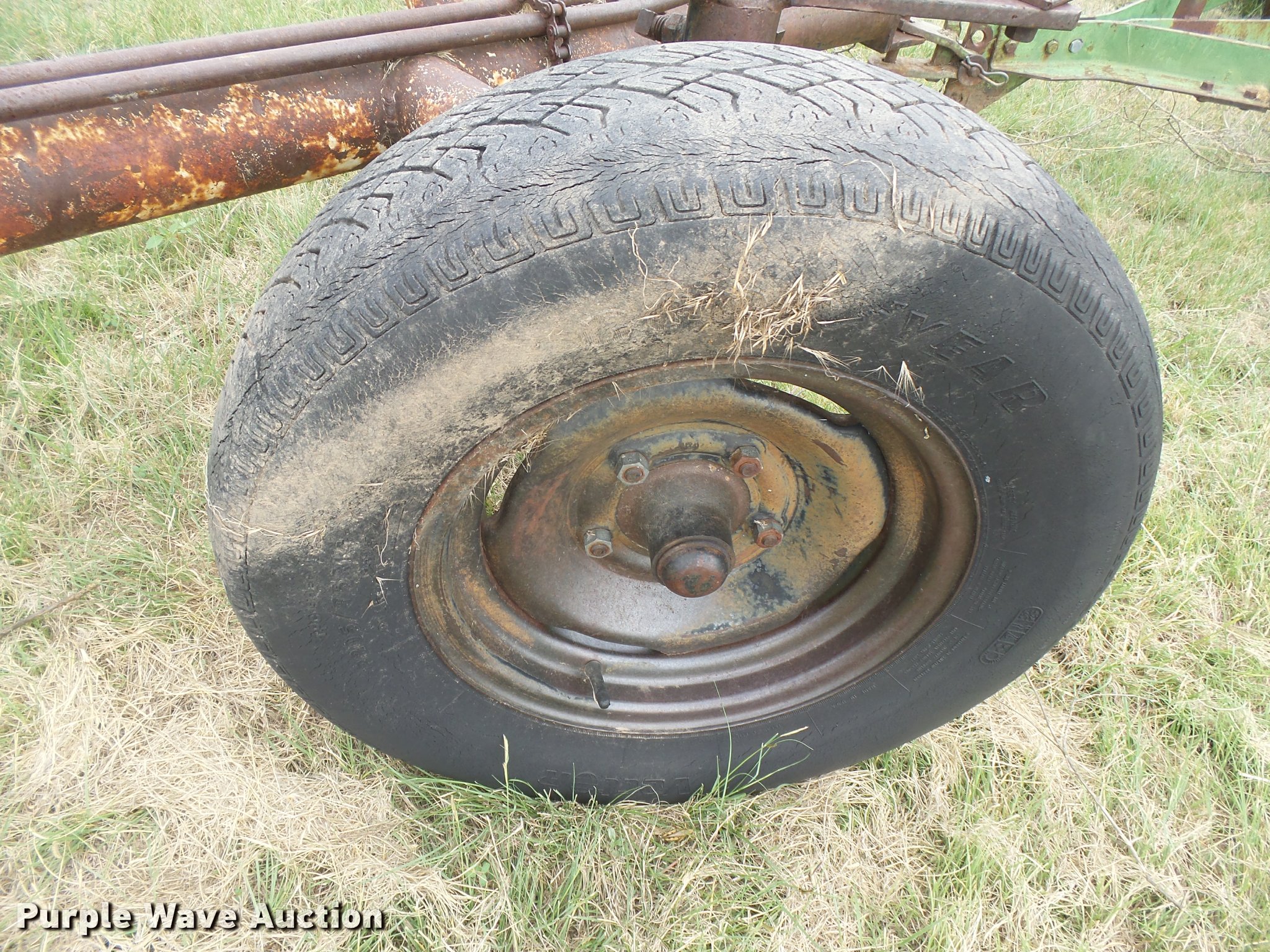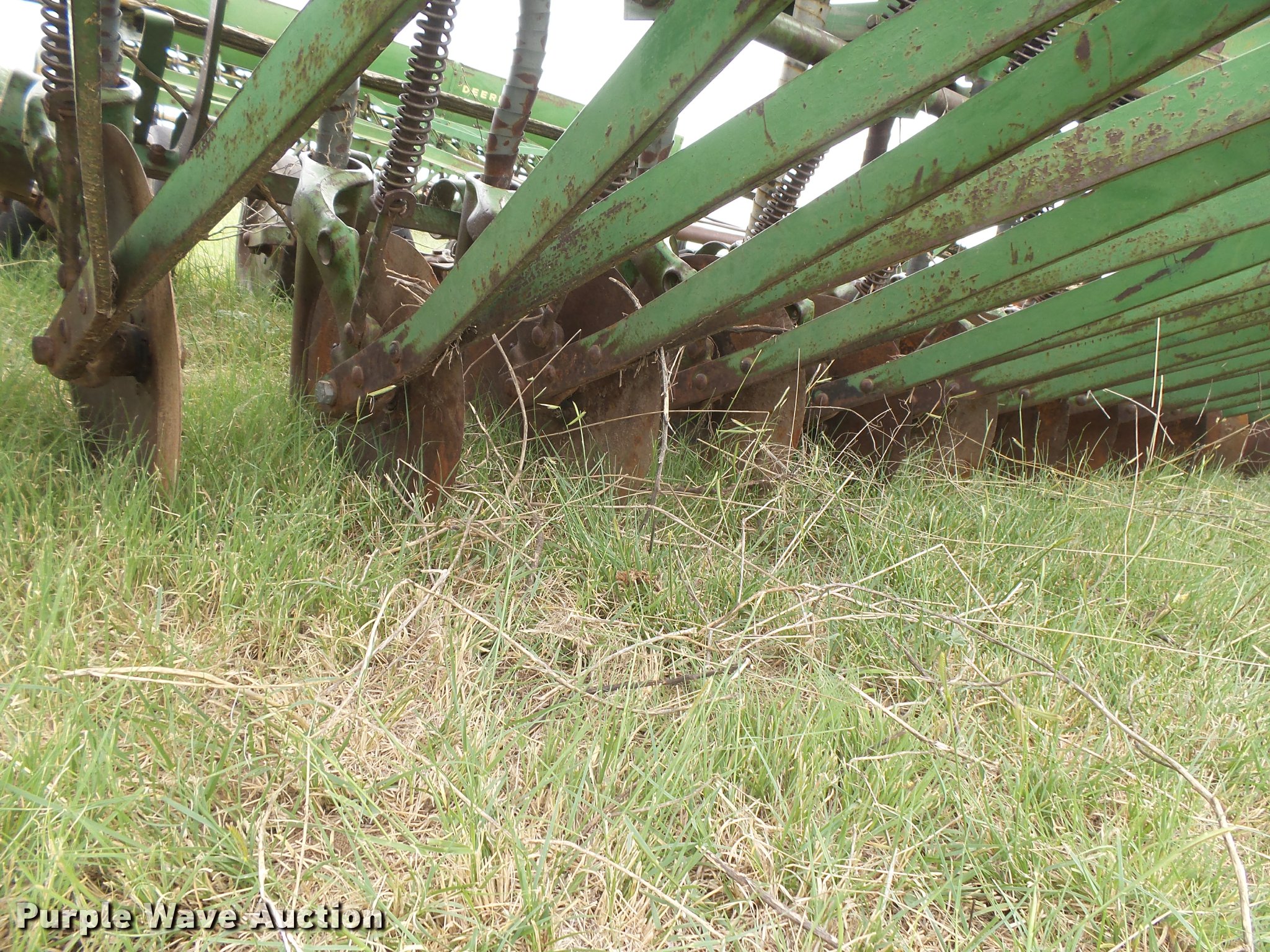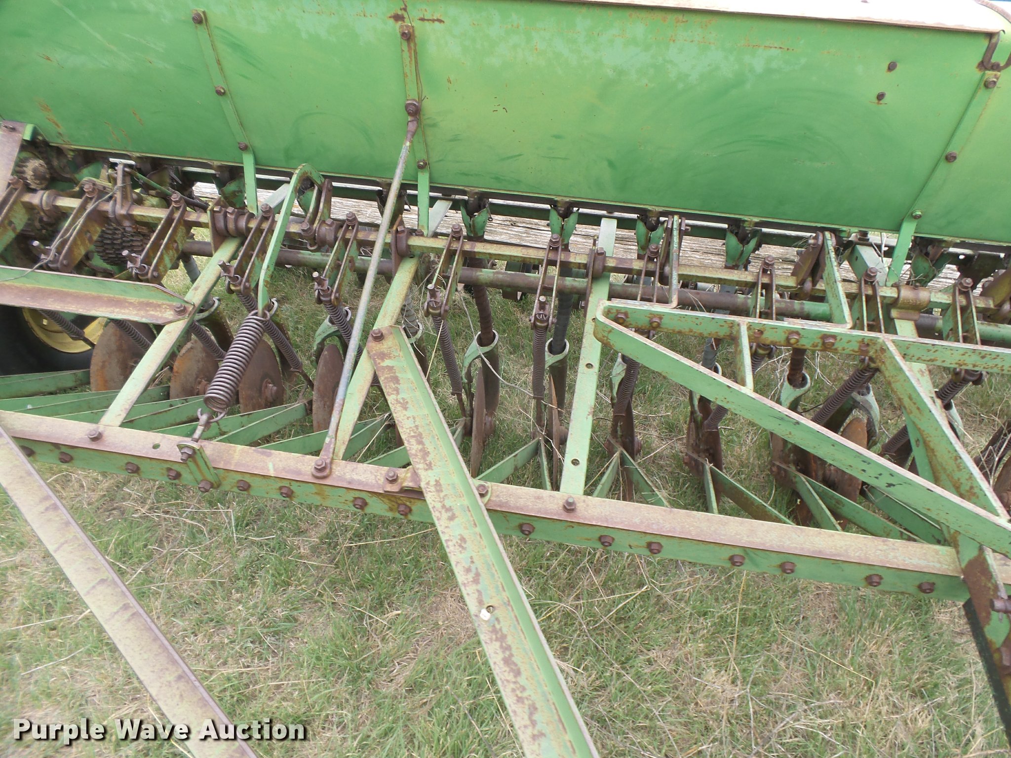 Purple Wave is selling a used Grain Drill or Seeder in Kansas. This item is a (2) John Deere DRA hoe grain drills with the following: 28'W, 7.5" spacing, Bulk fill system, Double box, Ground meter drive, Single disk openers, Rubber closing system, Waldra hitch, Pin hitch, (4) 7.60-15 drive/outside tires, Serial 59080, 64082