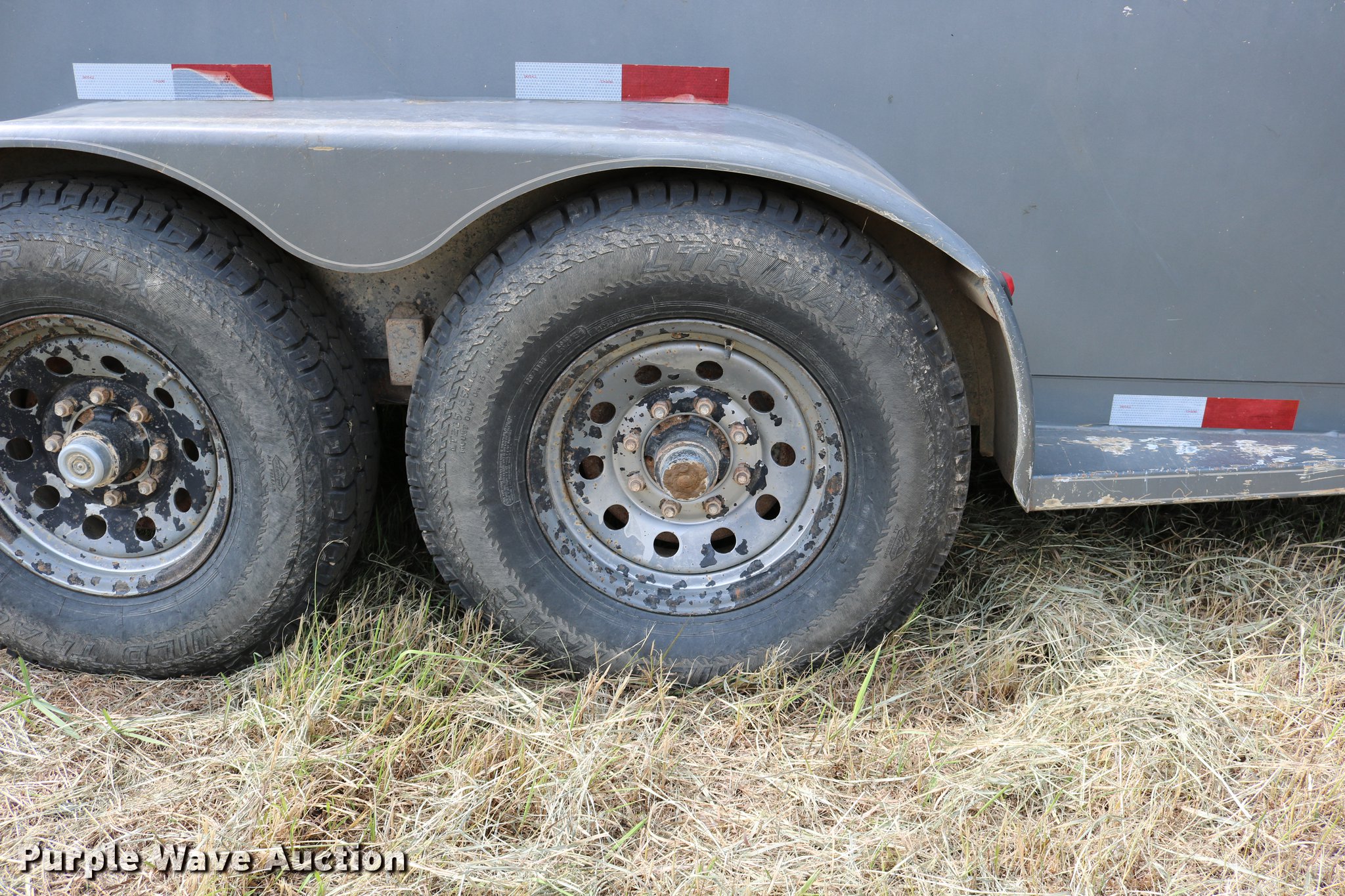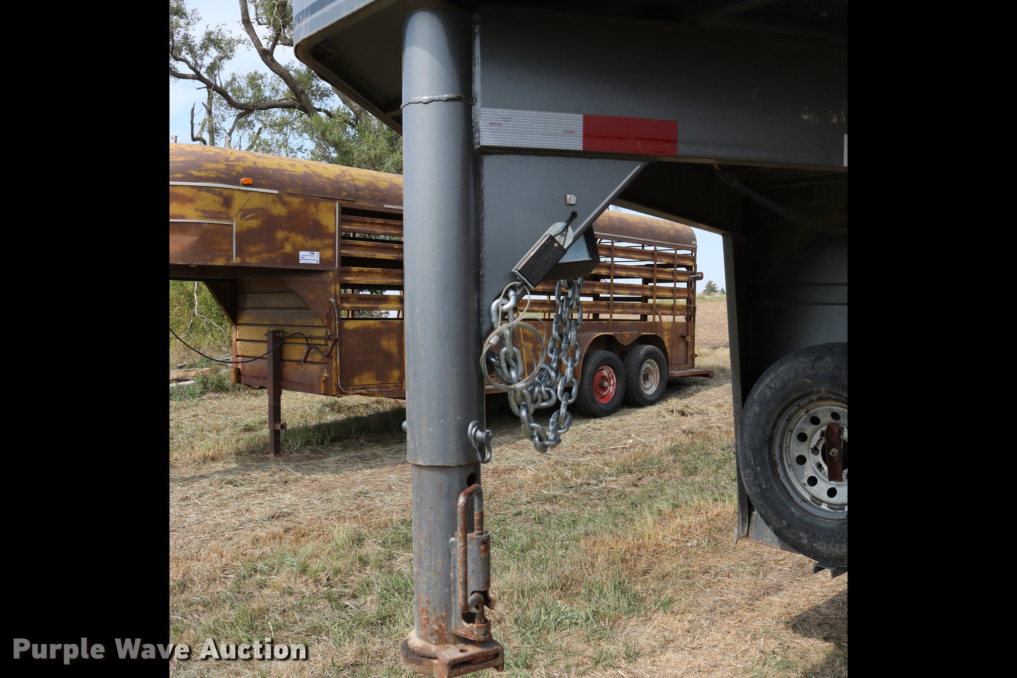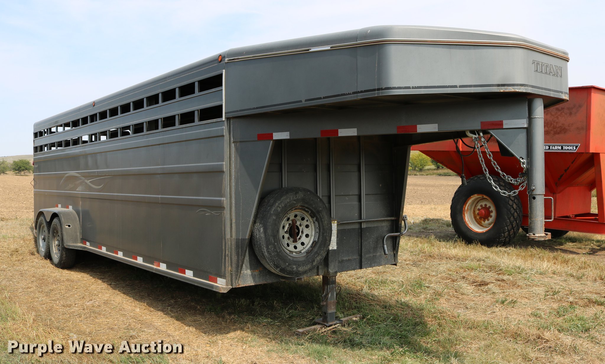 Purple Wave is selling a used Livestock Trailer in Kansas. This item is a 2008 Titan 1R8691 livestock trailer with the following: 31'7"L overall, 24'L x 80"W body, (2) center divider gates, Side door, Full swing rear door with slider gate, Ground load, Dock bumper, Solid rubber floor, Steel construction, 2 5/16" gooseneck hitch, Single leg landing gear, Torsion suspension, Electric brakes, Steel wheels, 235/85R16 tires, GVWR 14,000 lbs, GAWR 7,000 lbs