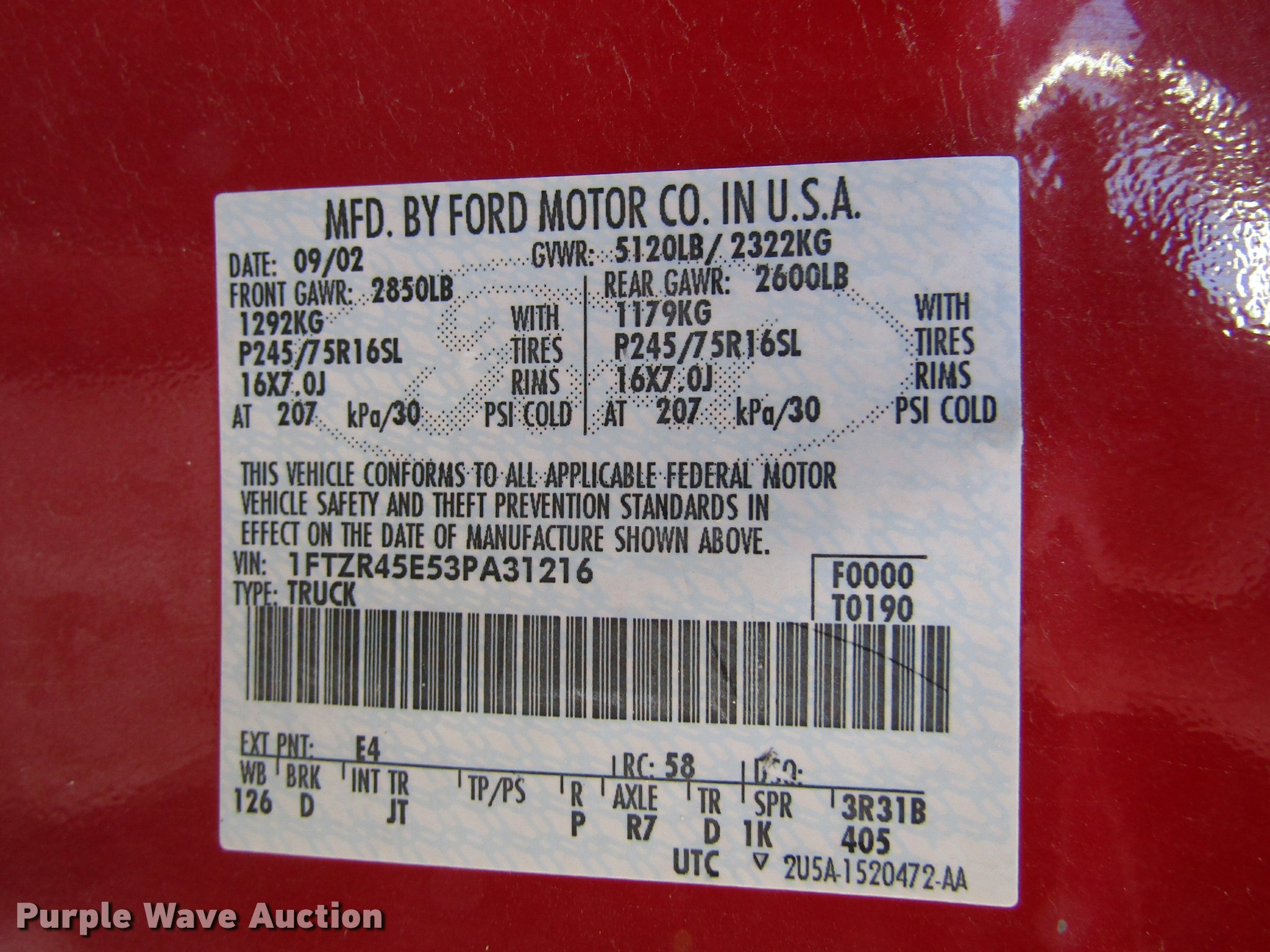 Purple Wave is selling a used Compact Pickup or Van in Nebraska. This item is a 2003 Ford Ranger Ext. Cab pickup truck with the following: 223,393 miles on odometer, 4.0L V6 SOHC 12V gas engine, Automatic transmission, Four wheel drive, AC and heat, Tilt, AM/FM/CD, Power windows, locks, and mirrors, Cloth interior, Bedliner, Running boards, Fog lights, Front tow hook, 2" ball hitch, LT245/75R16 tires, Unknown operating condition, Dead battery, Missing foglight, Unit# 147
