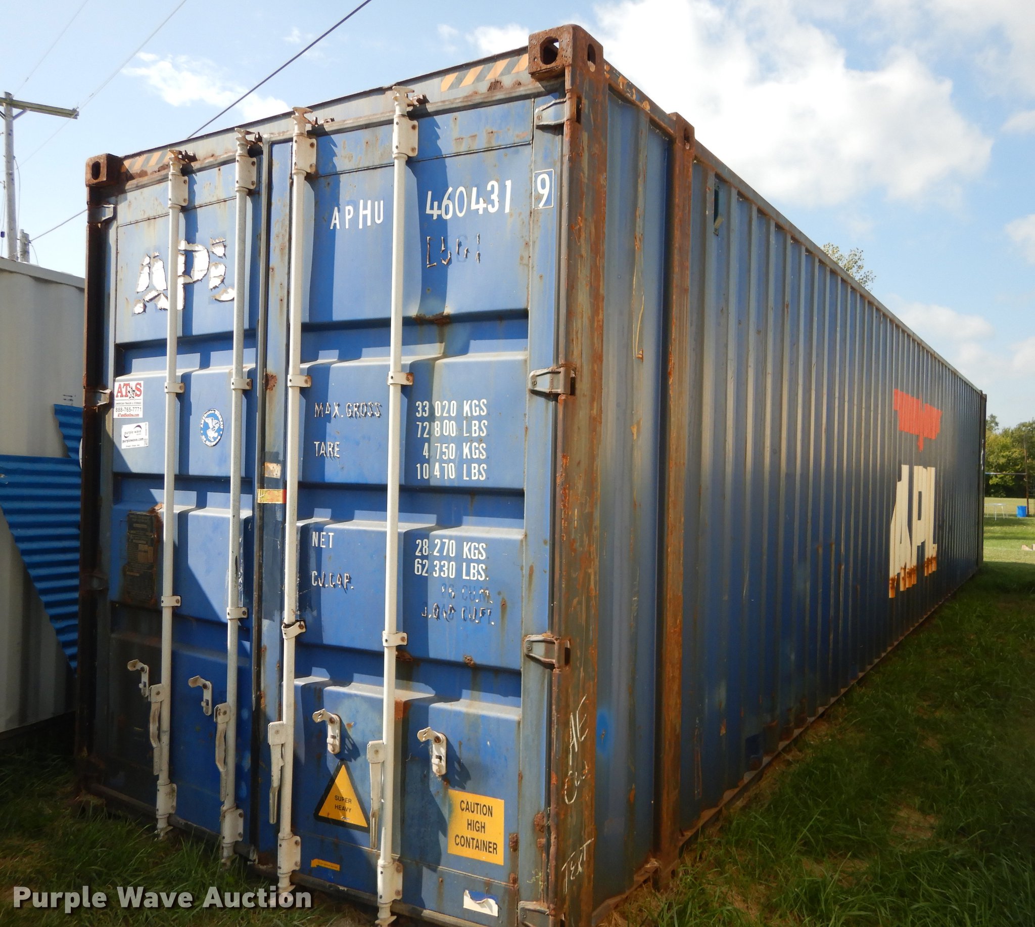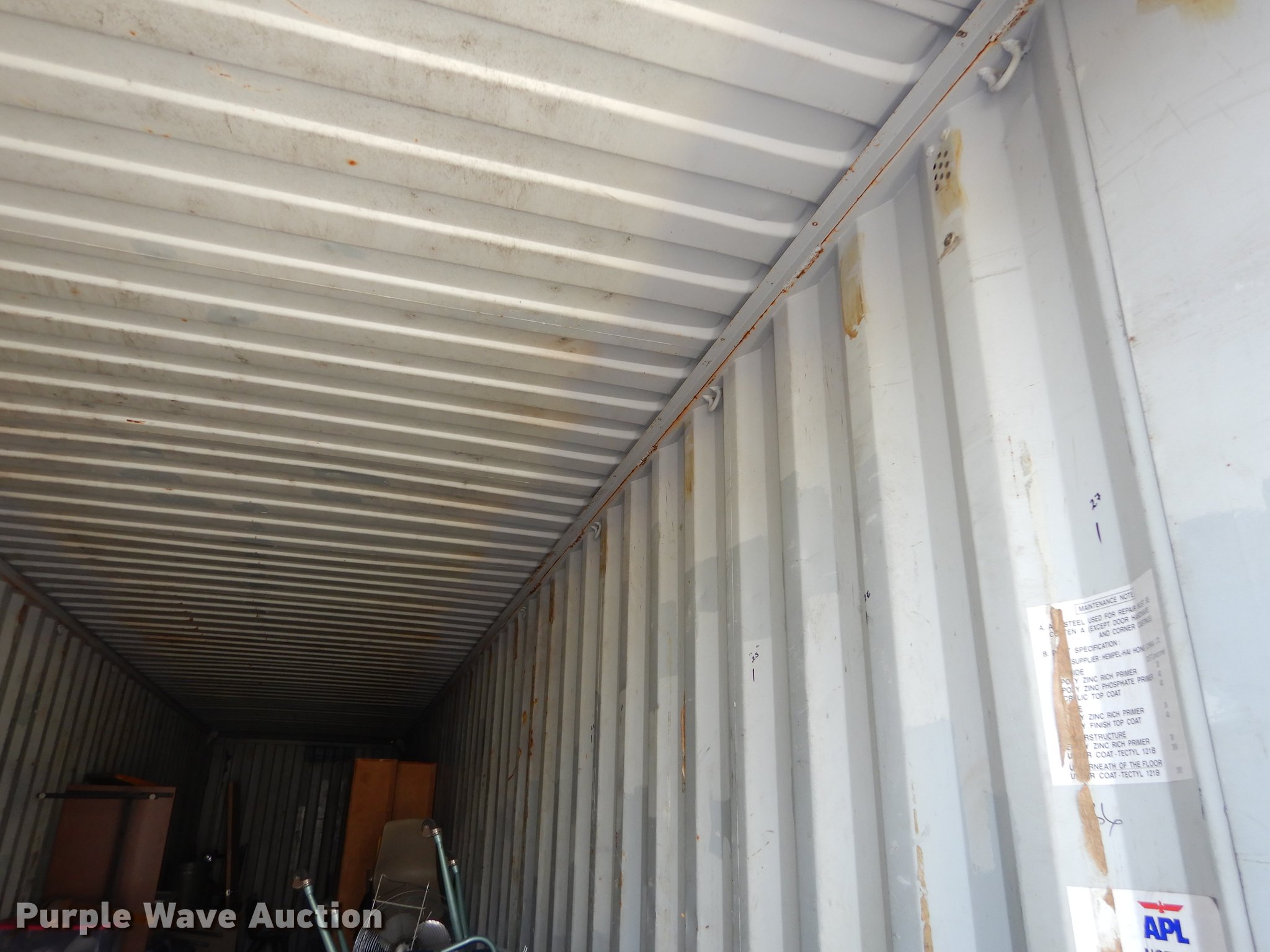Purple Wave is selling a used Storage or Shipping Container in Kansas. This item is a 2004 APL Conex storage container with the following: Type 105AL5, 45'L x 8'W x 112"H O.D., 533"L x 92"W x 106"H I.D., Wood floor, 3,040 interior volume, 72,800 lbs maximum gross weight, 10,470 lbs tare weight, Contents not included