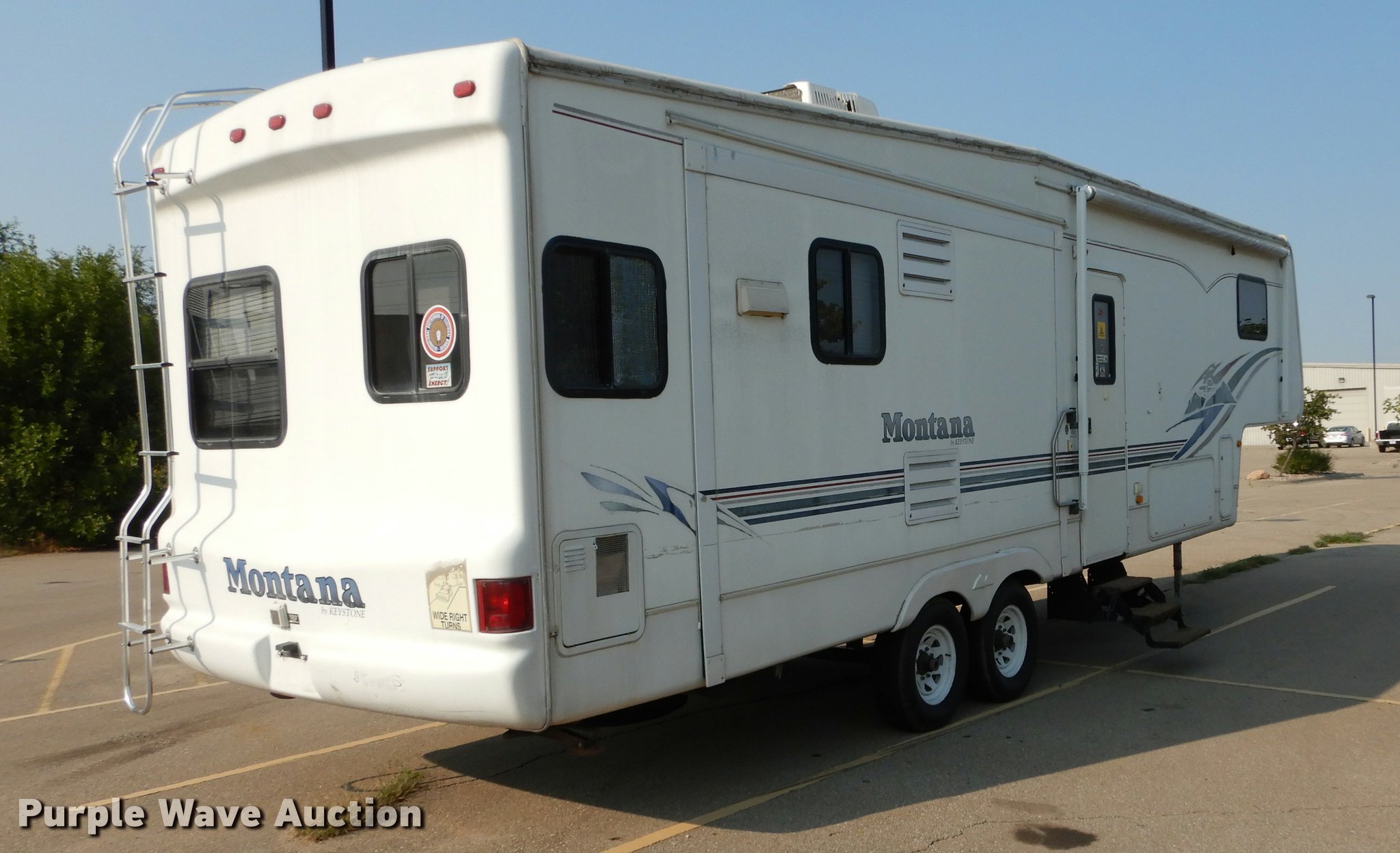 Purple Wave is selling a used RV in Kansas. This item is a 2001 Keystone Montana camper with the following: 35' overall length, (3) slide outs, Canopy, Auxiliary shower, Waste water tank, Sewer outlet, Bedroom, Closet, Storage, Majestic washing machine, Shower, Sink, Toilet, Carpet, Ceiling fan, Main room, Futon, Entertainment center, Recliner, Overhead storage, Kitchen, Stove, Microwave, Island with sink, Refrigerator/freezer, Floor vents, Duo Therm control system, Propane connectors, Front jacks, Rear stabilizers, Gooseneck hitch, Tandem axles, 235/80R16 tires, GVWR 14,440 lbs, GAWR 6,000 lbs
