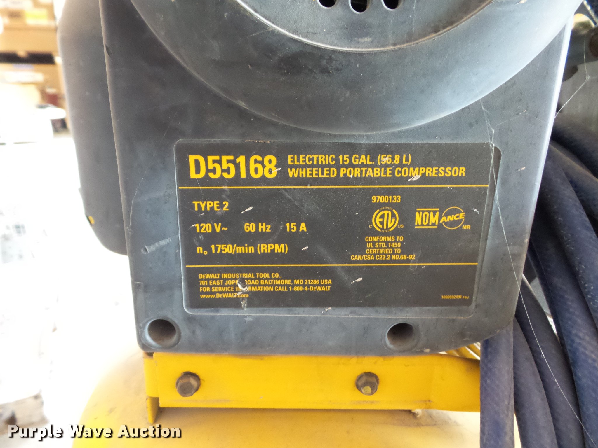 Purple Wave is selling a used Air Compressor in Missouri. This item is a DeWalt air compressor with the following: 15 gallon, 1.8 HP, 200 psi max, 120V