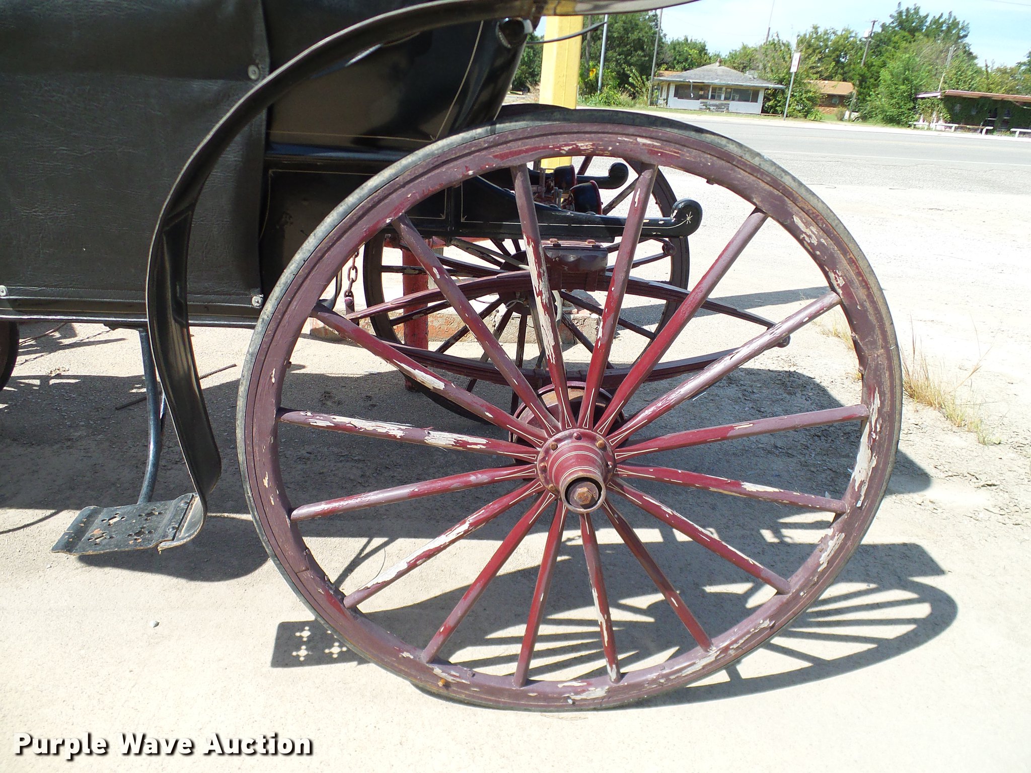 Purple Wave is selling a used Sporting Goods in Oklahoma. This item is a Horse drawn wagon with the following: 56"W, Canvas two passenger cab, Electric lights, Single horse hitch, Spring suspension, Hydraulic brakes, 32" diameter front wheels, 46" diameter rear wheels
