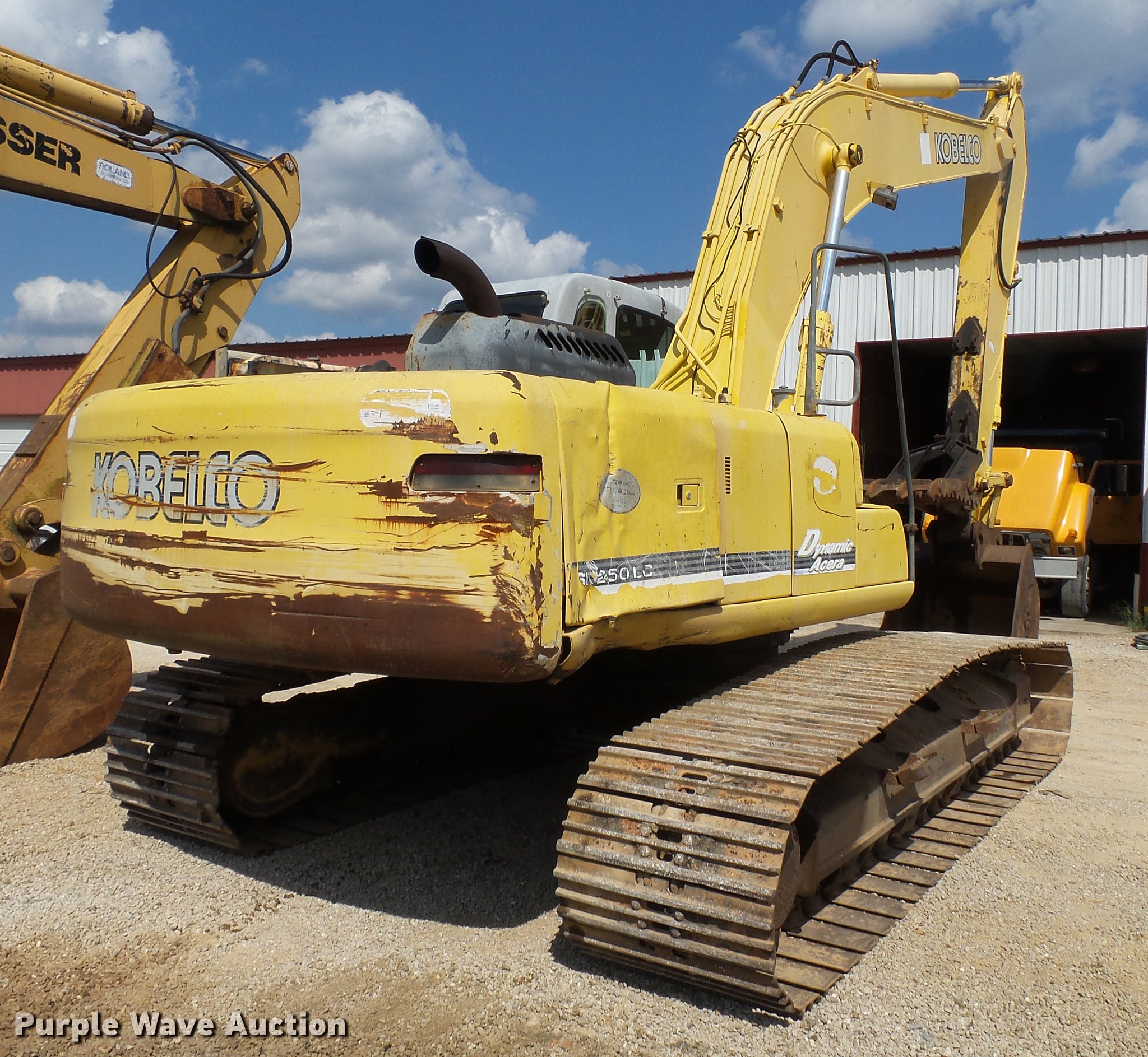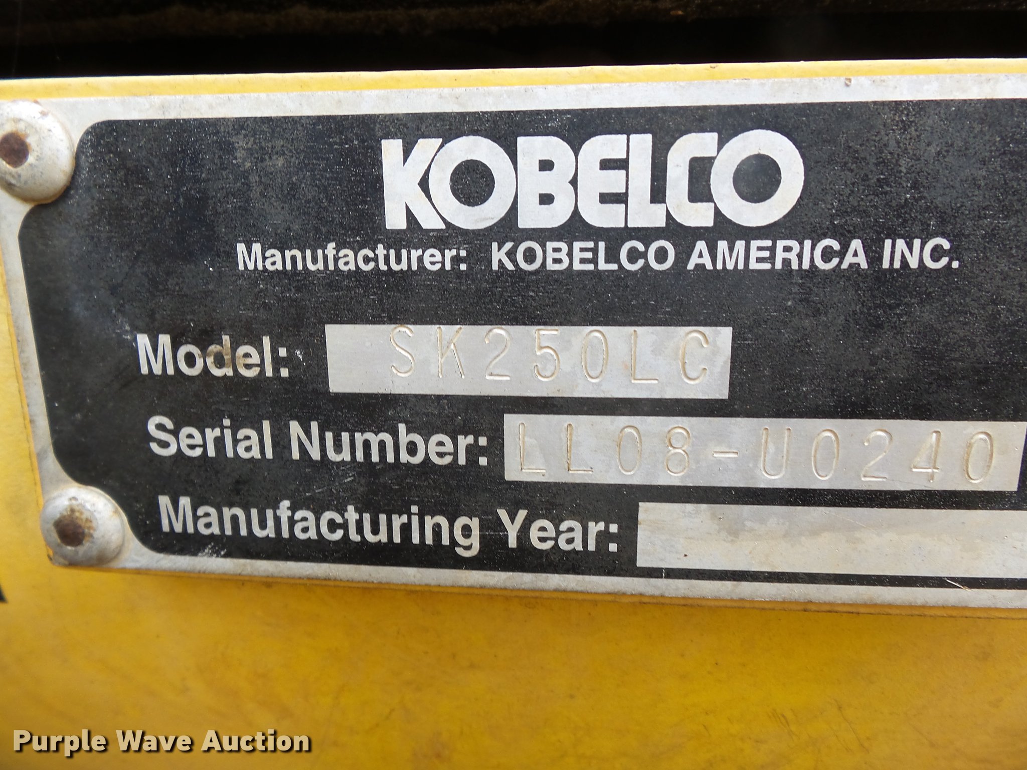 Purple Wave is selling a used Hydraulic Excavator in Missouri. This item is a 2000 Kobelco SK250LC excavator with the following: 9,323 hours on meter, Mitsubishi 6D34-TLEG six cylinder turbo diesel engine, Hydrostatic transmission, EROPS, AC, Suspension seat, Standard boom, 12' stick length, CP 48"W bucket, (6) teeth, Manual thumb, 31.5"W steel triple grouser track pads, Non-operational AC, Serial LL08-U0240