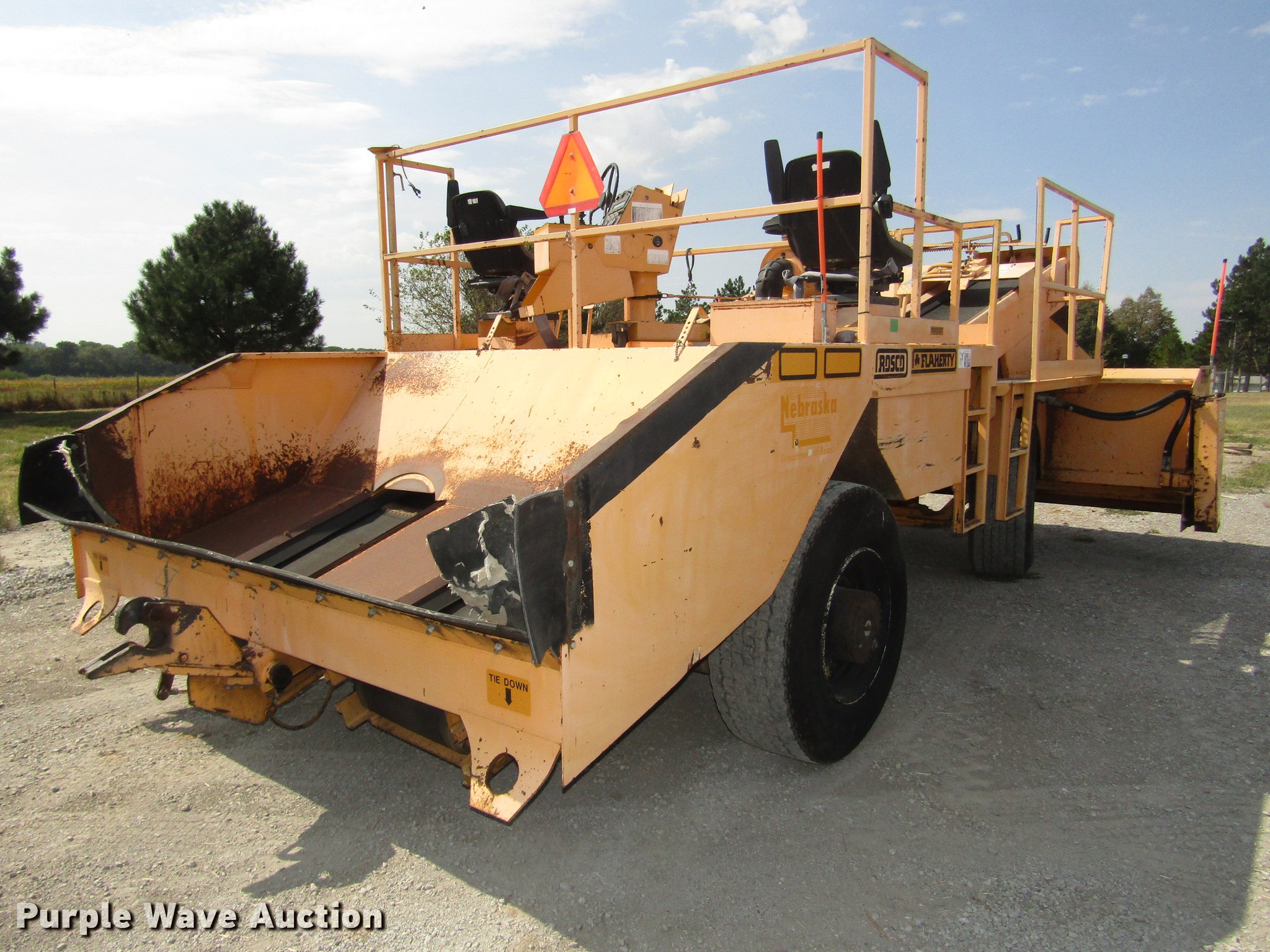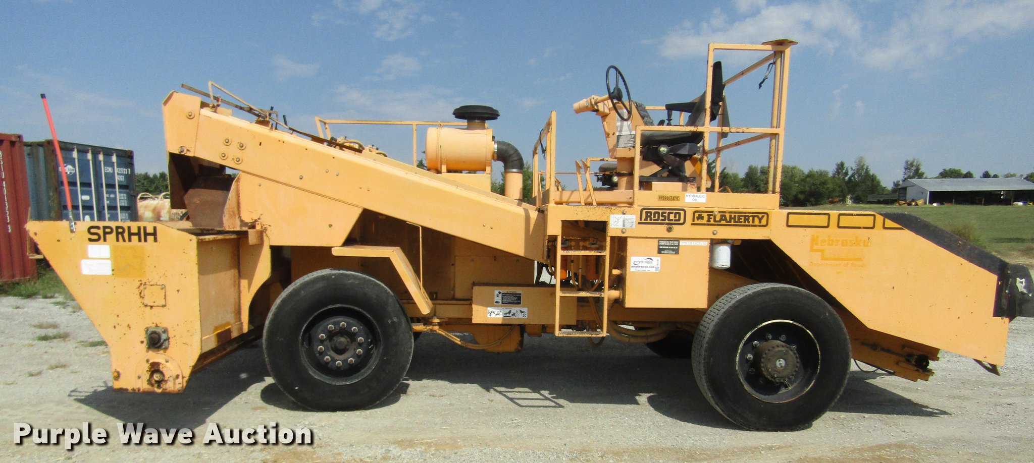 1998 Rosco Flaherty SPR-H-H chip spreader. 1,625 hours on meter, Hours may vary, unit is still in use, Cummins six cylinder turbo diesel engine, Hydrostatic transmission, Dual operator stations, Adjustable steering column, Adjustable steering wheel, Vandal cover, Safety rail, Speed control, Backup alarm, 13.5'W front hopper Rod reject screen, Adjustable cut off gates, (2) conveyor belts Independent controls, 9'3" I.D. receiving hopper, Hydraulic rear hitch, 385/65R22.5 tires, Approximately 15,200 lbs. base operating weight, Serial 35838. Big A Construction. 6821 SW 12th St. Lincoln, NE 68523
