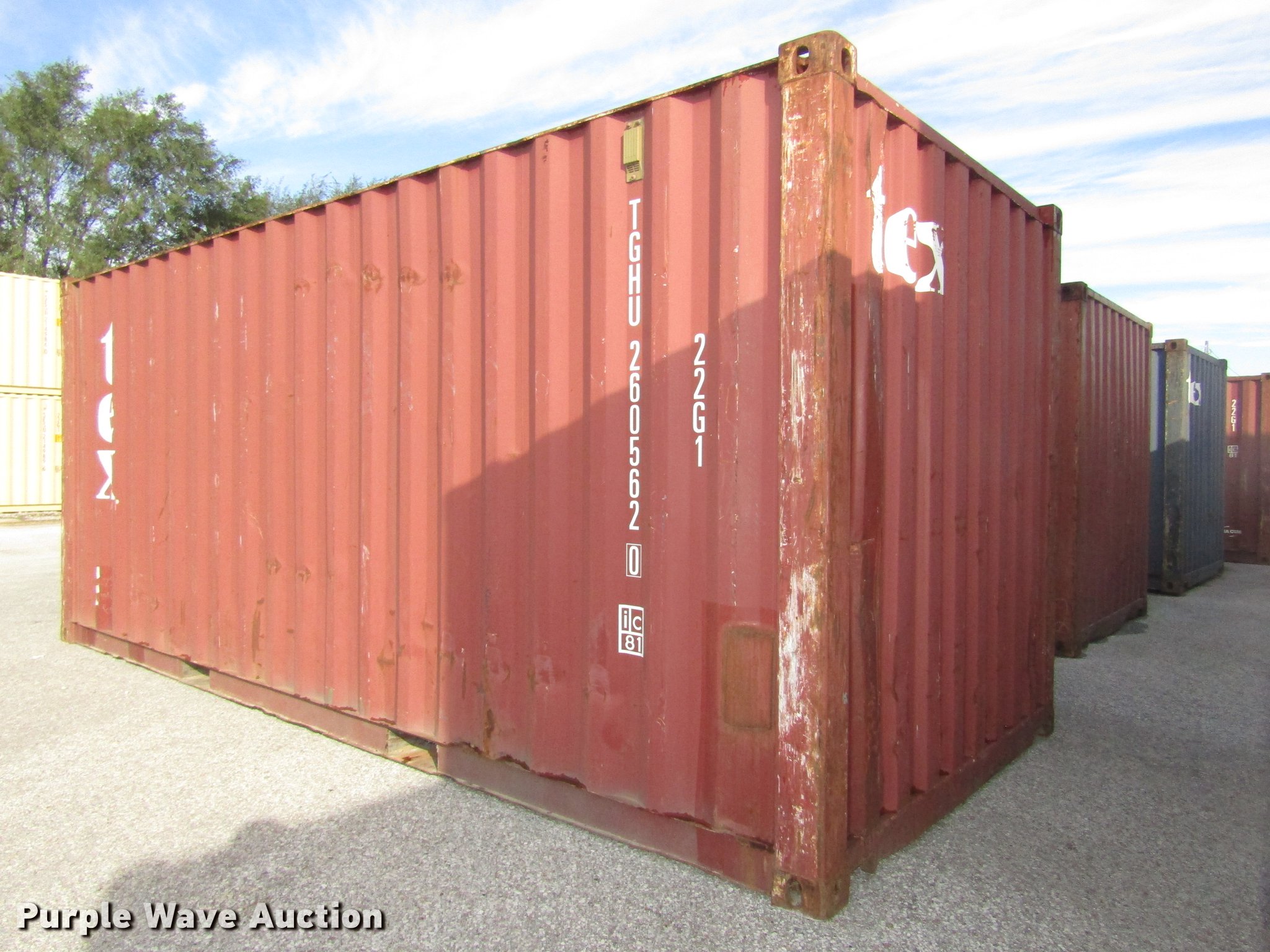Purple Wave is selling a used Storage or Shipping Container in Nebraska. This item is a 2003 Textainer container with the following: Approx. 20'L x 8'W x 8.5'H O.D., Approx. 19.5'L x 92"W x 94"H I.D., 67,200 lbs max gross weight, Lifting eyes, Fork pockets, Serial TGHU2605620